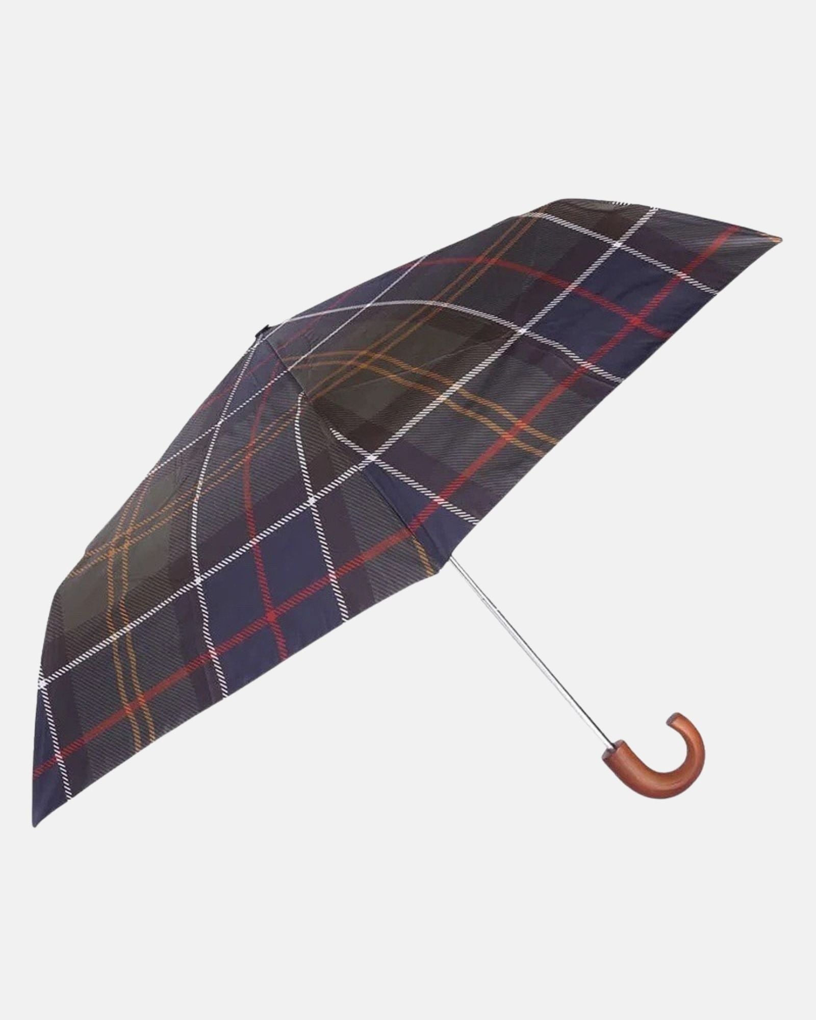 Ombrello ripieghevole Barbour in fantasia tartan con manico in legno logato.