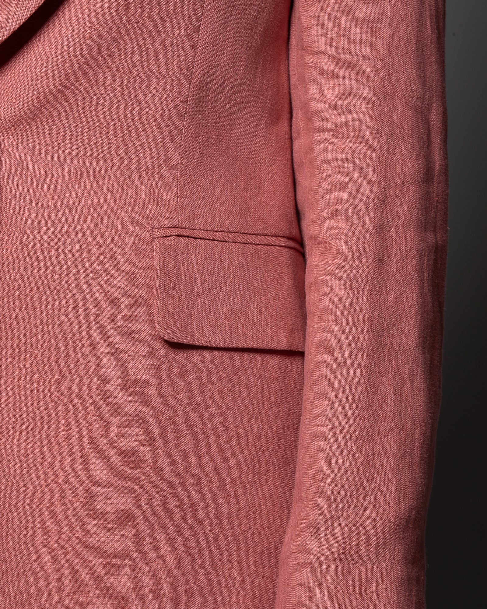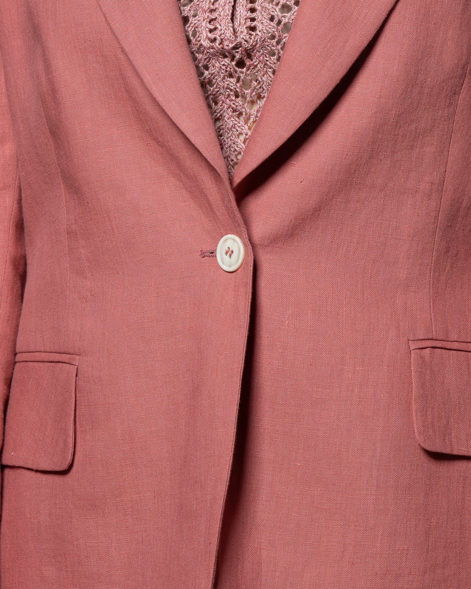 Realizzato in Italia, questo modello esprime perfettamente la visione di Eleventy: uno stile sobrio, evoluto, fondato sulla qualità dei materiali e su una manifattura che valorizza il savoir-faire italiano. La chiusura a due bottoni e il doppio spacco laterale accompagnano la figura con equilibrio, mentre la texture naturale del lino garantisce traspirabilità e comfort anche nelle giornate più calde. La tintura in pezza dona profondità cromatica e leggere sfumature, rendendo ogni capo ancora più ricco di carattere. Perfetto sia come pezzo singolo sia in coordinato con il pantalone abbinato, per un completo femminile e disinvolto.