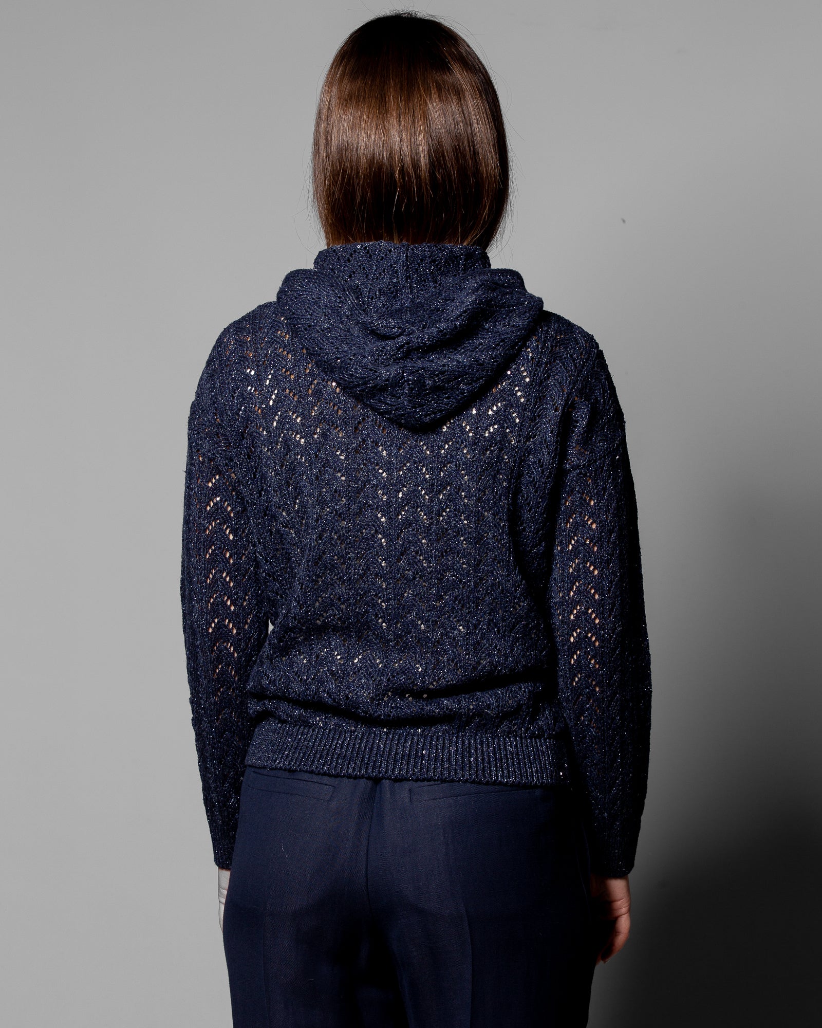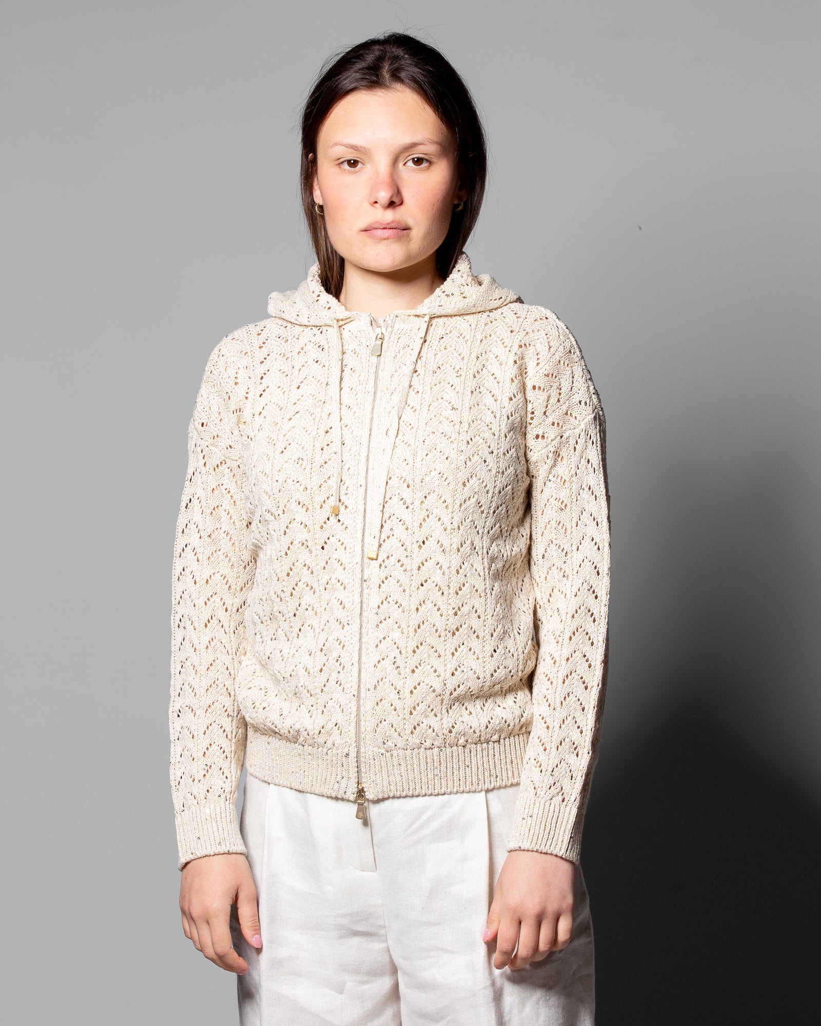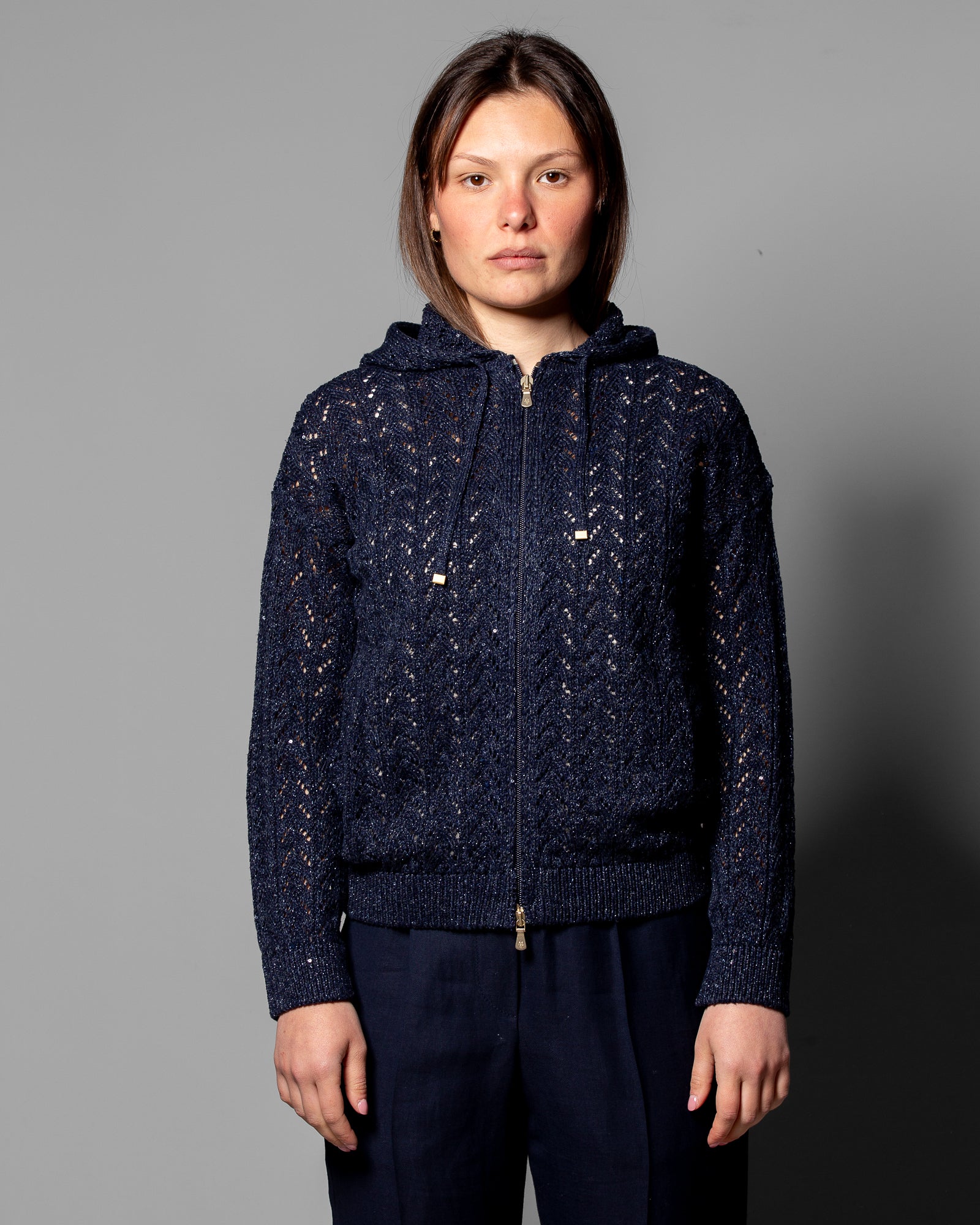 La maglieria Eleventy si distingue per l’attenzione ai filati e alla costruzione: il blend di lino, cotone e seta garantisce freschezza, leggerezza e una mano estremamente piacevole. Il punto maglia, ricercato e distintivo, definisce una struttura che segue la silhouette con naturalezza. Il cappuccio e la chiusura con zip aggiungono una dimensione più dinamica e contemporanea, rendendo il capo ideale per la mezza stagione e perfetto per abbinamenti versatili, dal quotidiano a contesti più curati.