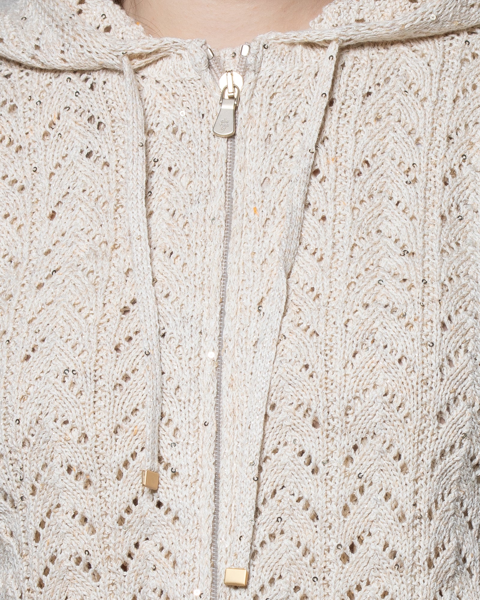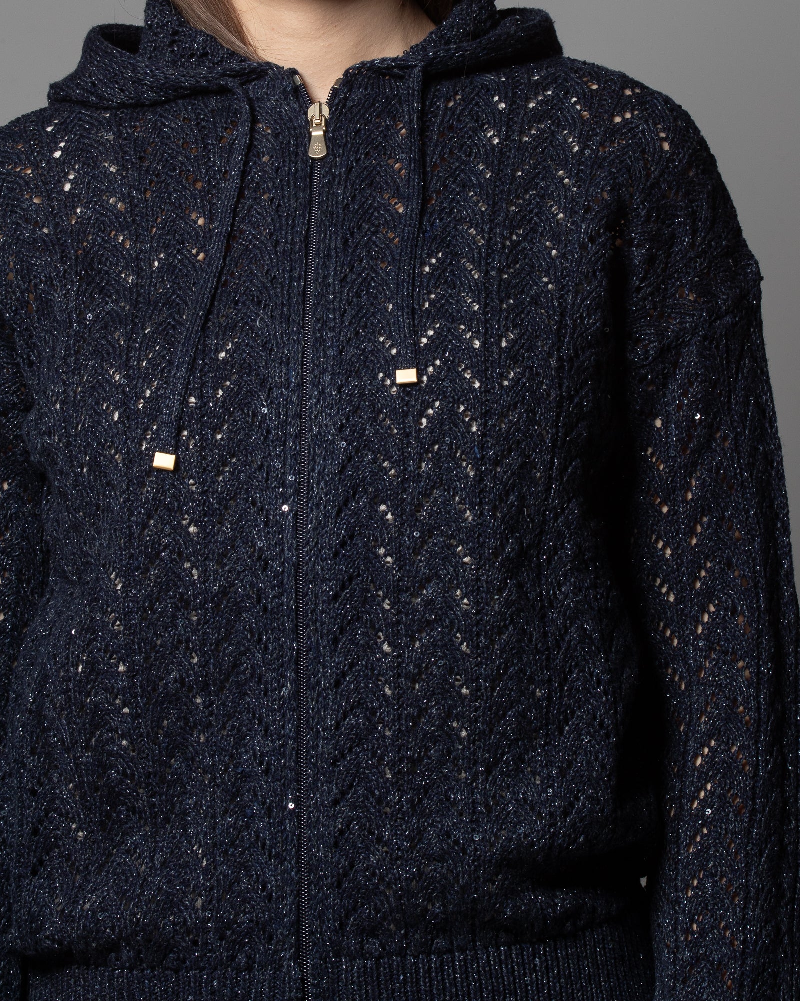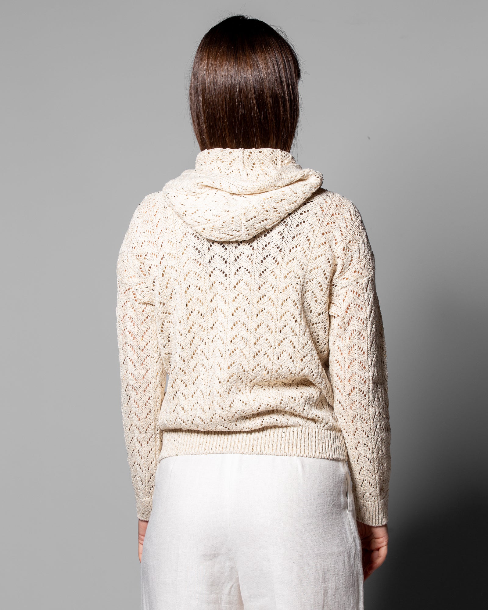 La maglieria Eleventy si distingue per l’attenzione ai filati e alla costruzione: il blend di lino, cotone e seta garantisce freschezza, leggerezza e una mano estremamente piacevole. Il punto maglia, ricercato e distintivo, definisce una struttura che segue la silhouette con naturalezza. Il cappuccio e la chiusura con zip aggiungono una dimensione più dinamica e contemporanea, rendendo il capo ideale per la mezza stagione e perfetto per abbinamenti versatili, dal quotidiano a contesti più curati.