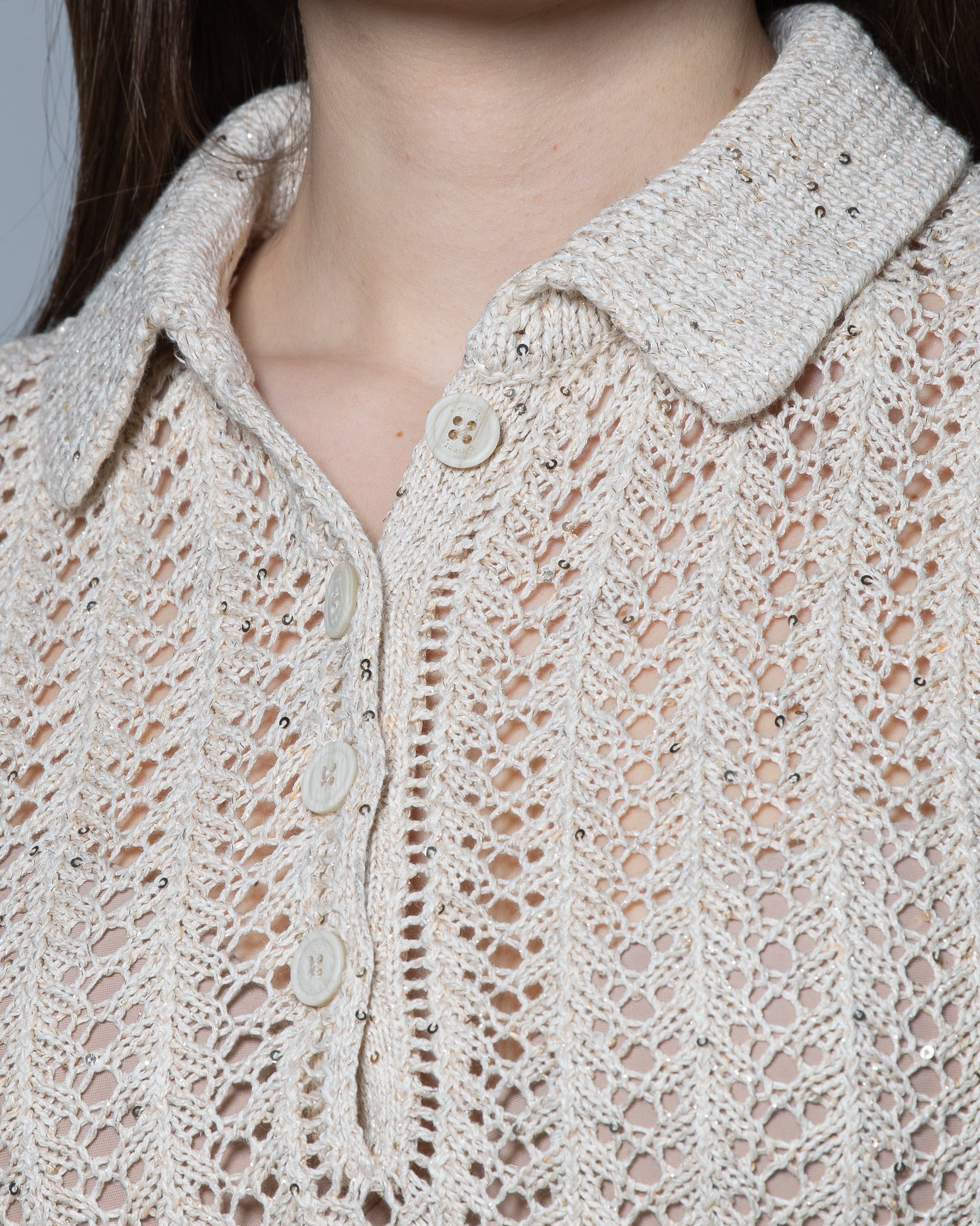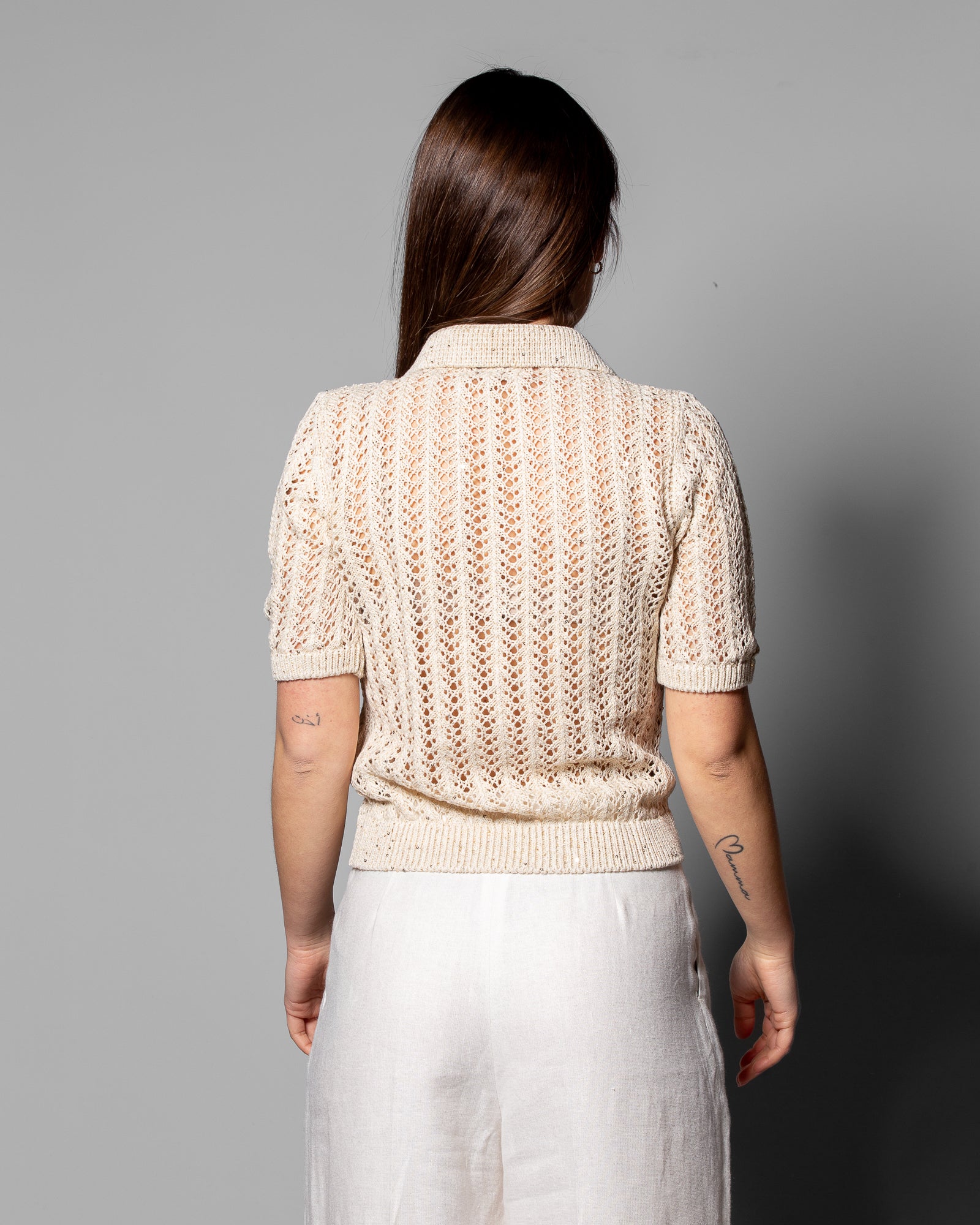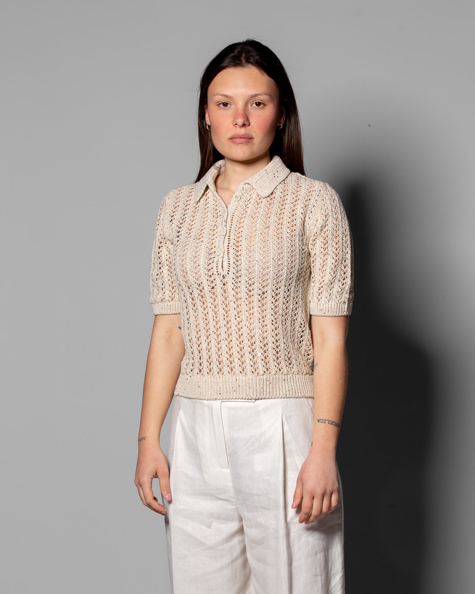 Un’eleganza discreta prende forma in questa polo Eleventy in maglia traforata, realizzata nello stesso filato naturale che unisce lino, cotone e seta. La lavorazione aperta crea una superficie vibrante, capace di riflettere la luce con delicatezza e dare movimento al capo.