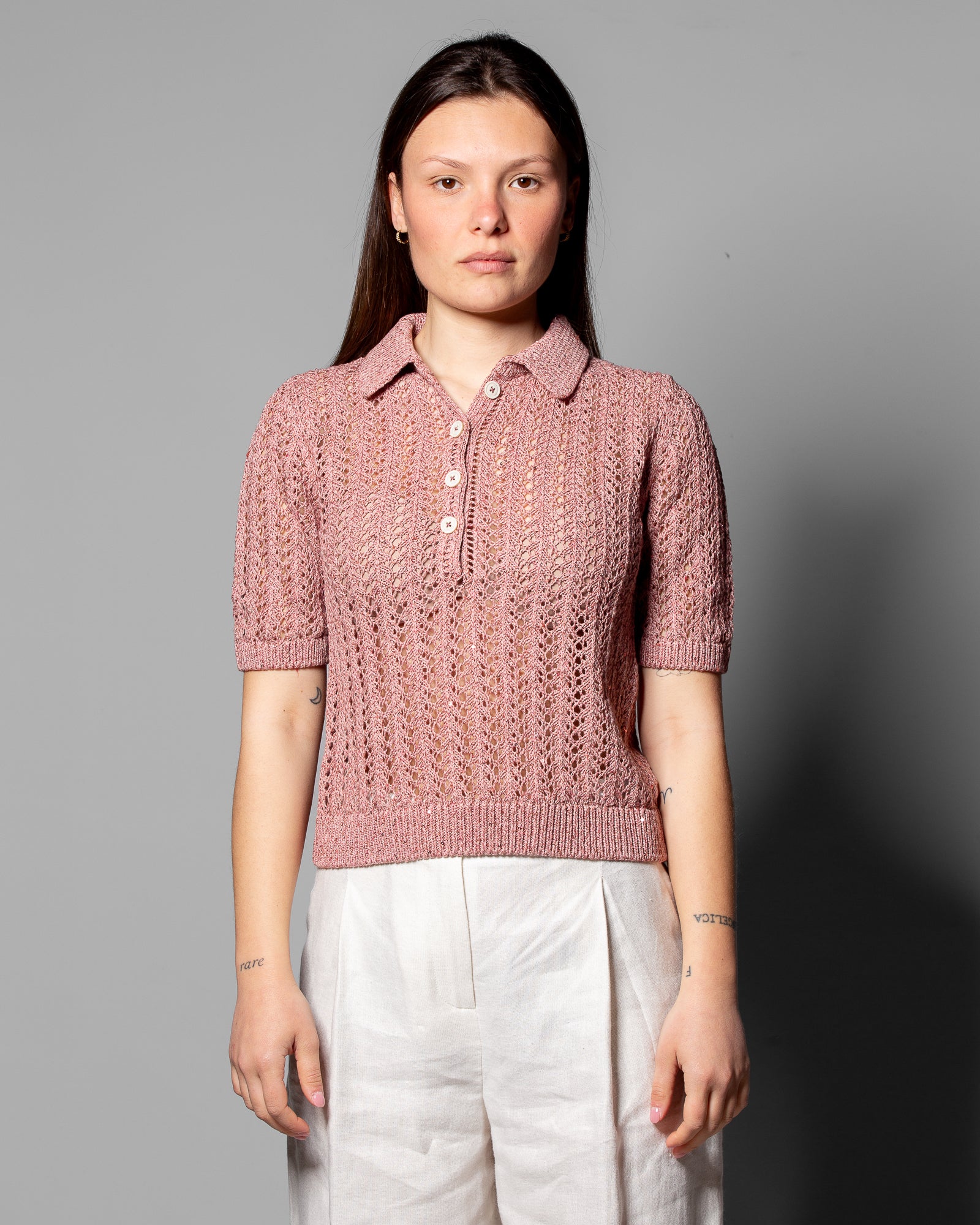 Il design si arricchisce del colletto classico e della chiusura con bottoni, che introducono un accento più definito e versatile. Le maniche corte e la struttura leggera rendono questa polo perfetta per la stagione più calda, mantenendo sempre un equilibrio raffinato tra comfort e ricerca stilistica. Ideale da abbinare ai capi coordinati della stessa linea per un abbinamento armonico e contemporaneo.