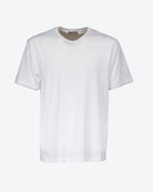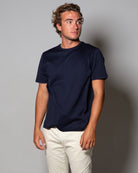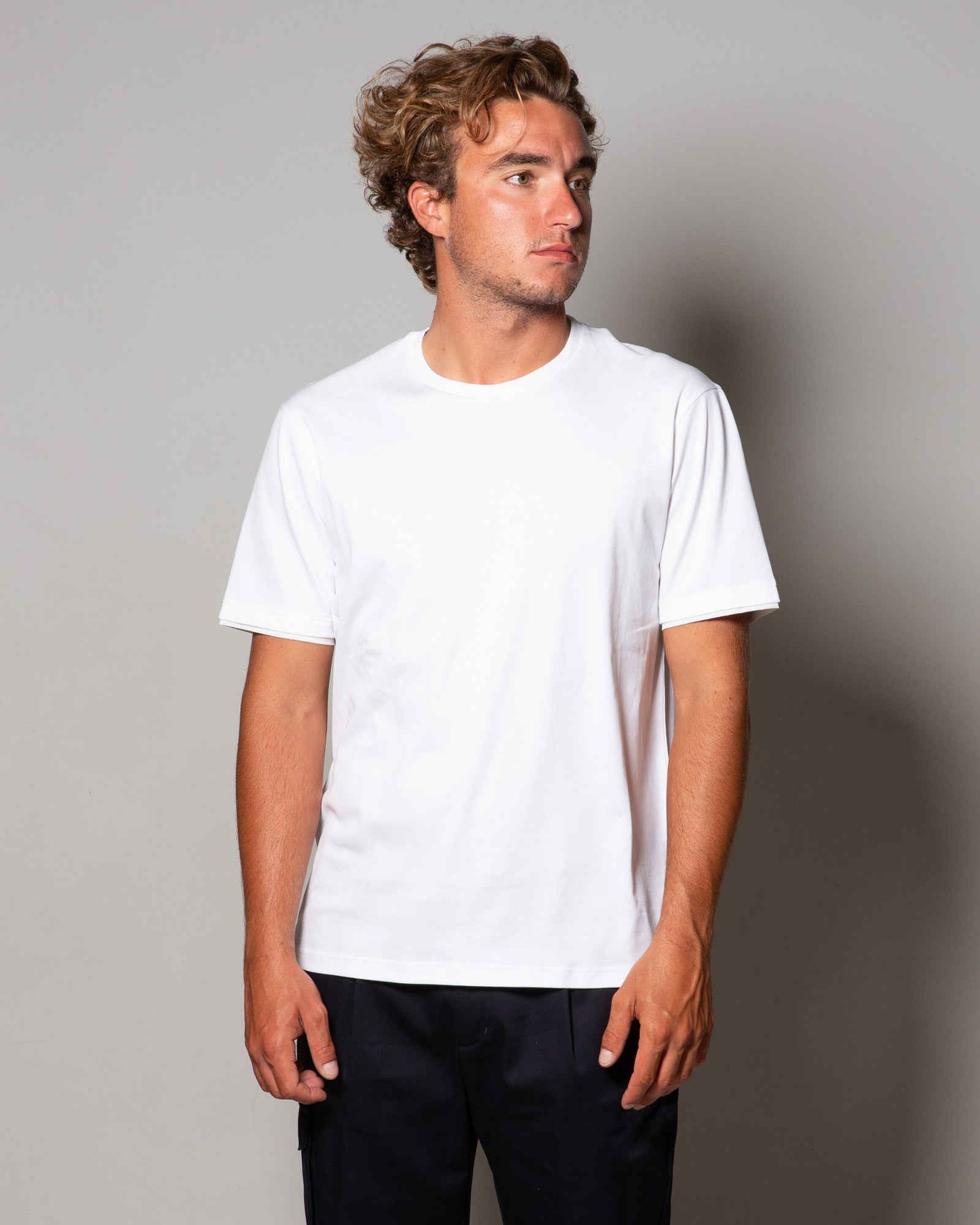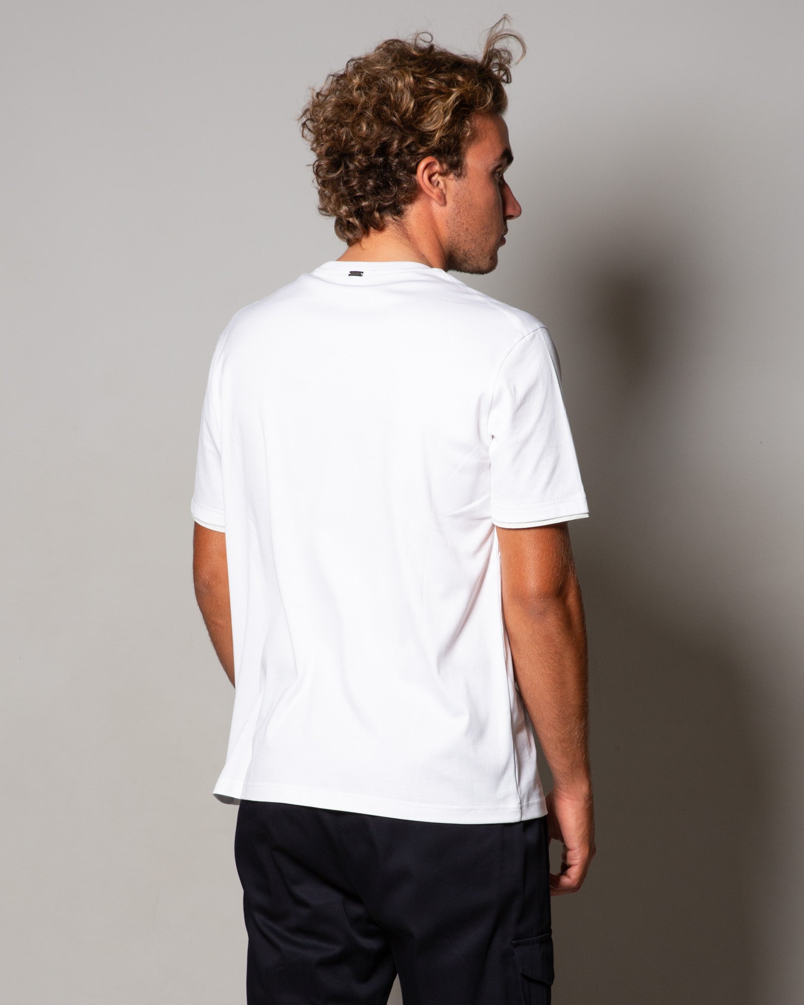 Questa T-shirt Herno rappresenta l’essenza della sobrietà contemporanea. Realizzata in jersey di cotone ultrafine, offre una texture compatta e piacevole al tatto, valorizzata da discreti inserti in nylon stretch che ne accentuano la flessibilità e la struttura.