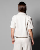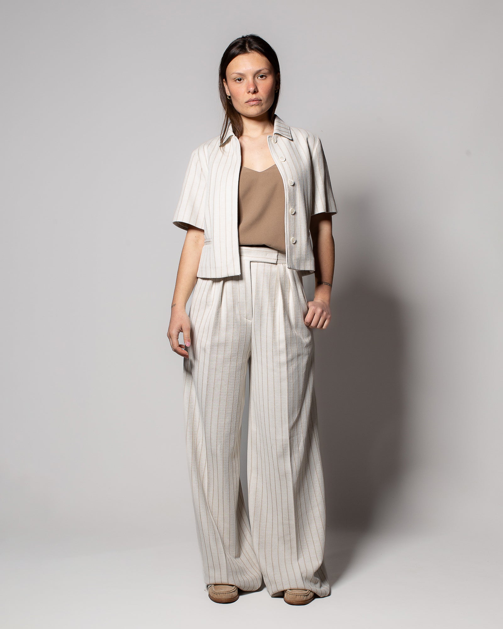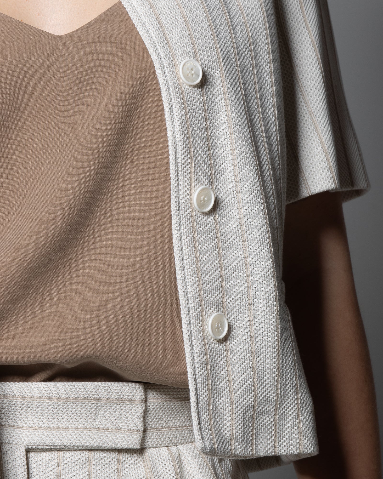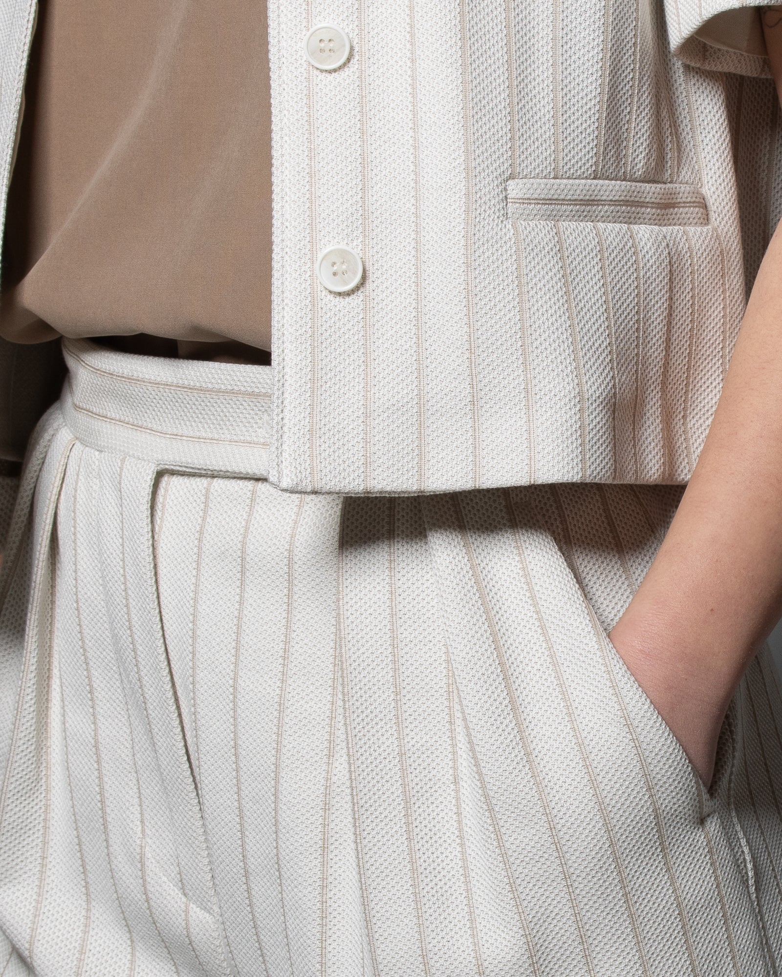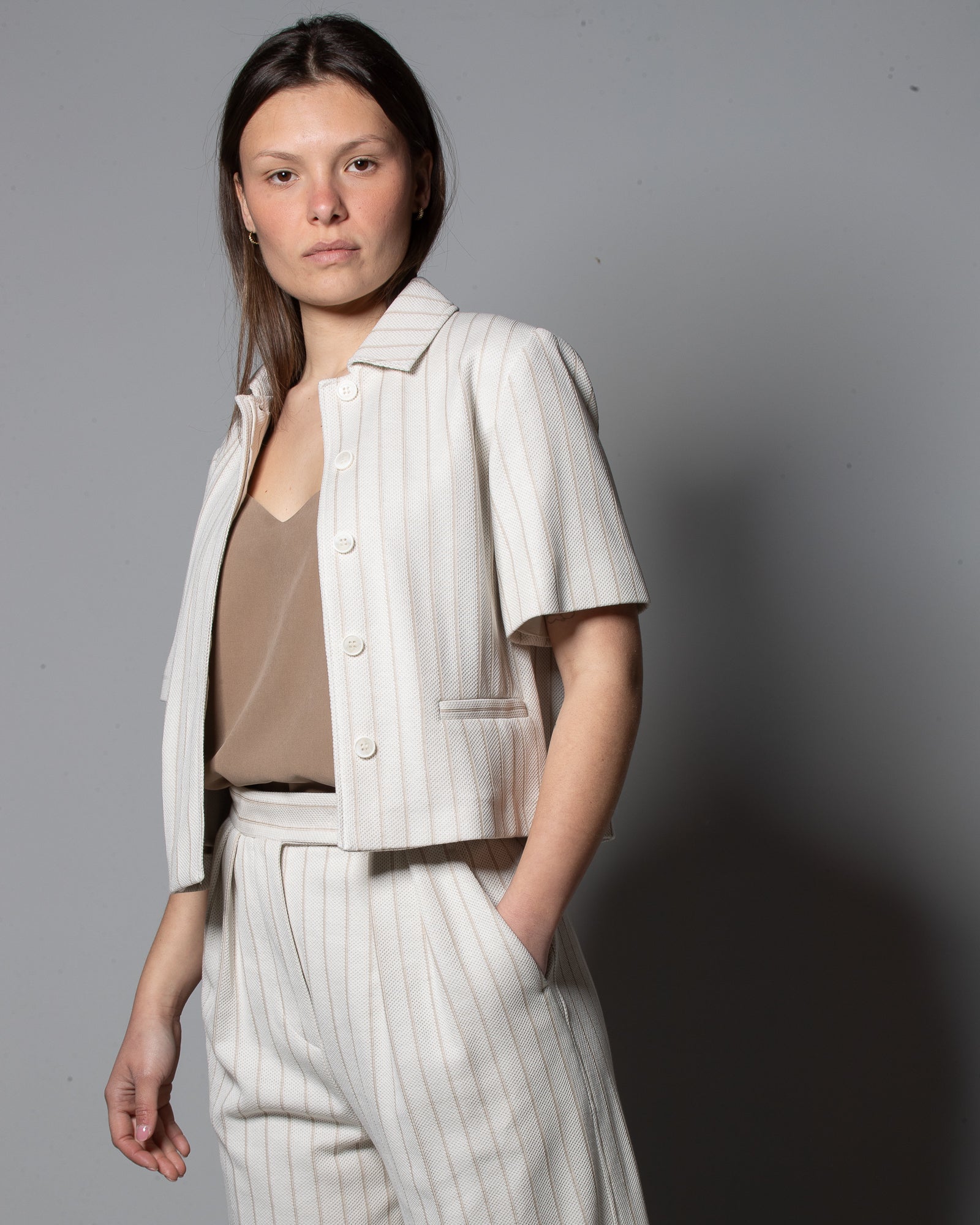 La giacca corta Max Mara in jersey piqué di cotone gessato reinterpreta il linguaggio sartoriale con un’attitudine contemporanea e rilassata. Il motivo gessato, discreto ed elegante, incontra una costruzione ispirata alla camicia, dando vita a un capo essenziale ma ricco di carattere. La linea boxy dona volume e modernità, mentre il colletto classico e la chiusura frontale nascosta mantengono un’estetica pulita e sofisticata.