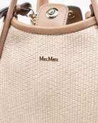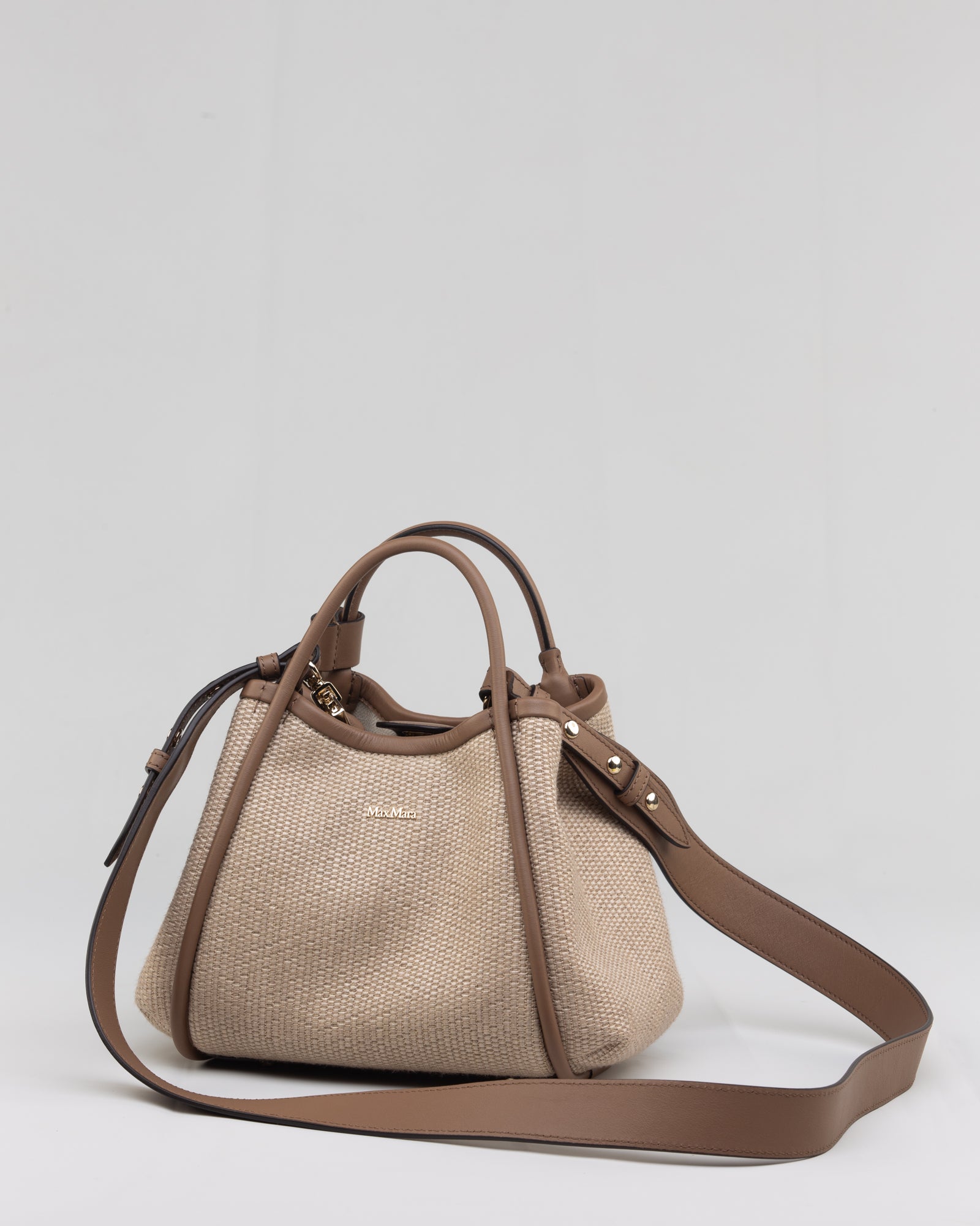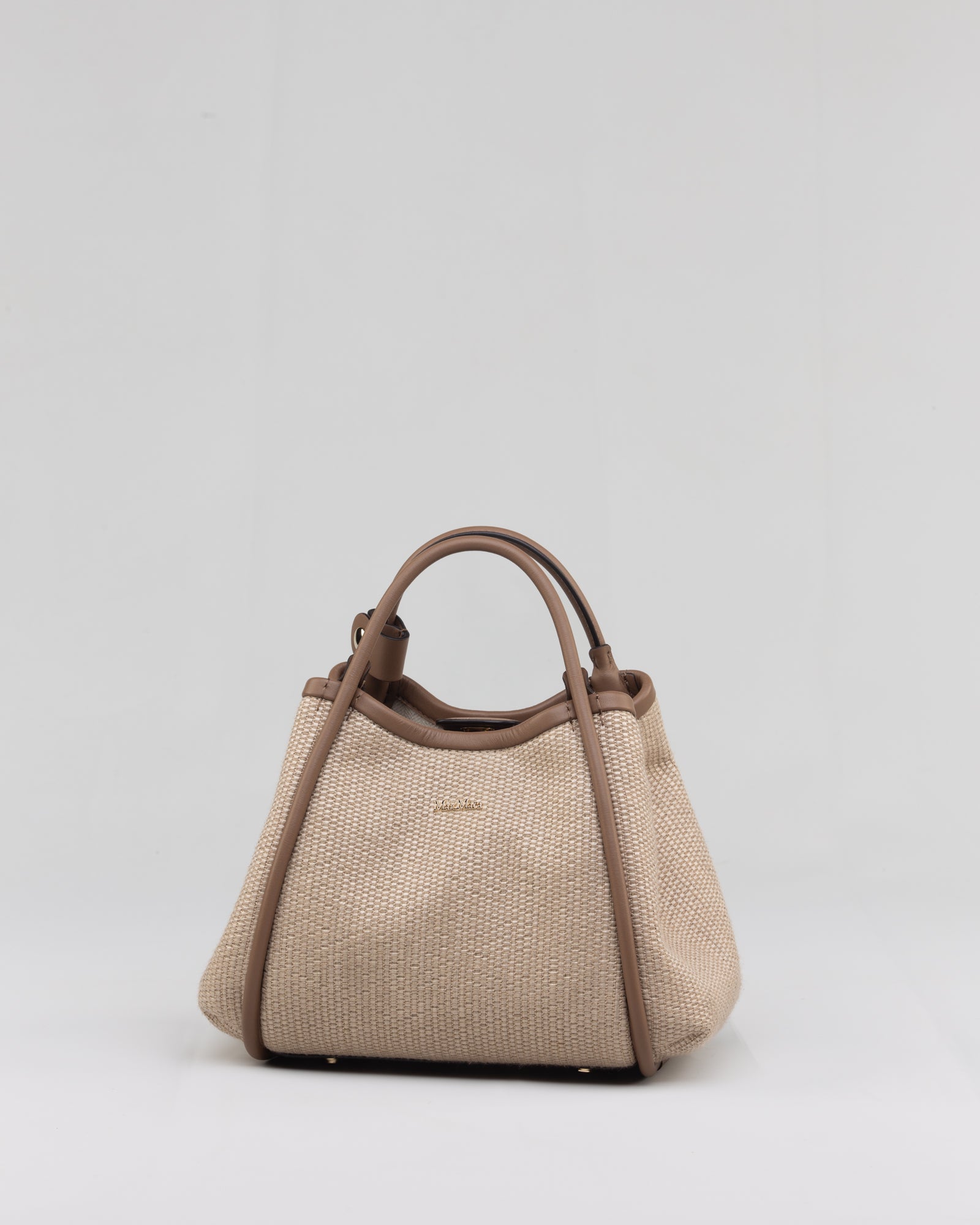 Il tessuto effetto rafia dona leggerezza visiva e una texture materica, mentre i dettagli in pelle definiscono la struttura con precisione. I manici tubolari, fissati da un braccialetto con bottone a pressione, aggiungono un elemento distintivo, mentre la tracolla regolabile e removibile offre una doppia portabilità. L’interno in cotone e lino è organizzato con tasche funzionali, mentre la chiusura a calamita e i piedini in metallo completano un design curato e pratico.