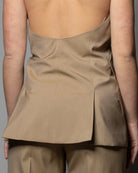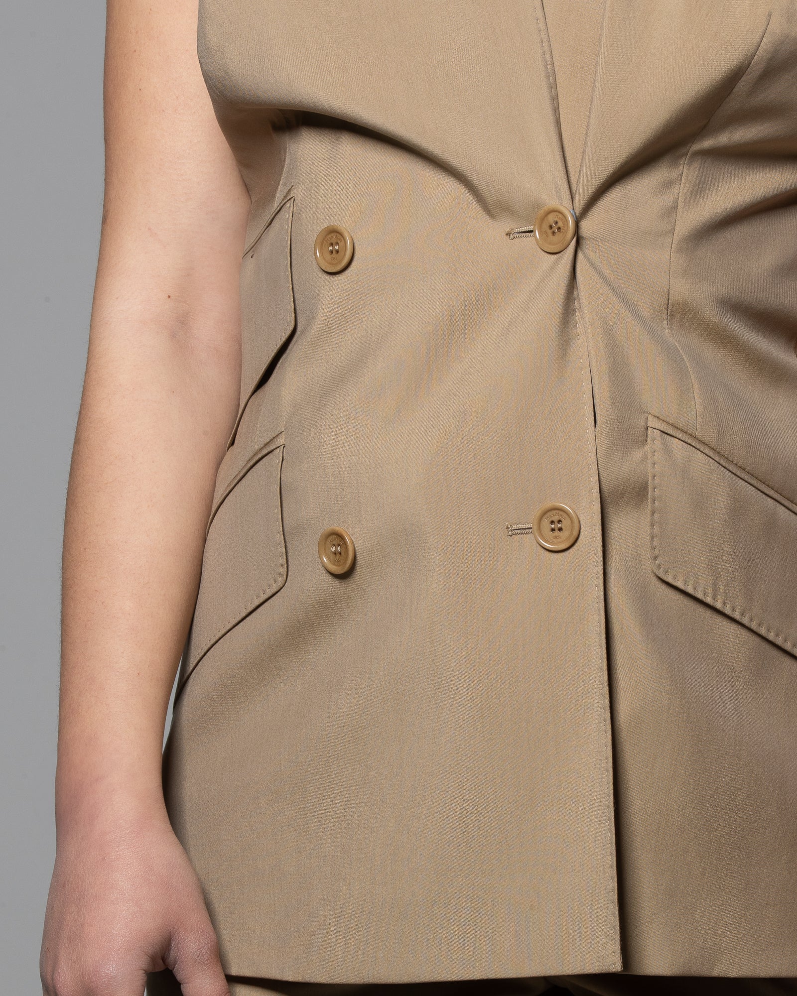 La giacca smanicata Max Mara in popeline di lana e seta reinterpreta la sartorialità classica attraverso una costruzione inaspettata e contemporanea. Il design con schiena scoperta crea un gioco di volumi e trasparenze sofisticato, mentre lo scollo a giro incrociato sul davanti definisce una linea pulita, essenziale e fortemente distintiva.