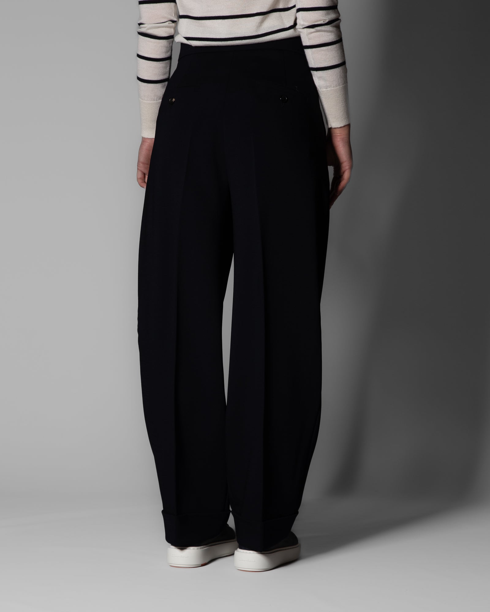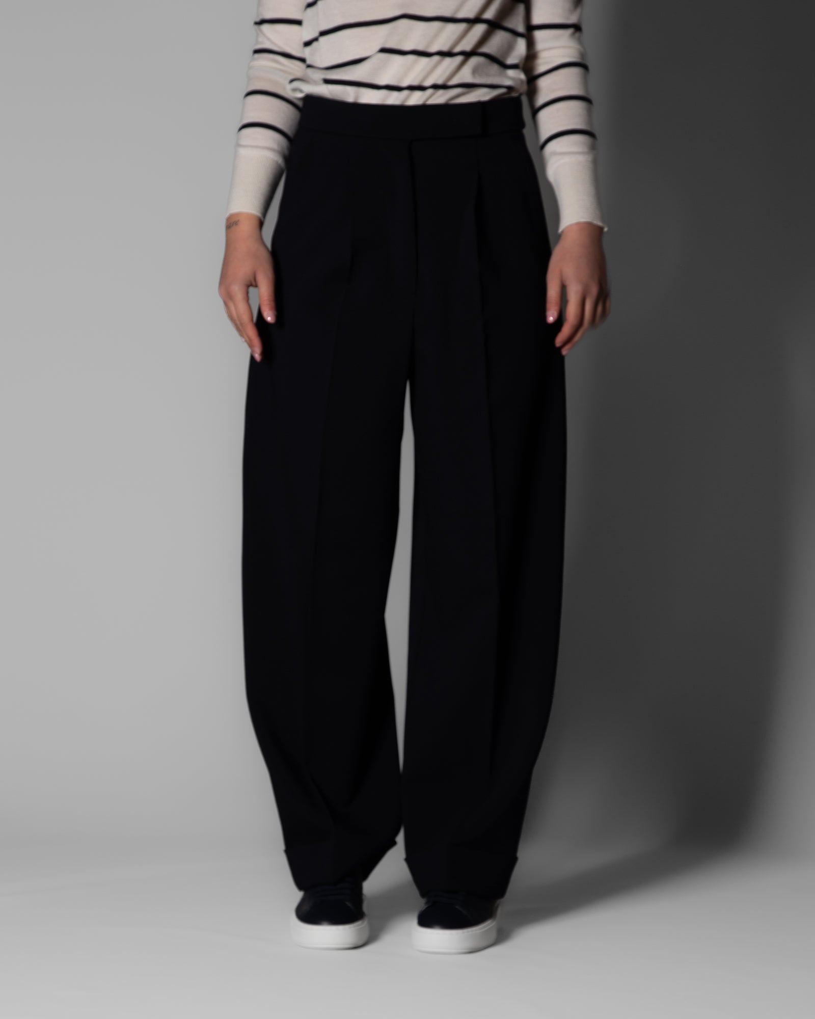 Una nuova interpretazione della sartorialità prende forma nel pantalone balloon Max Mara in lana stretch, dove proporzioni moderne e costruzione impeccabile si incontrano. La silhouette carrot, ampia sui fianchi e più raccolta sul fondo, crea un equilibrio raffinato tra struttura e movimento.