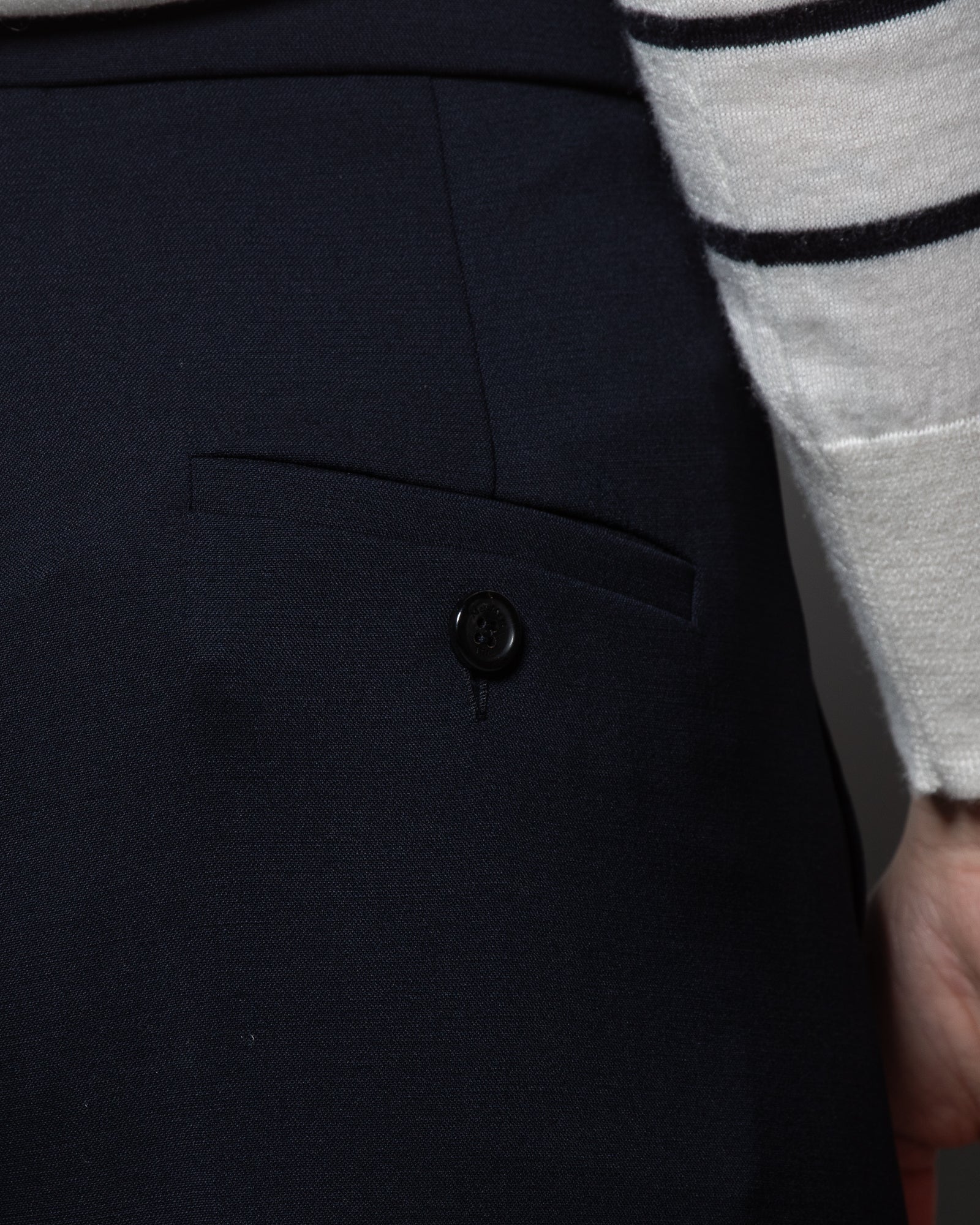 - Tasche alla francese e tasche posteriori a filetto con bottone