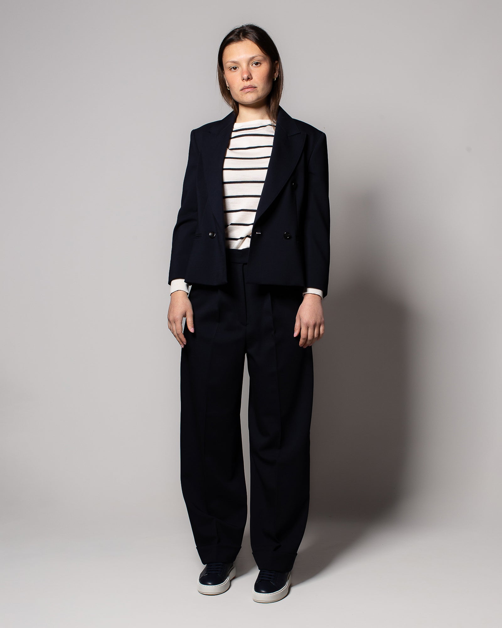 Realizzato in doppia tela di lana, questo modello esprime l’eleganza evoluta di Max Mara, unendo comfort e precisione nei dettagli. La vita alta valorizza la figura, mentre la piega stirata e le pinces richiamano il mondo tailoring. Perfetto in abbinamento al blazer cropped coordinato per un completo sofisticato e contemporaneo, capace di distinguersi con naturalezza.