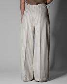 Ispirazione sartoriale e attitudine contemporanea si incontrano nel pantalone Max Mara in jersey piquet di puro cotone, reinterpretazione moderna del classico pantalone maschile. La fantasia gessata dona ritmo e verticalità alla silhouette, esaltando una linea ampia e fluida dal carattere deciso.