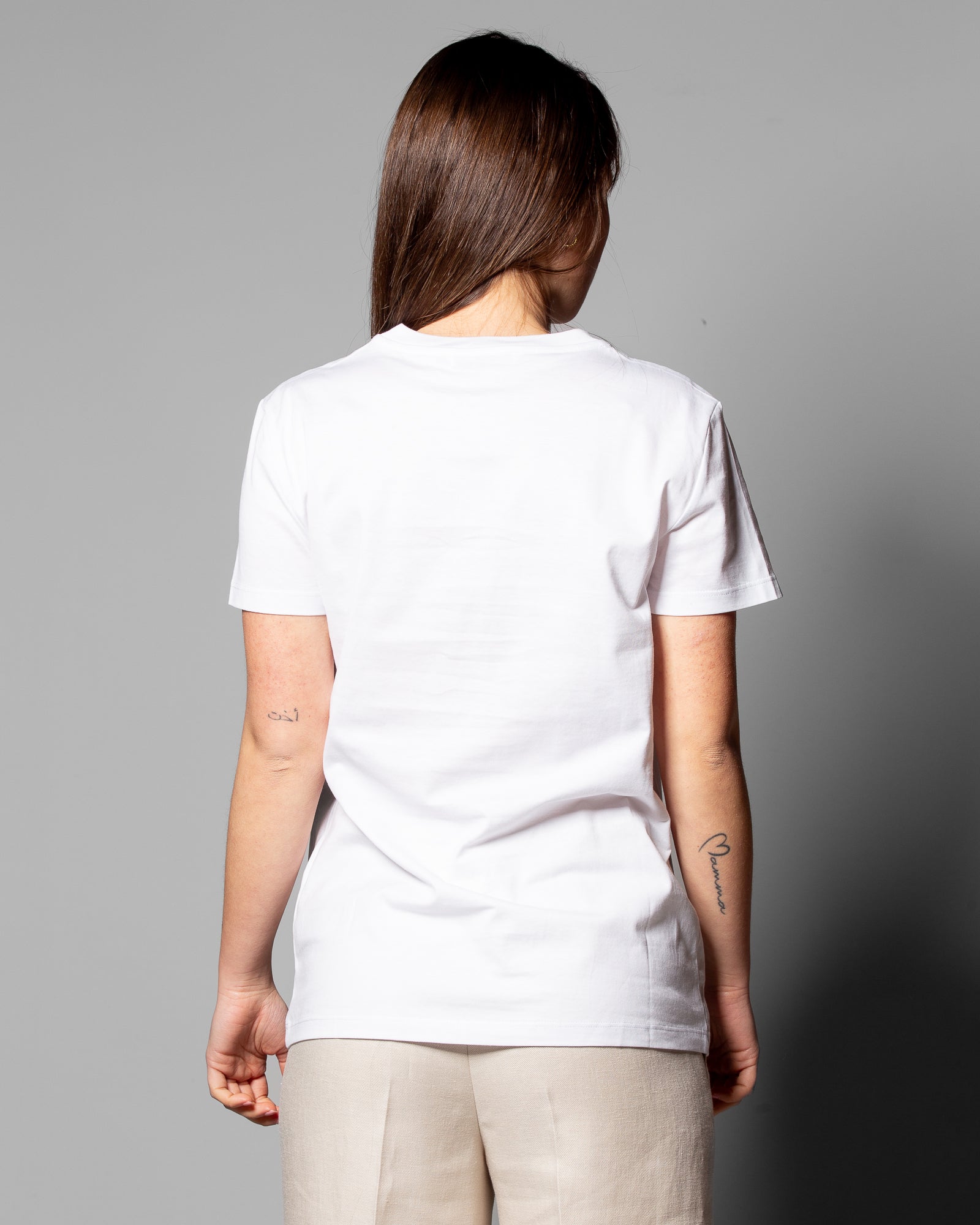 La t-shirt Max Mara in jersey di cotone con ricamo MaxMarabesque reinterpreta il concetto di basic attraverso un segno distintivo raffinato. La linea pulita e la costruzione essenziale vengono valorizzate da un dettaglio ricamato che aggiunge carattere senza appesantire il design.