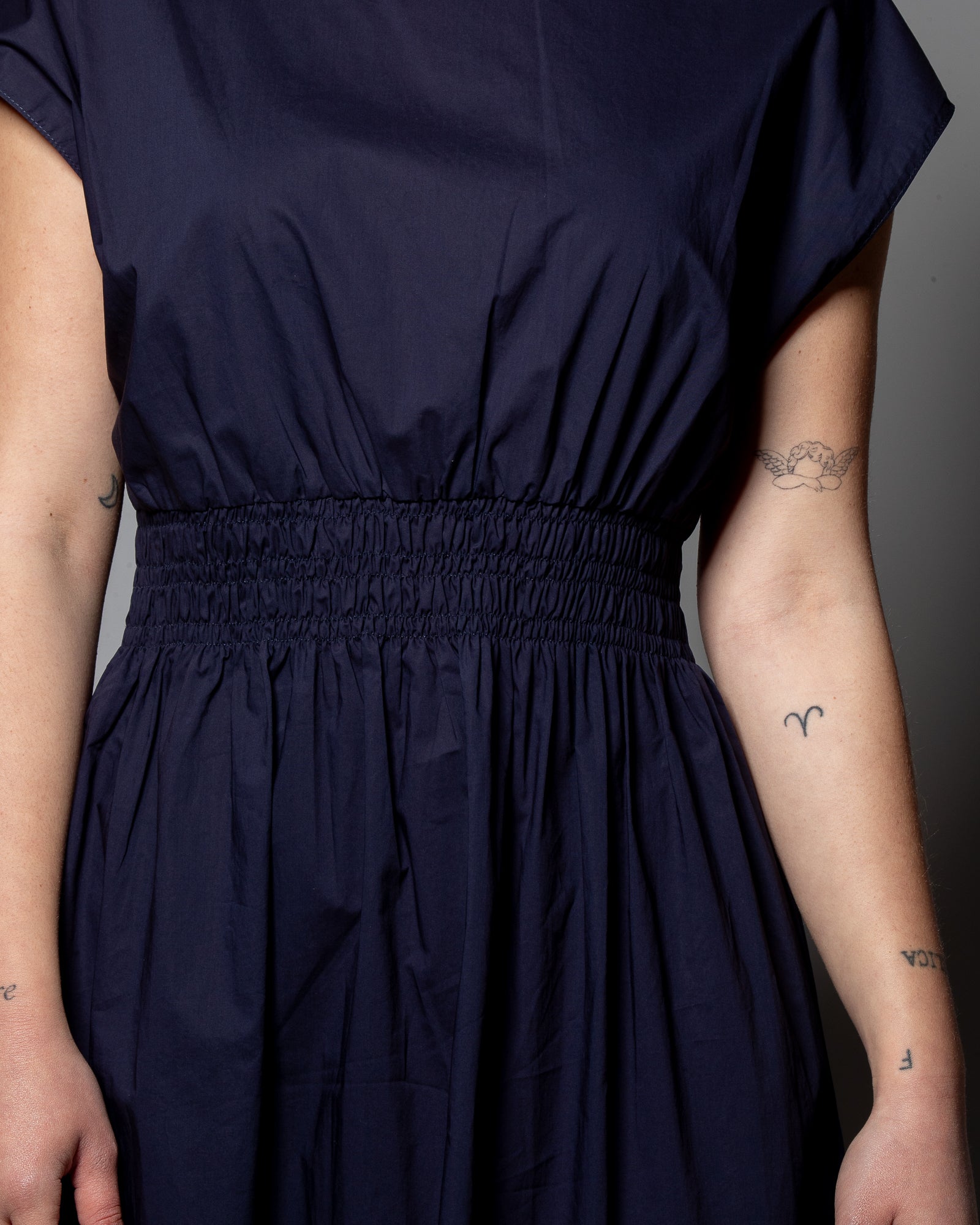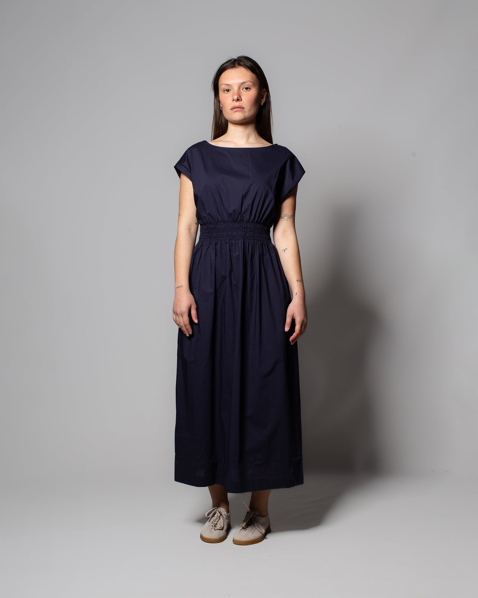 Realizzato in puro cotone, il popeline dona al capo una mano fresca e una struttura leggera, ideale per accompagnare la stagione con eleganza disinvolta. Il design pulito è valorizzato dall’elastico in vita, che definisce la silhouette con equilibrio senza costrizioni, creando un gioco morbido di volumi tra busto e gonna. Le maniche corte e lo scollo ampio completano un’estetica essenziale, perfetta per abbinamenti versatili, dal quotidiano ai momenti più rilassati. Roberto Collina conferma ancora una volta la propria attenzione alla qualità e alla produzione Made in Italy.