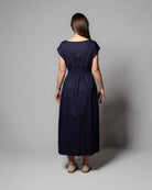 Linee essenziali e femminilità naturale definiscono l’abito Roberto Collina in popeline di cotone, una proposta raffinata che unisce semplicità e ricerca materica.
