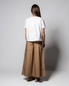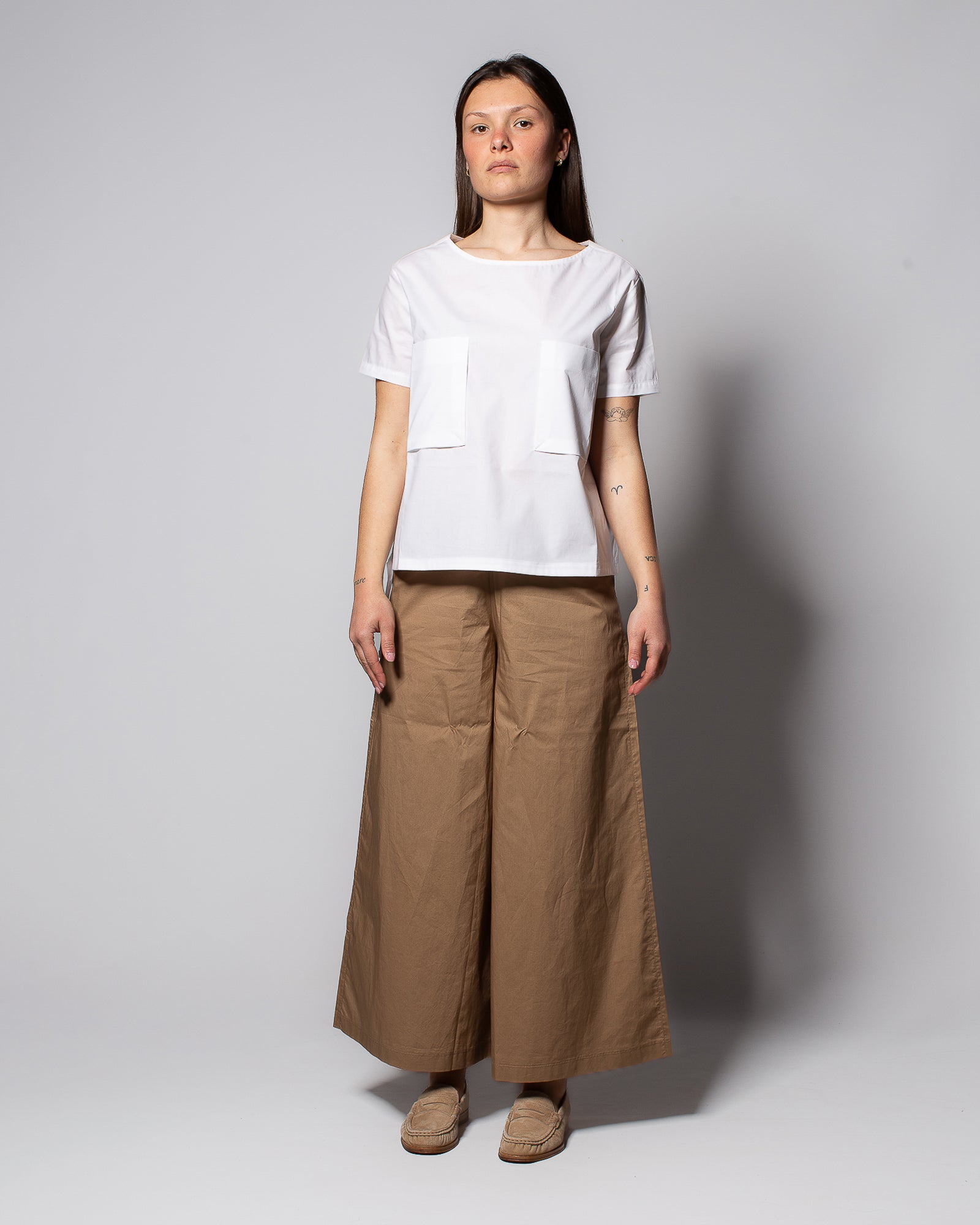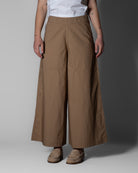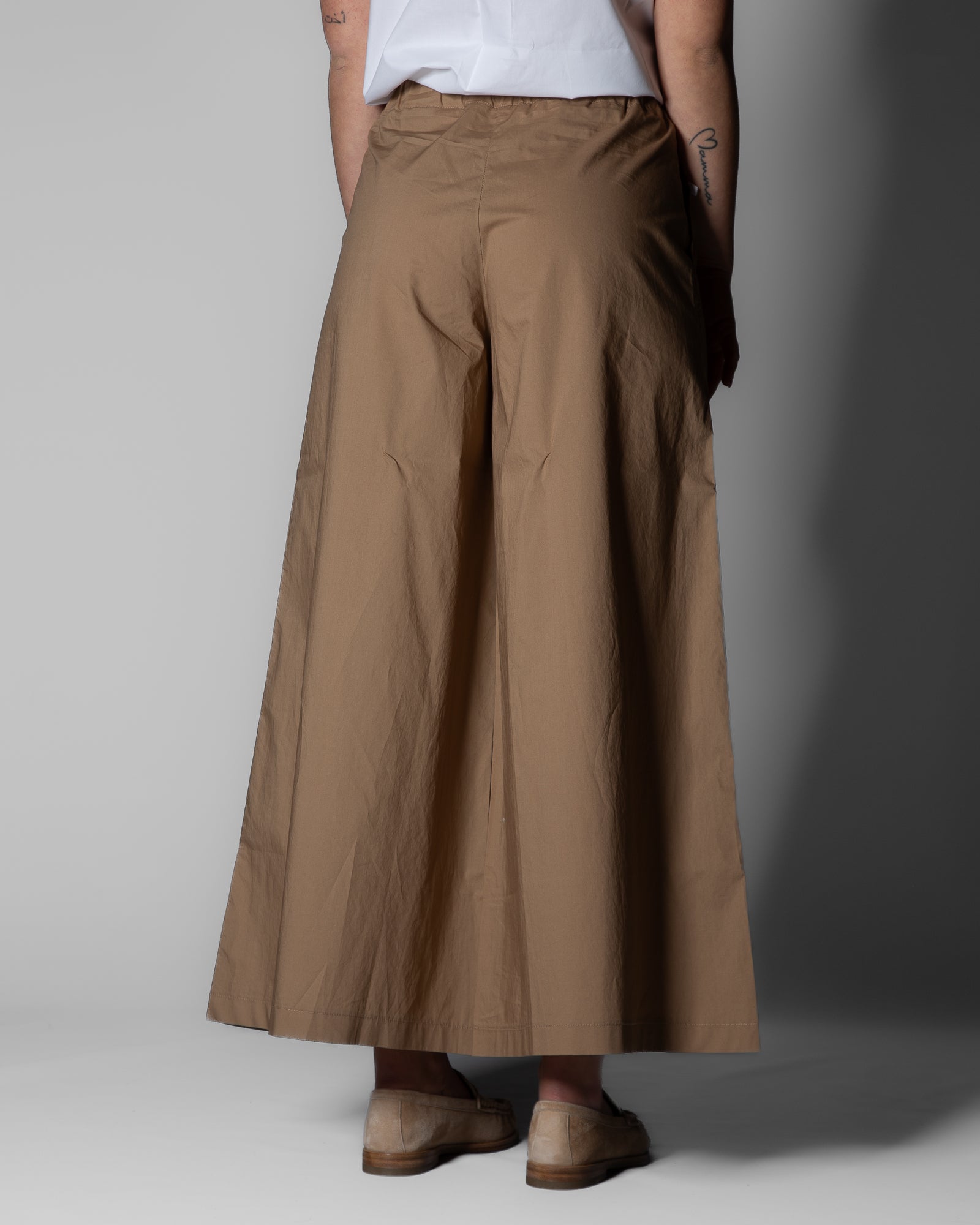 Realizzati in popeline di puro cotone, offrono una mano fresca e asciutta, ideale per la stagione più calda. La vita elasticizzata garantisce comfort e vestibilità immediata, mentre le tasche laterali alla francese aggiungono funzionalità senza appesantire il design. Il taglio cropped e l’ampiezza della gamba valorizzano l’abbinamento con calzature leggere, per uno stile rilassato ma curato.
