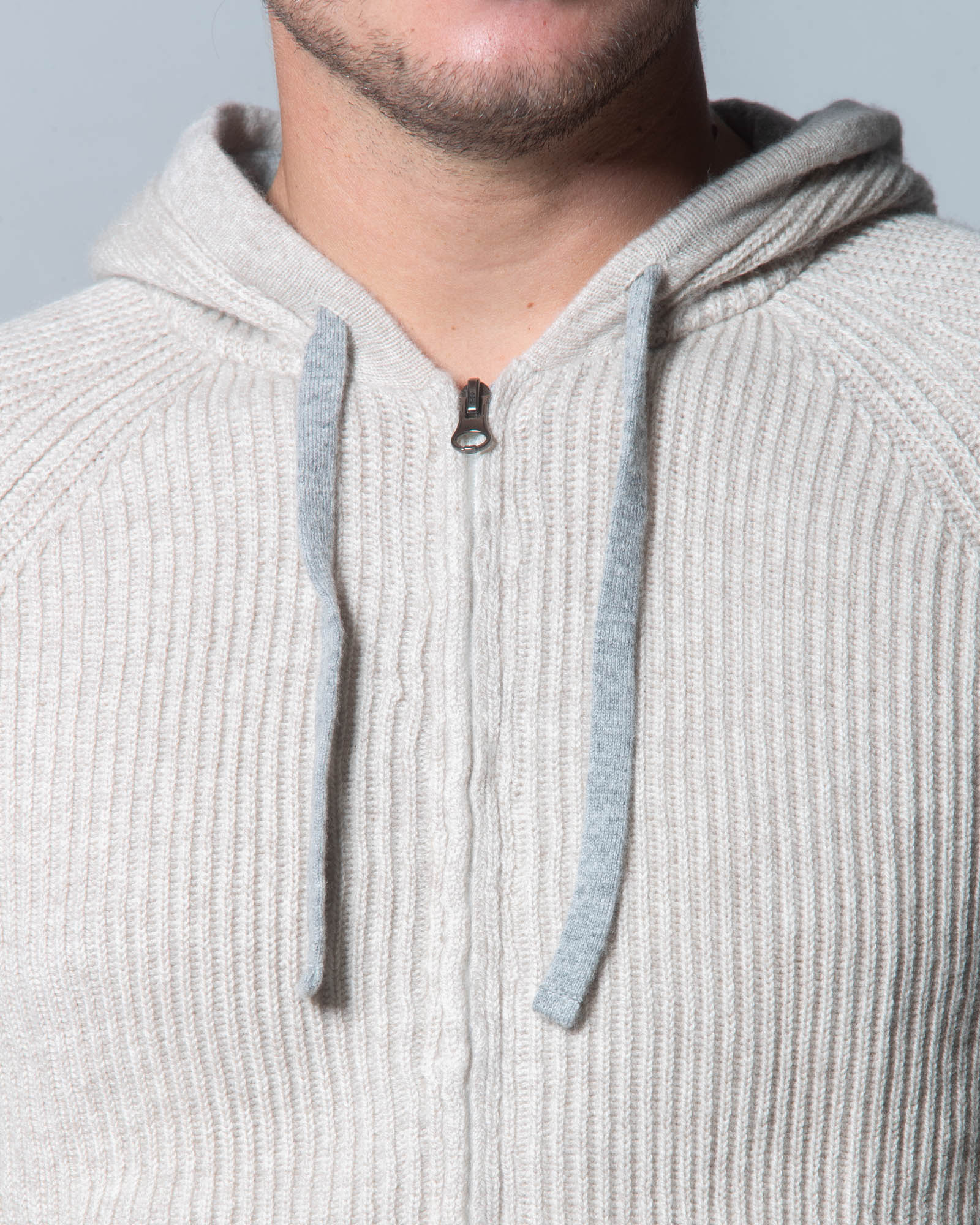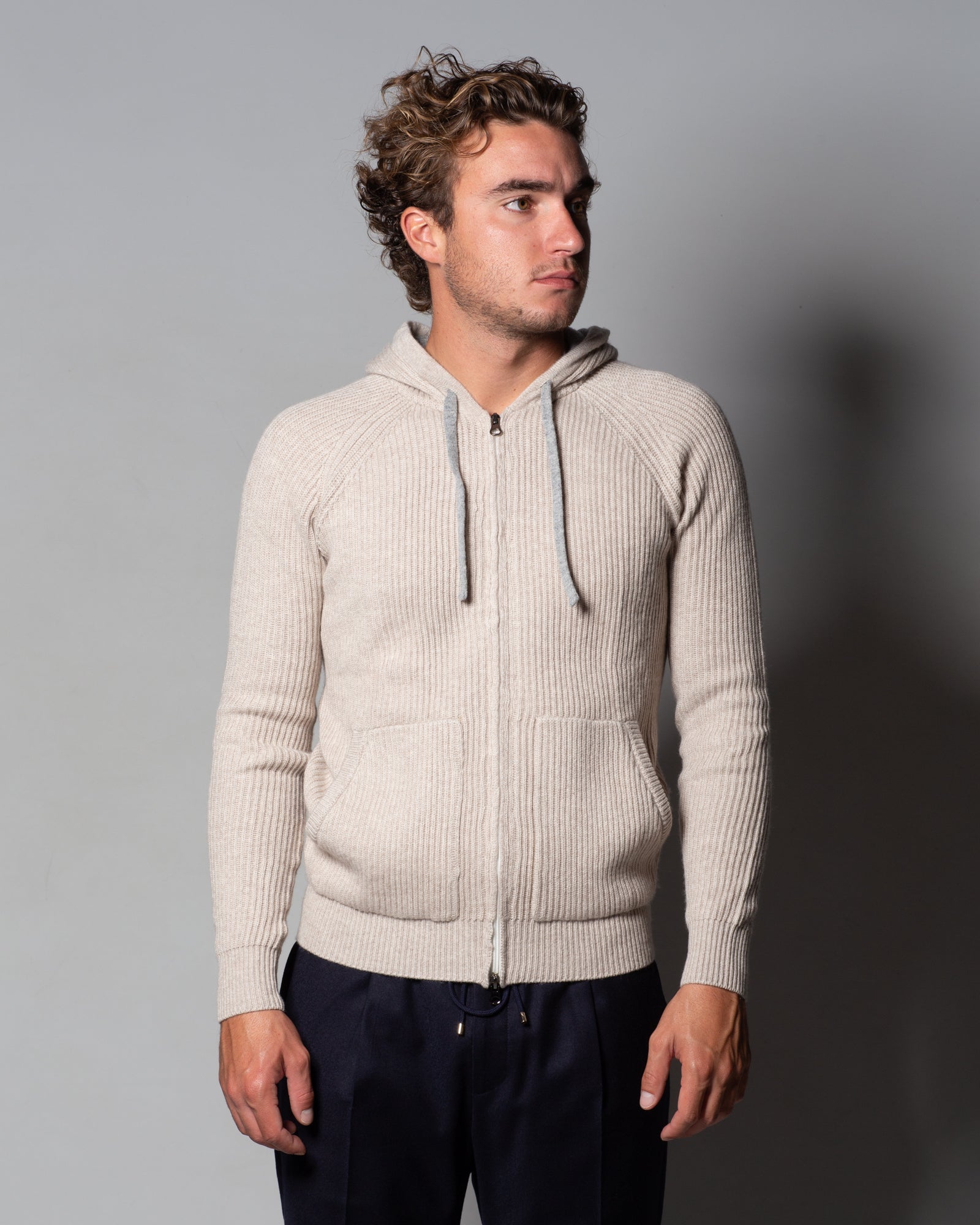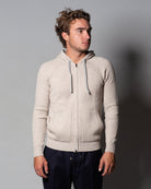 Il design presenta un cappuccio con coulisse e una chiusura frontale con zip bidirezionale, dettagli che ne esaltano la praticità e lo spirito contemporaneo. I contrasti nei toni del nocciola, visibili sulla coulisse e sull’interno del cappuccio, aggiungono un tocco distintivo a questa felpa raffinata, ideale per un’eleganza rilassata e disinvolta.