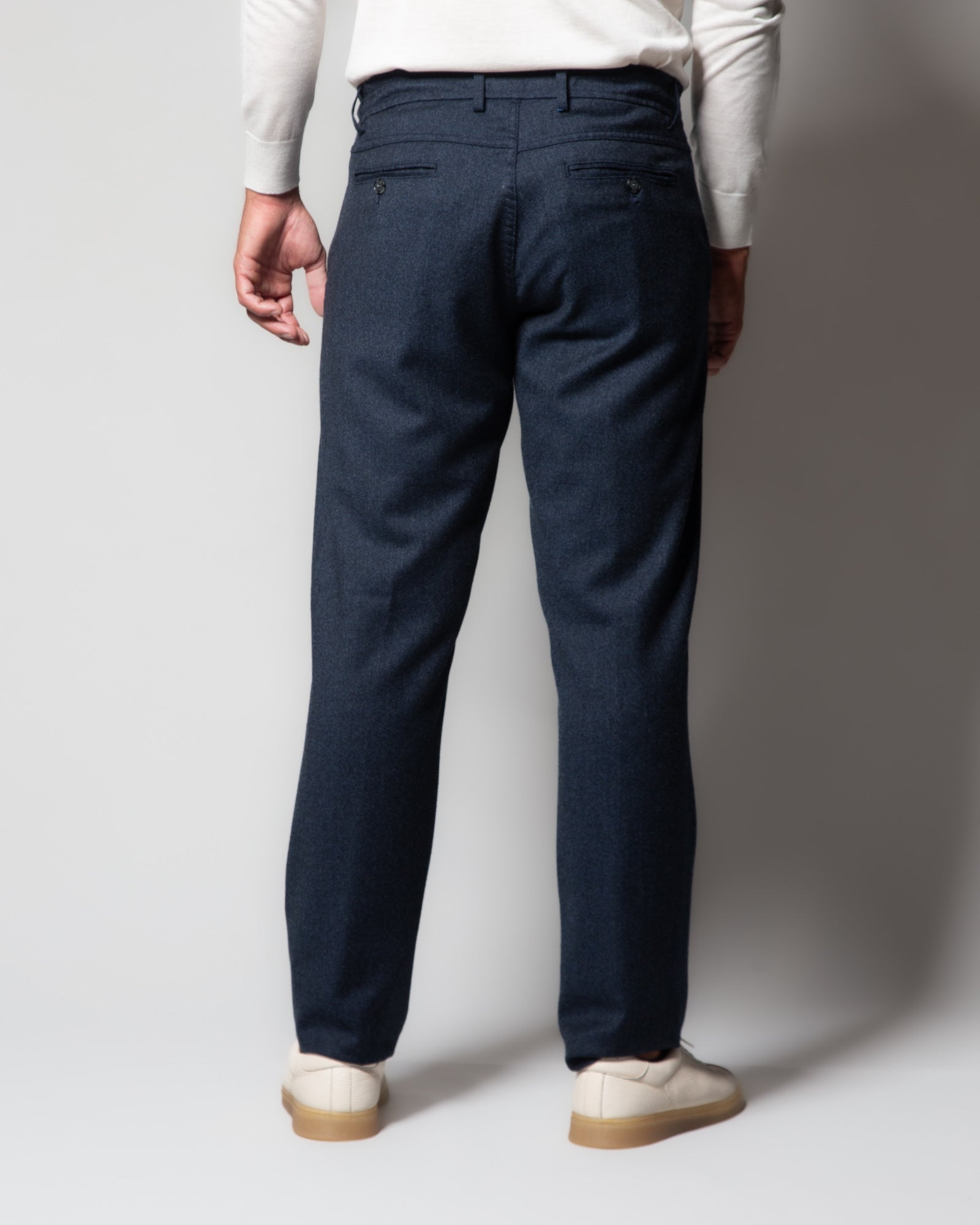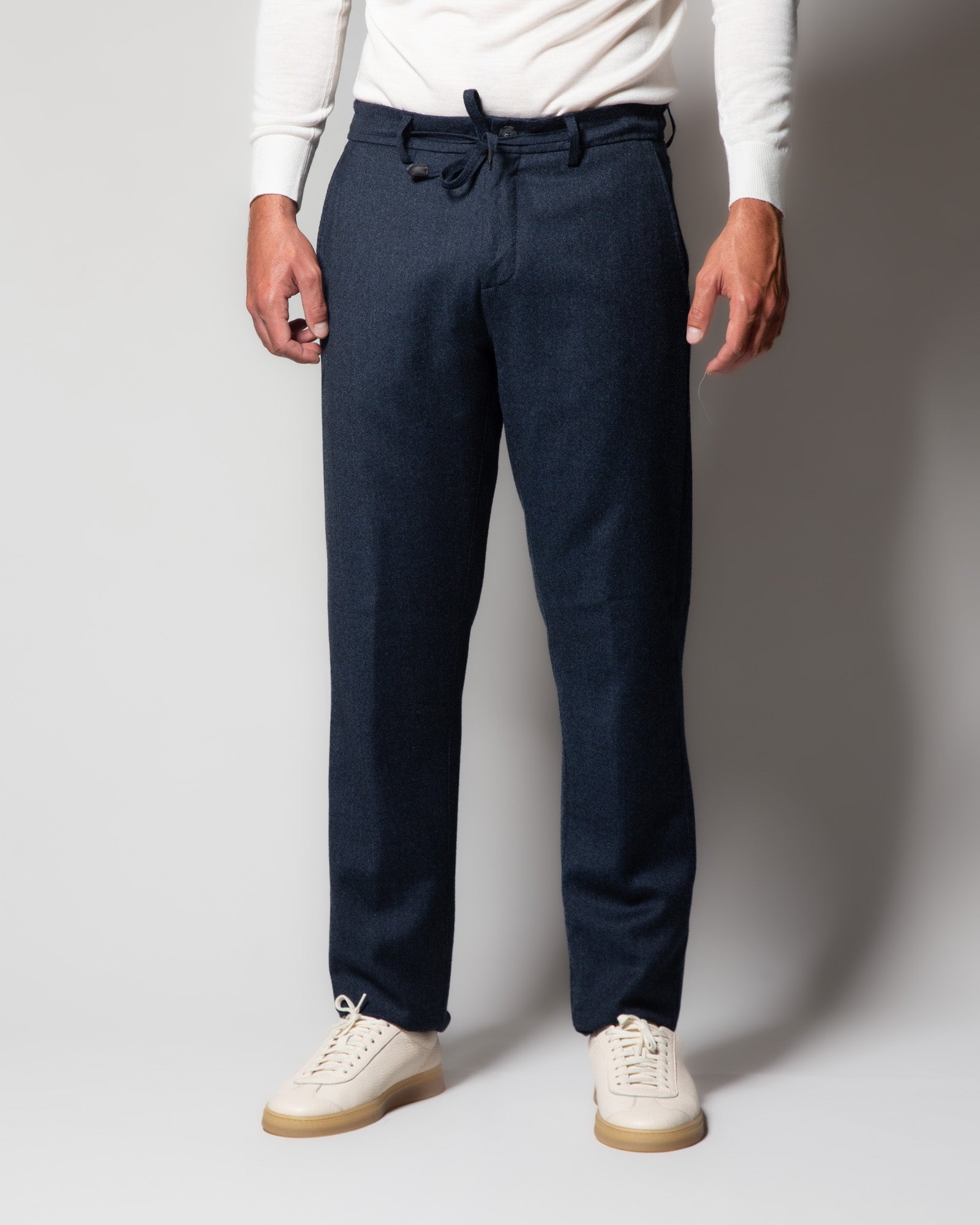 La linea essenziale è valorizzata da una vita elasticizzata con coulisse regolabile e da una gamba dal taglio affusolato che mantiene una silhouette pulita e moderna. Le tasche laterali a filo e le tasche posteriori con bottone completano un design raffinato, pensato per accompagnare outfit business-casual o abbinamenti più disinvolti con sneakers o mocassini. Perfetti con l’overshirt Canali in flanella per un insieme coerente e sofisticato.