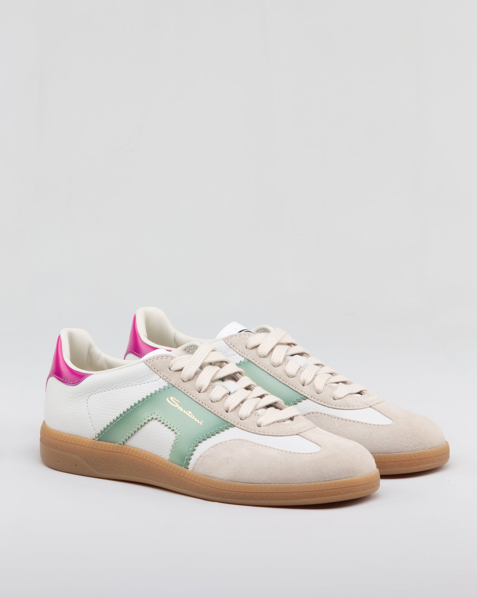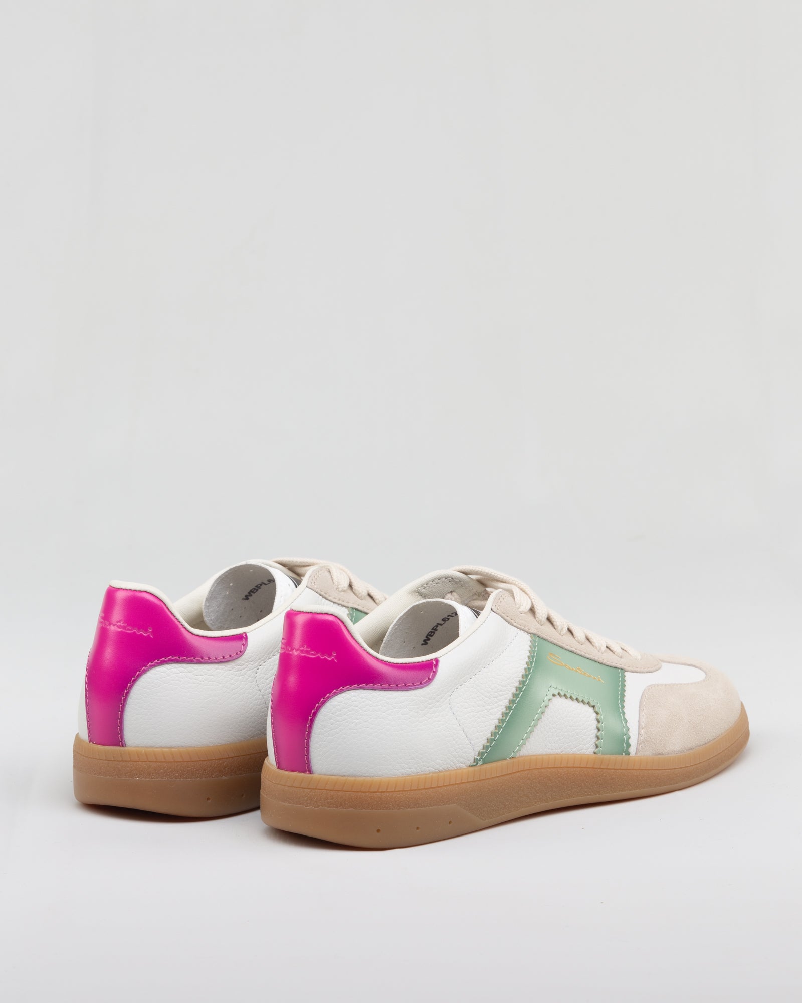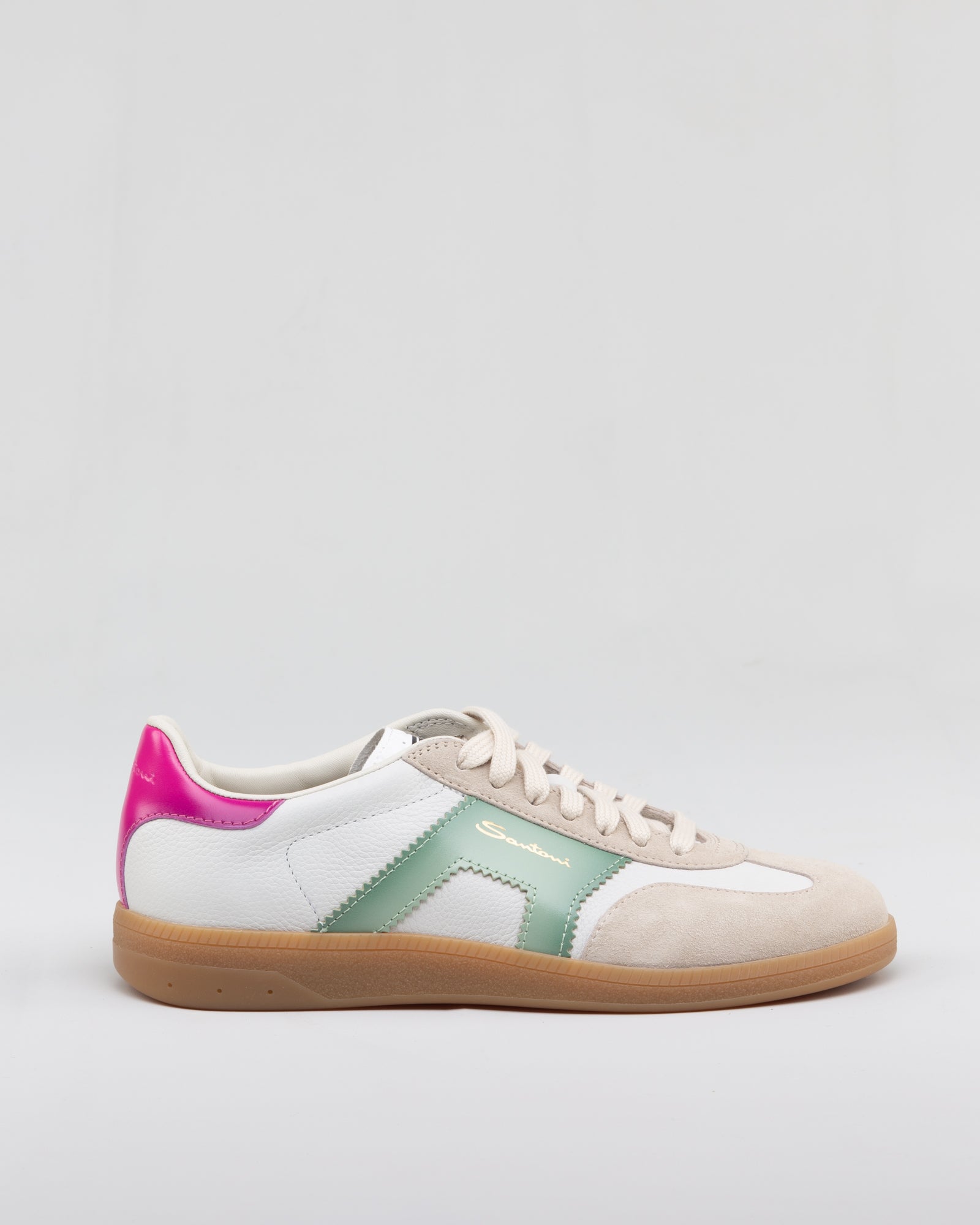 La tomaia combina pelle e suede, creando un contrasto materico che arricchisce la silhouette. La palette bianco, verde e rosa introduce un tocco dinamico e contemporaneo, mantenendo la sneaker versatile e facile da abbinare. La costruzione è studiata per garantire comfort e stabilità, mentre la suola in gomma assicura durata e leggerezza. Un modello pensato per un utilizzo quotidiano con uno stile curato ma disinvolto.