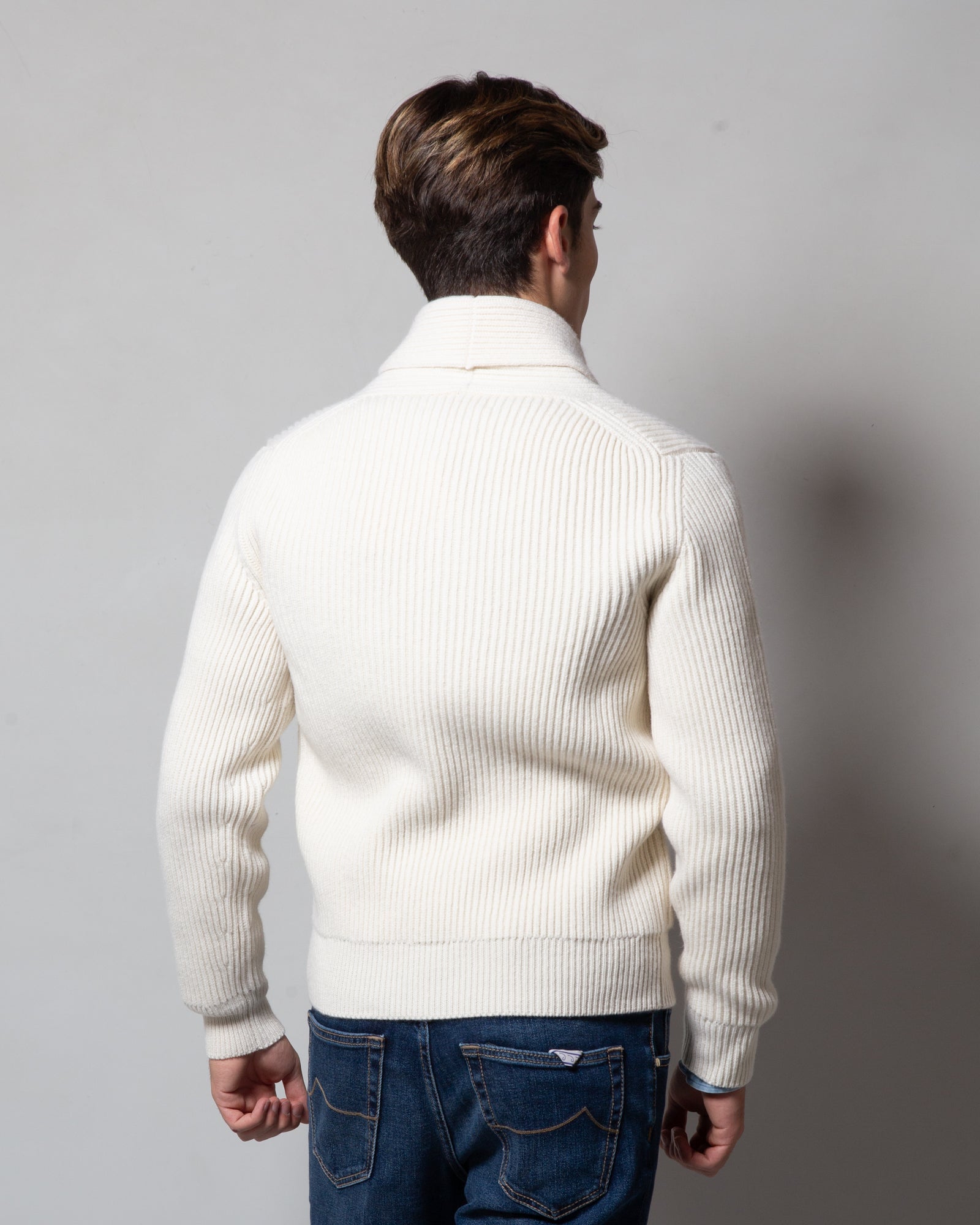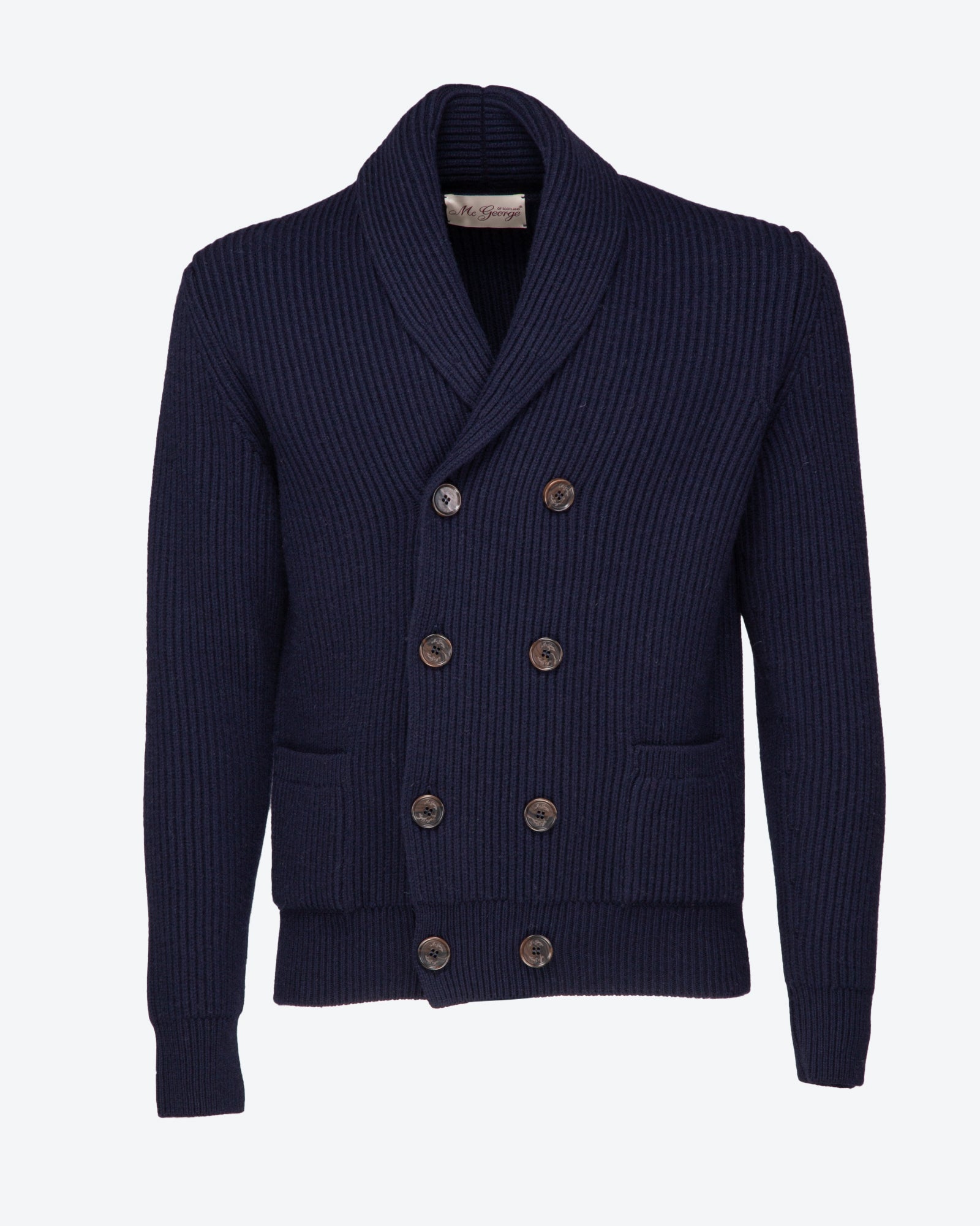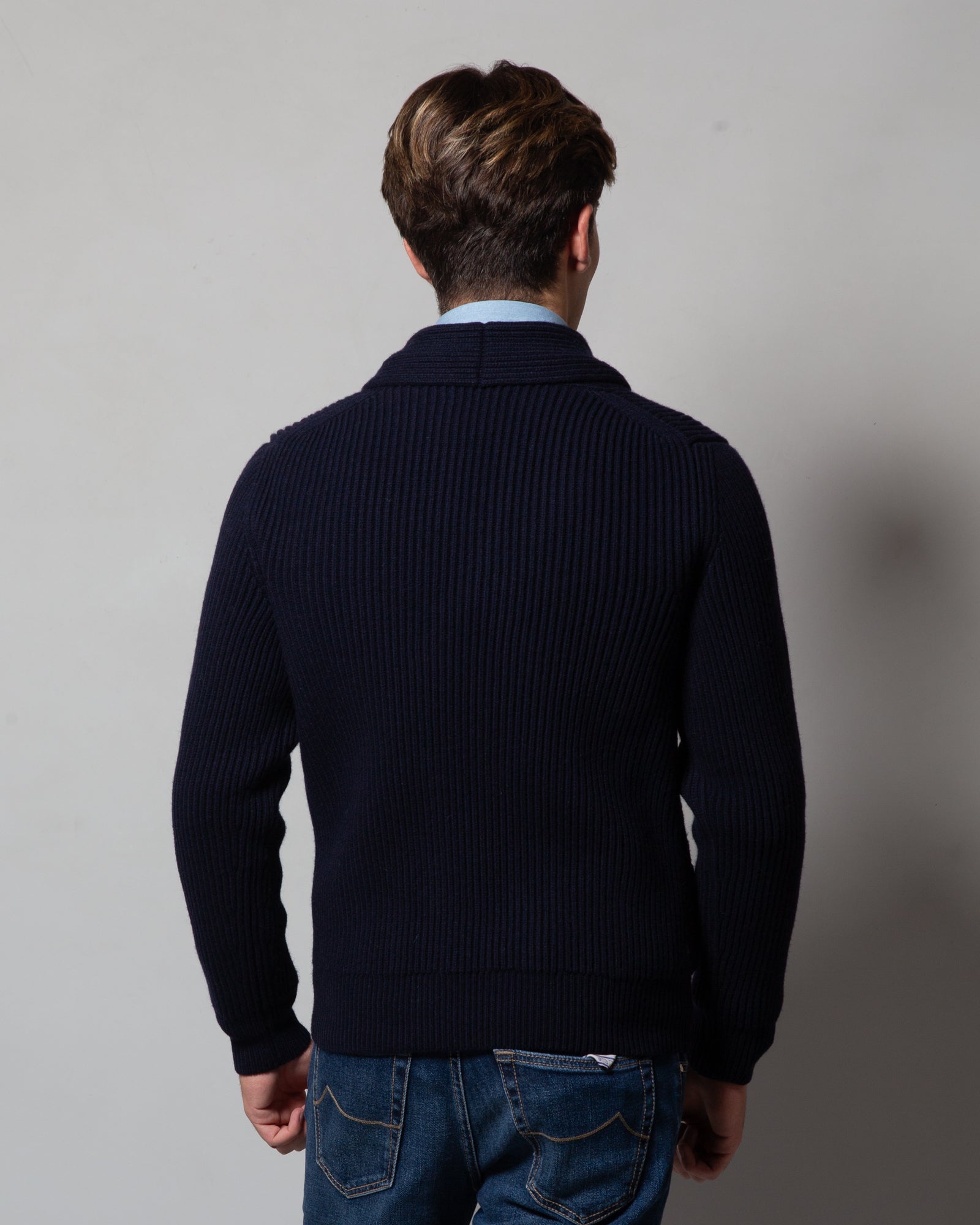 The McGeorge wool and cashmere cardigan, handcrafted in Scotland, embodies the excellence of high-quality knitwear. Heavy and enveloping, with an English rib knit that enhances the refined texture of the fabric, this piece represents the perfect combination of tradition and craftsmanship. The distinctive details, the rib knit and the shawl collar, give a sophisticated and timeless touch. Ideal for those seeking comfort, warmth and an unmistakable style.