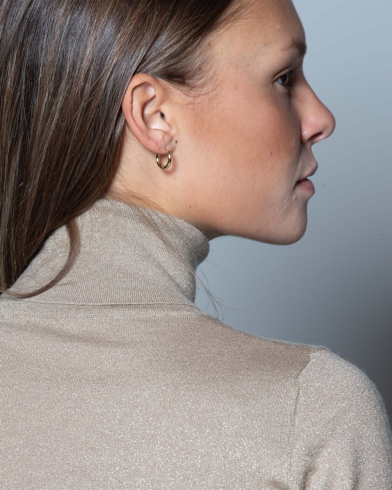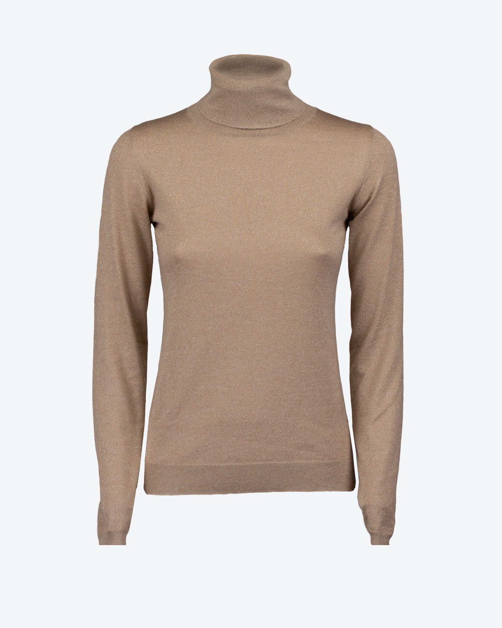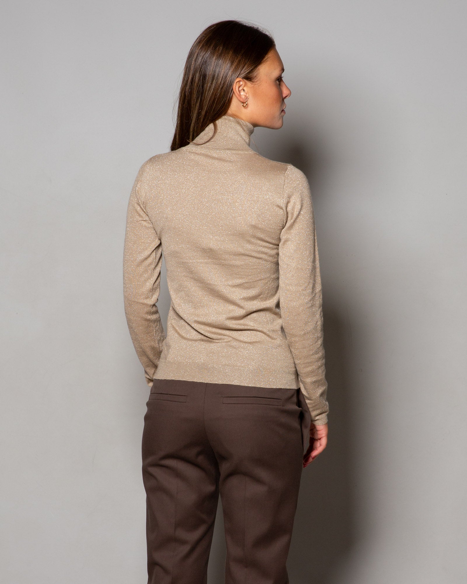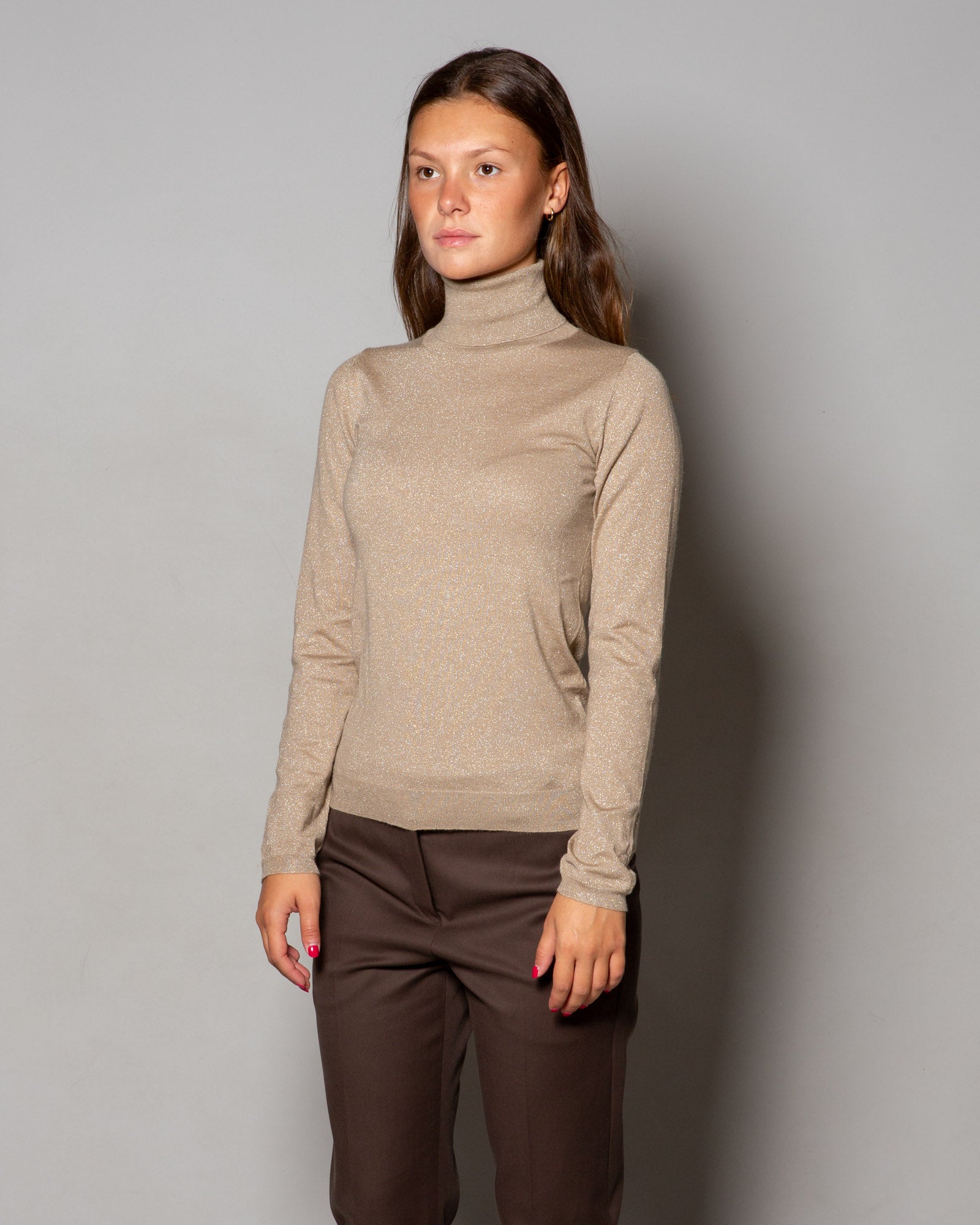 Il dolcevita in cashmere e seta di Brunello Cucinelli esalta la semplicità con un tocco di raffinata luminosità. La texture leggera e morbida del filato avvolge la silhouette con un comfort che scivola delicatamente su busto e spalle. Un filo di lamé aggiunge un accenno di riflessi metallici, elevando l’essenzialità del design senza compromessi.