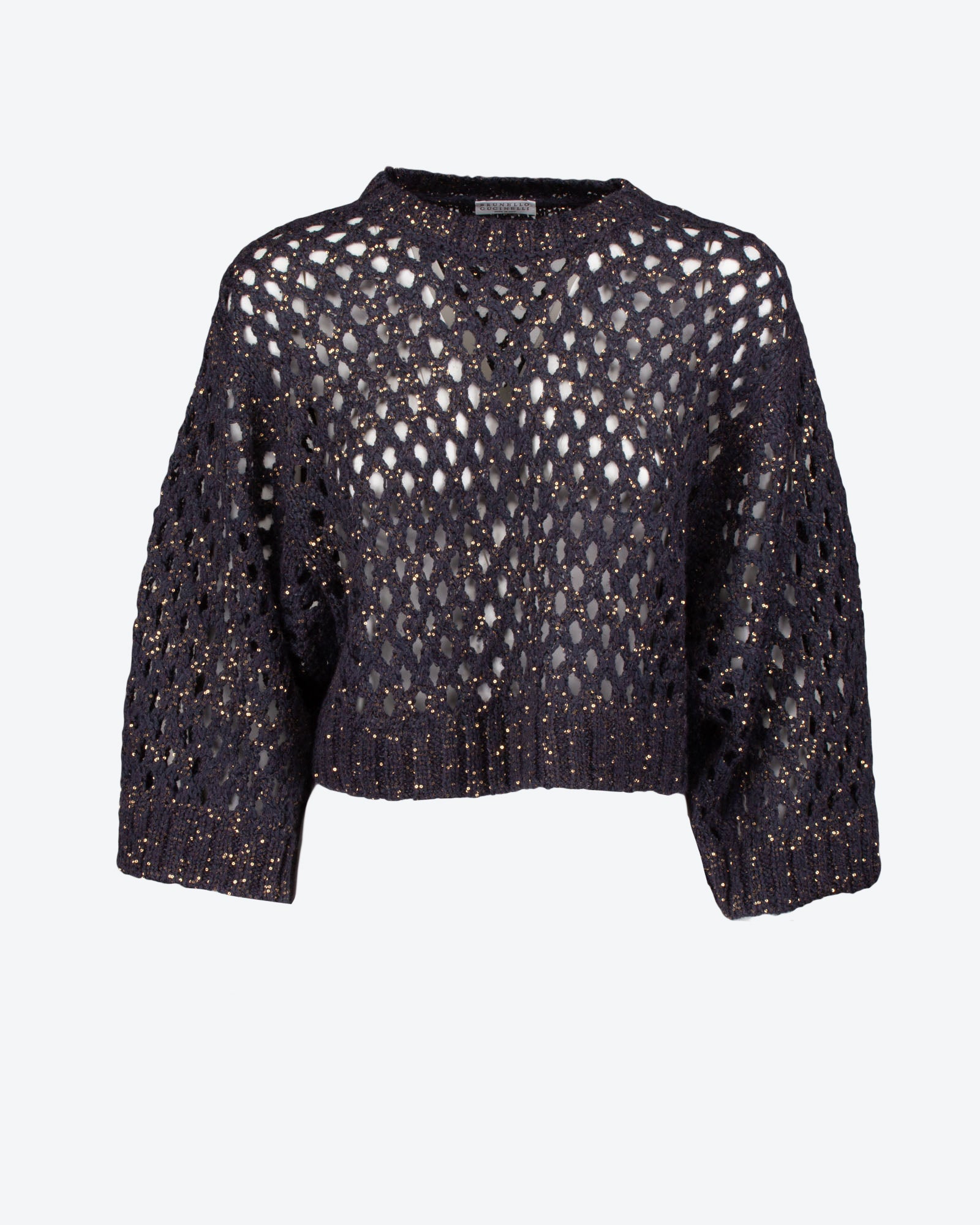La particolare combinazione di fibre naturali unisce la fluidità della seta alla matericità del lino, arricchita da un filo con paillettes che dona una brillantezza discreta e sofisticata. La vestibilità morbida, con spalla abbassata e manica ampia, regala un comfort naturale, rendendo questa maglia un capo distintivo, perfetto per interpretare con leggerezza l’eleganza quotidiana. Ogni creazione di Brunello Cucinelli nasce a Solomeo, dove l’artigianalità italiana si intreccia con un profondo senso etico e di rispetto per il territorio.
