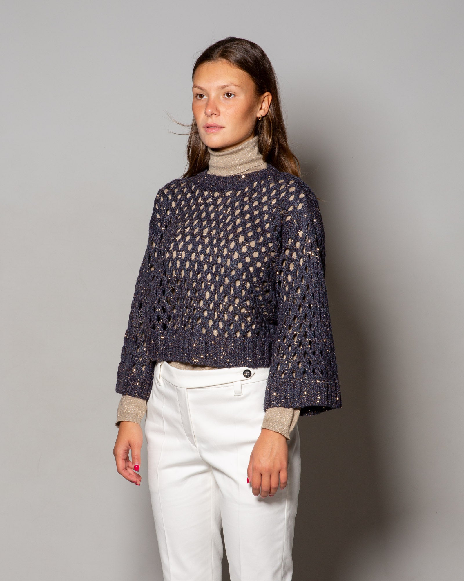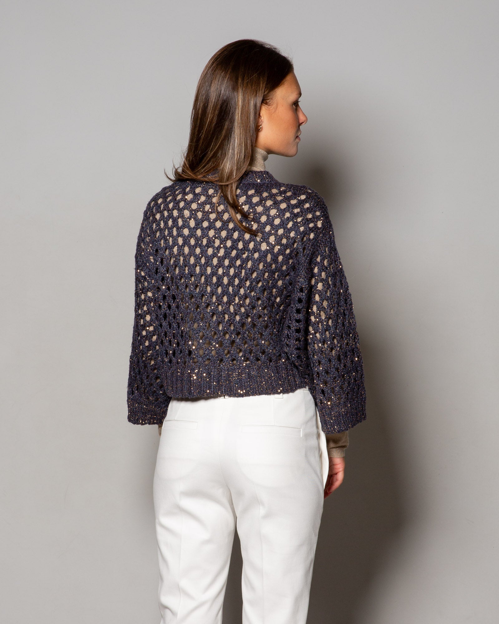 La maglia Dazzling Net in seta e lino Brunello Cucinelli celebra la femminilità con una lavorazione a rete impreziosita da paillettes leggere e luminose, che diffondono delicati bagliori lungo la superficie. I profili in maglia a coste rifiniscono con eleganza il capo, mantenendo un equilibrio armonioso tra raffinatezza e freschezza contemporanea.