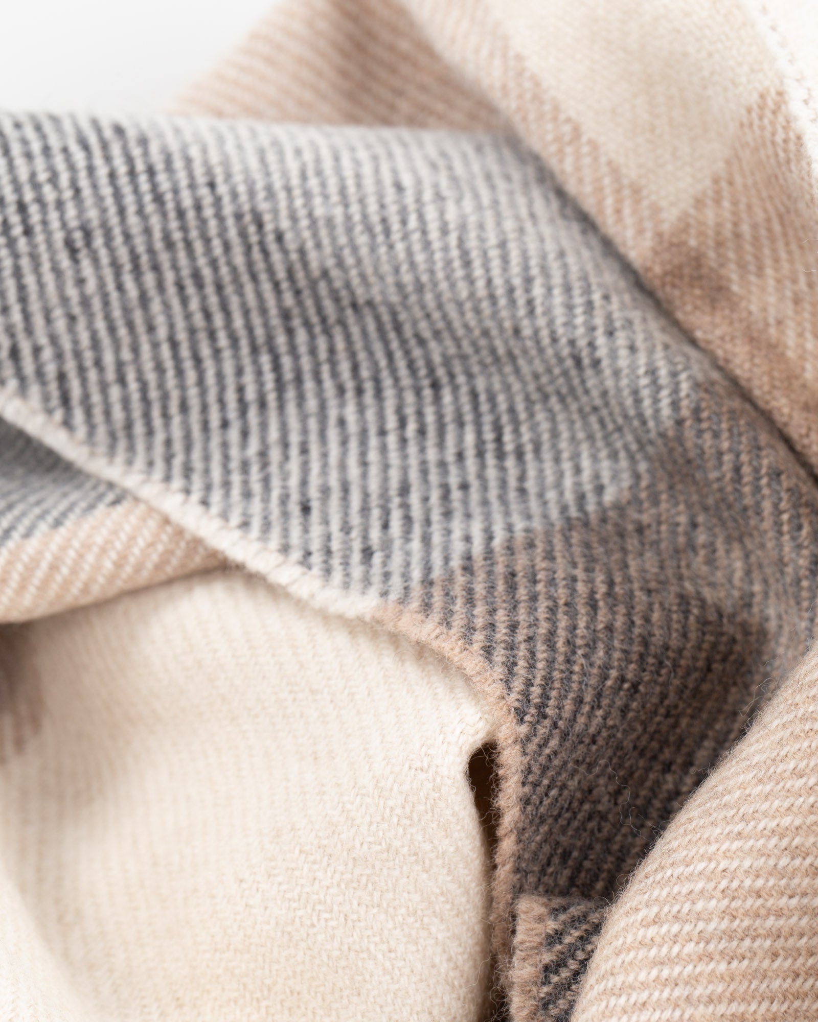 La sciarpa Brunello Cucinelli esprime l’equilibrio perfetto tra tradizione e contemporaneità. La classica fantasia check si arricchisce delle nuance di stagione, donando al tessuto un carattere sofisticato e versatile, ideale per completare con eleganza i tuoi abbinamenti quotidiani.