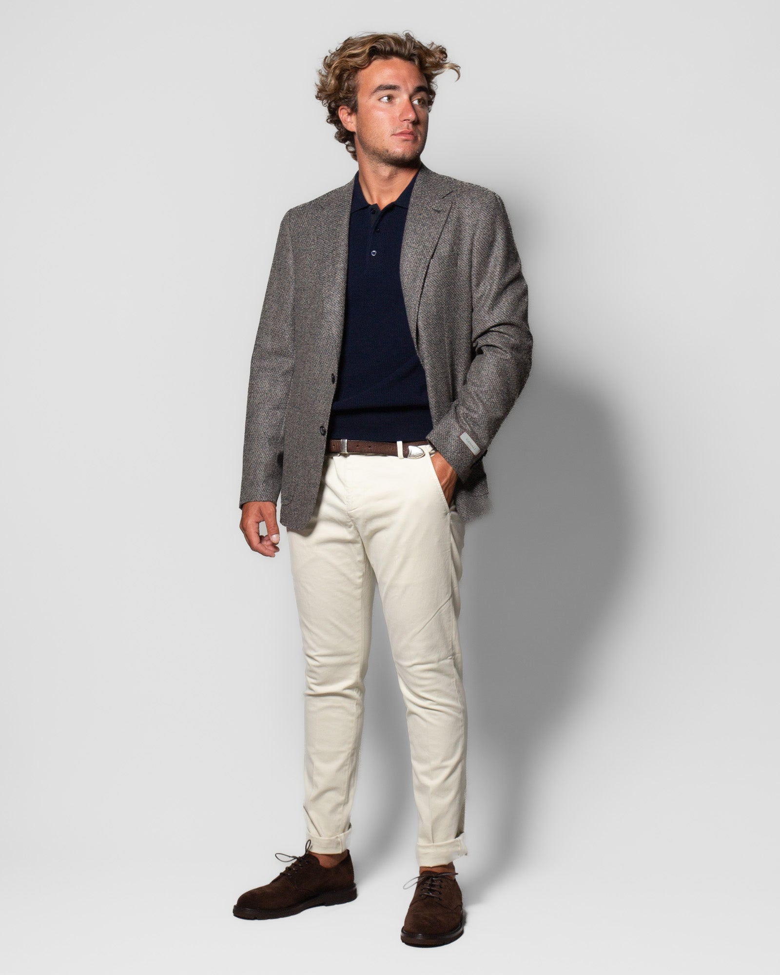 La giacca Canali in blend di lana interpreta con eleganza contemporanea il concetto di versatilità maschile. La sua tonalità delicata e la costruzione leggera esprimono uno stile raffinato ma disinvolto, adatto a diverse occasioni. La linea monopetto a due bottoni, abbinata a spalle morbide e una vestibilità confortevole, dona equilibrio tra struttura e naturalezza, mantenendo un’immagine sempre impeccabile.