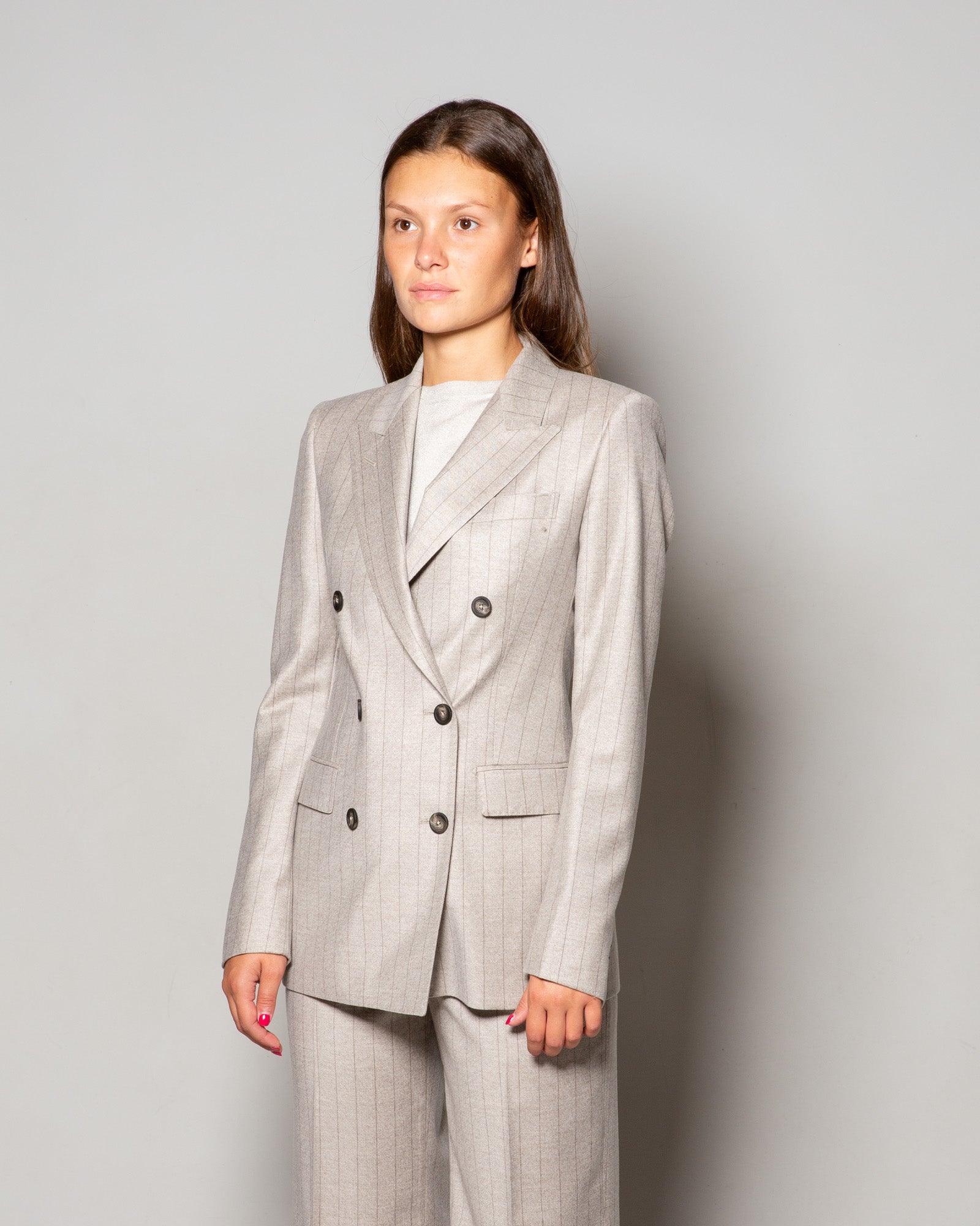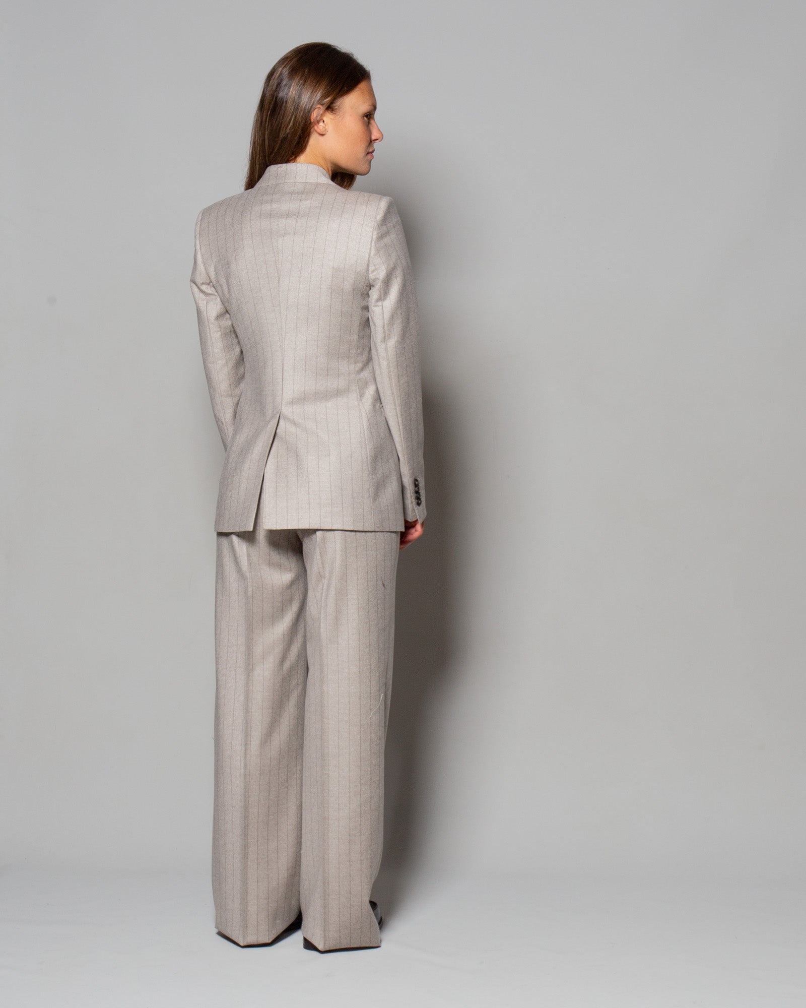 Il pregio della tradizione sartoriale italiana si riflette in questo abito Tagliatore da donna, realizzato in lana vergine con raffinata fantasia gessata in contrasto delicato. La giacca doppiopetto con rever classico e bottoni in corno esprime carattere e femminilità, mentre lo spacco centrale dona movimento e armonia alla silhouette. I pantaloni a gamba ampia completano un insieme sobrio e di grande personalità.