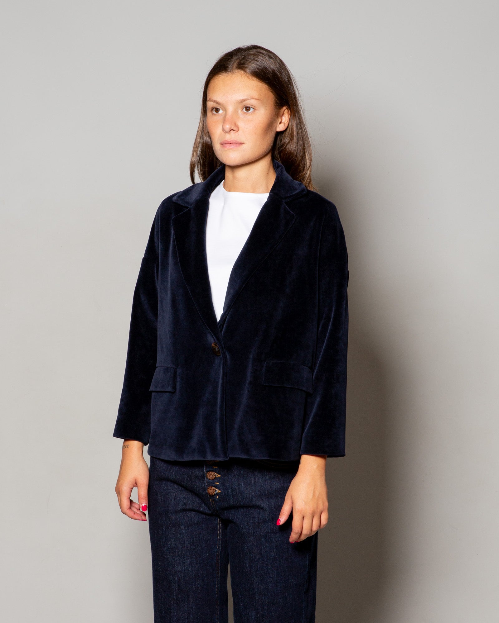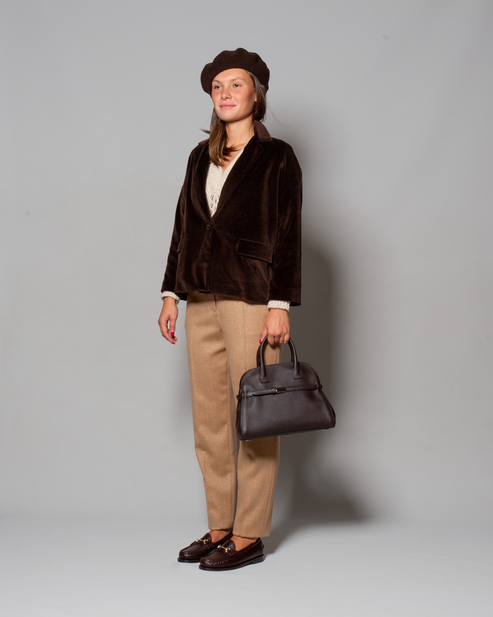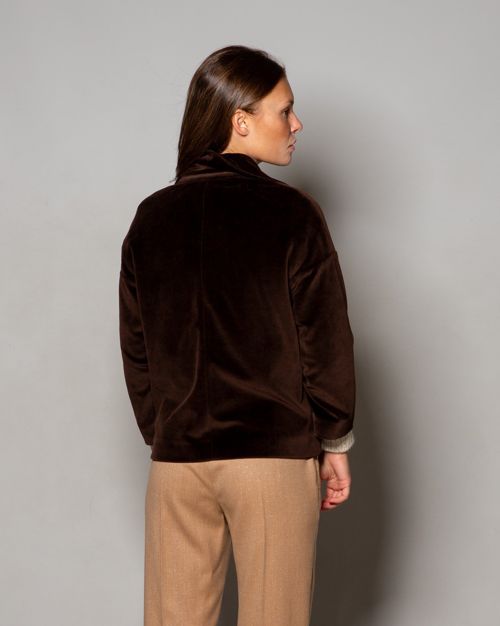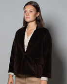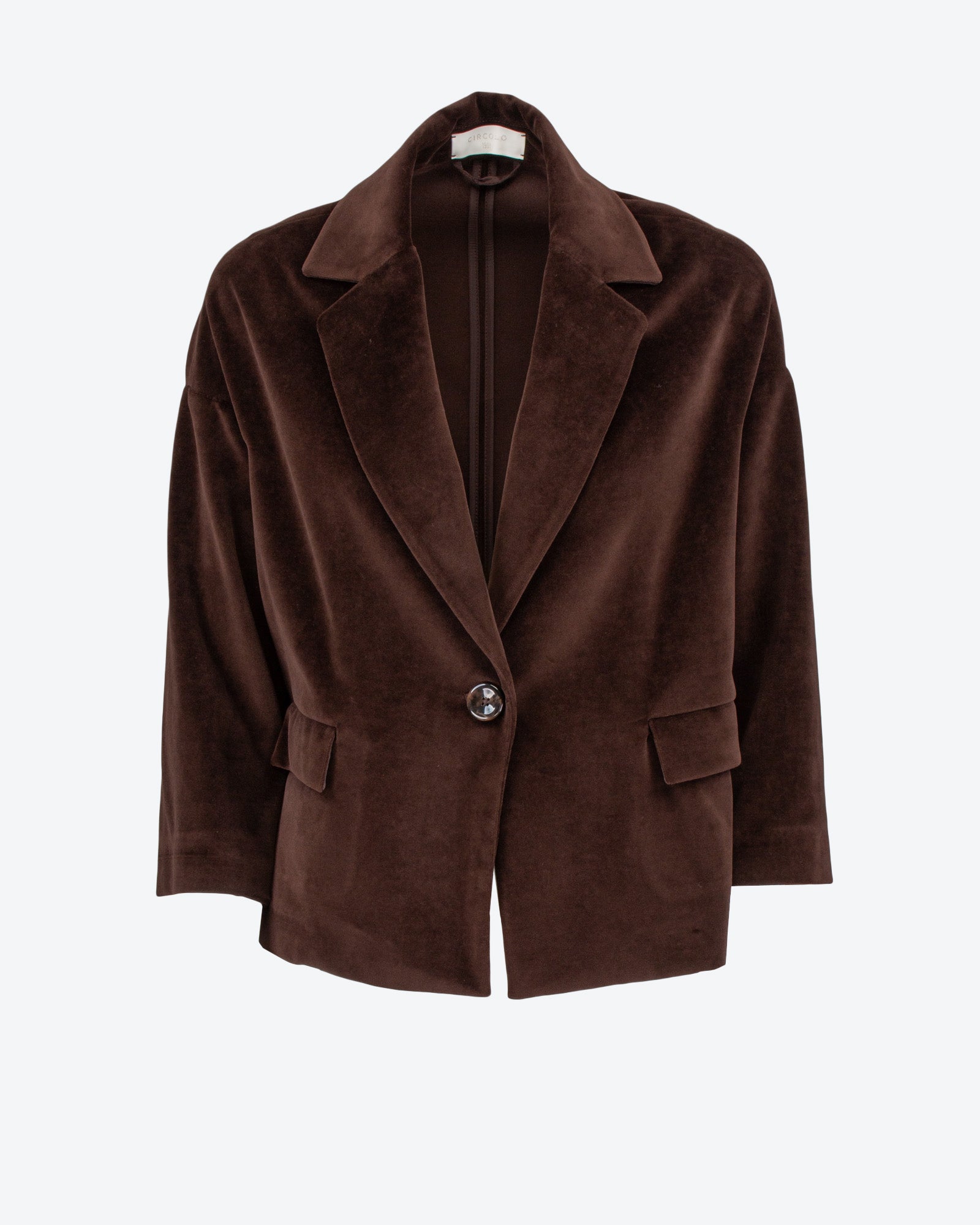 Il caban monopetto Circolo 1901 in velluto marrone esprime la filosofia del brand: capi dal fascino sartoriale pensati per accompagnare la quotidianità con naturale eleganza. La texture morbida e corposa del velluto incontra linee pulite e proporzioni bilanciate, trasformando un capo iconico in un alleato di stile versatile.