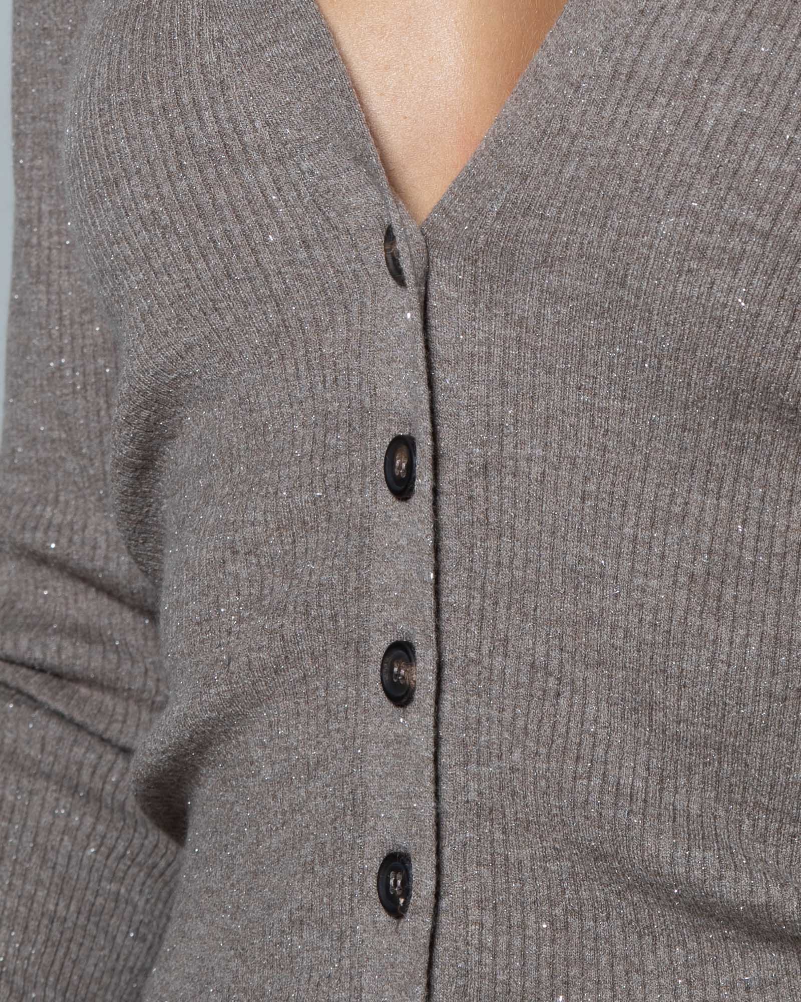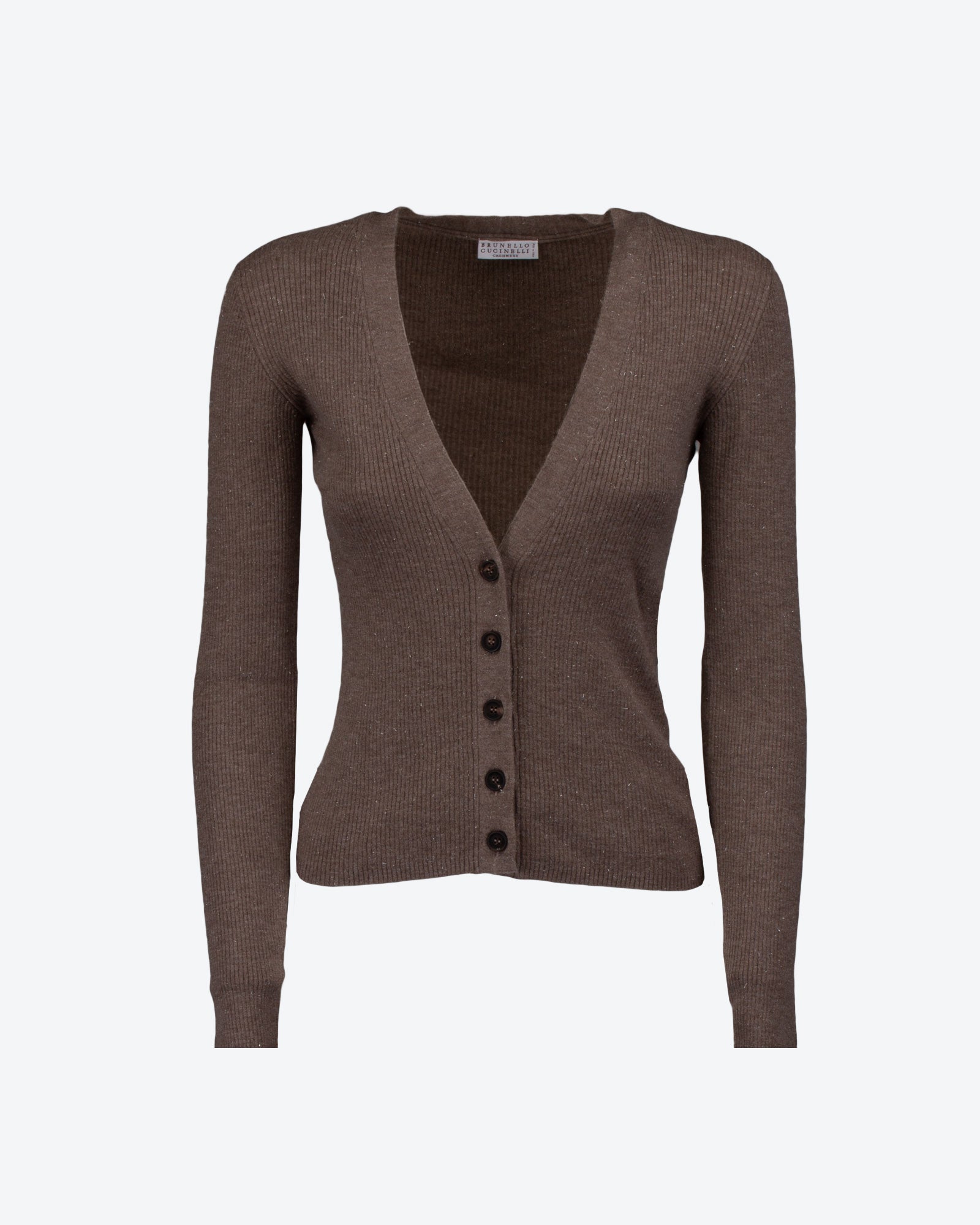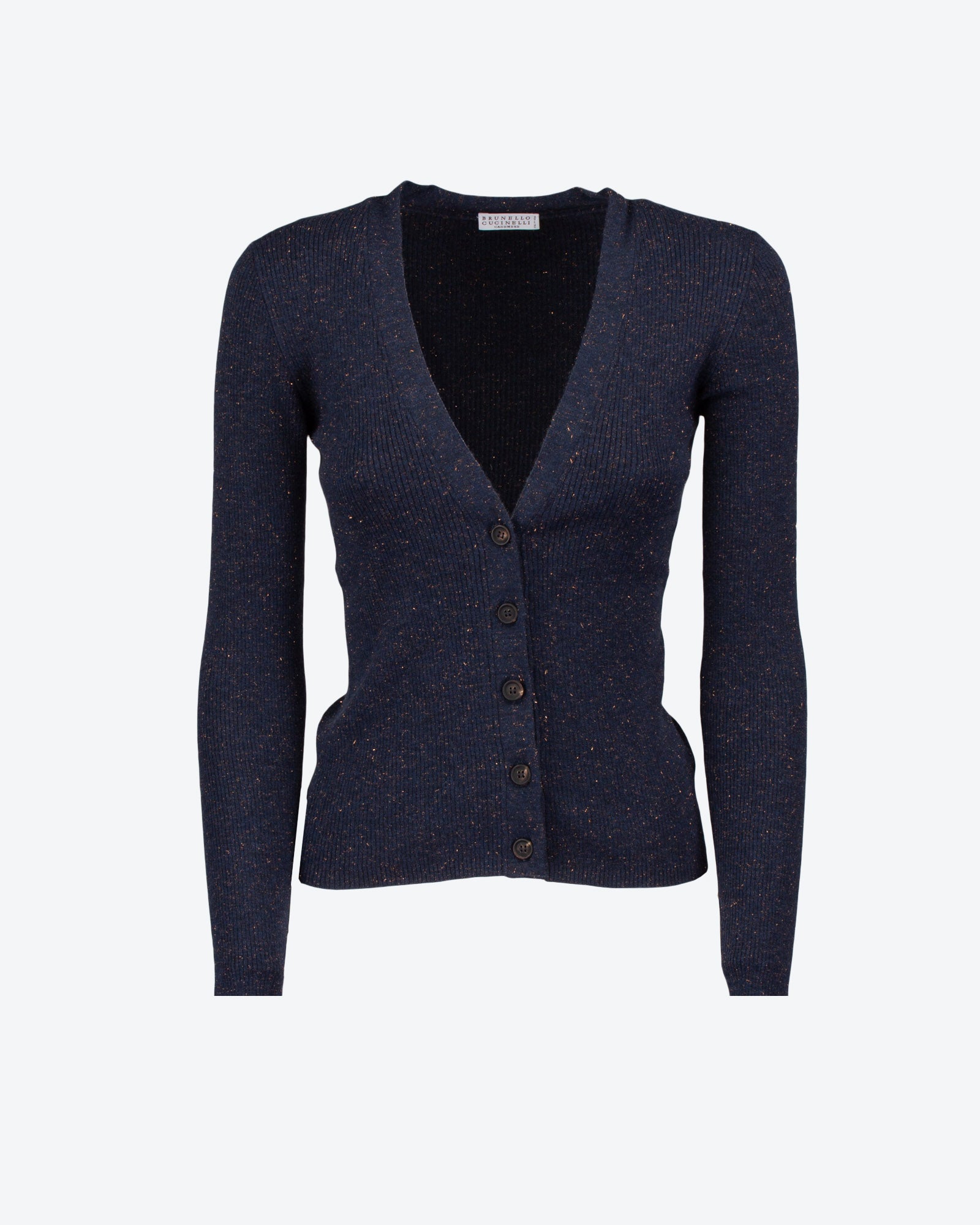 Il cardigan in cashmere Sparkling Brunello Cucinelli rivela l’anima raffinata di un capo essenziale impreziosito da dettagli unici. La lavorazione a coste, classica e senza tempo, si anima grazie alla presenza di un sottile filo lamé che diffonde luminosi riflessi sulla superficie del morbido filato, donando eleganza contemporanea e sofisticata brillantezza.