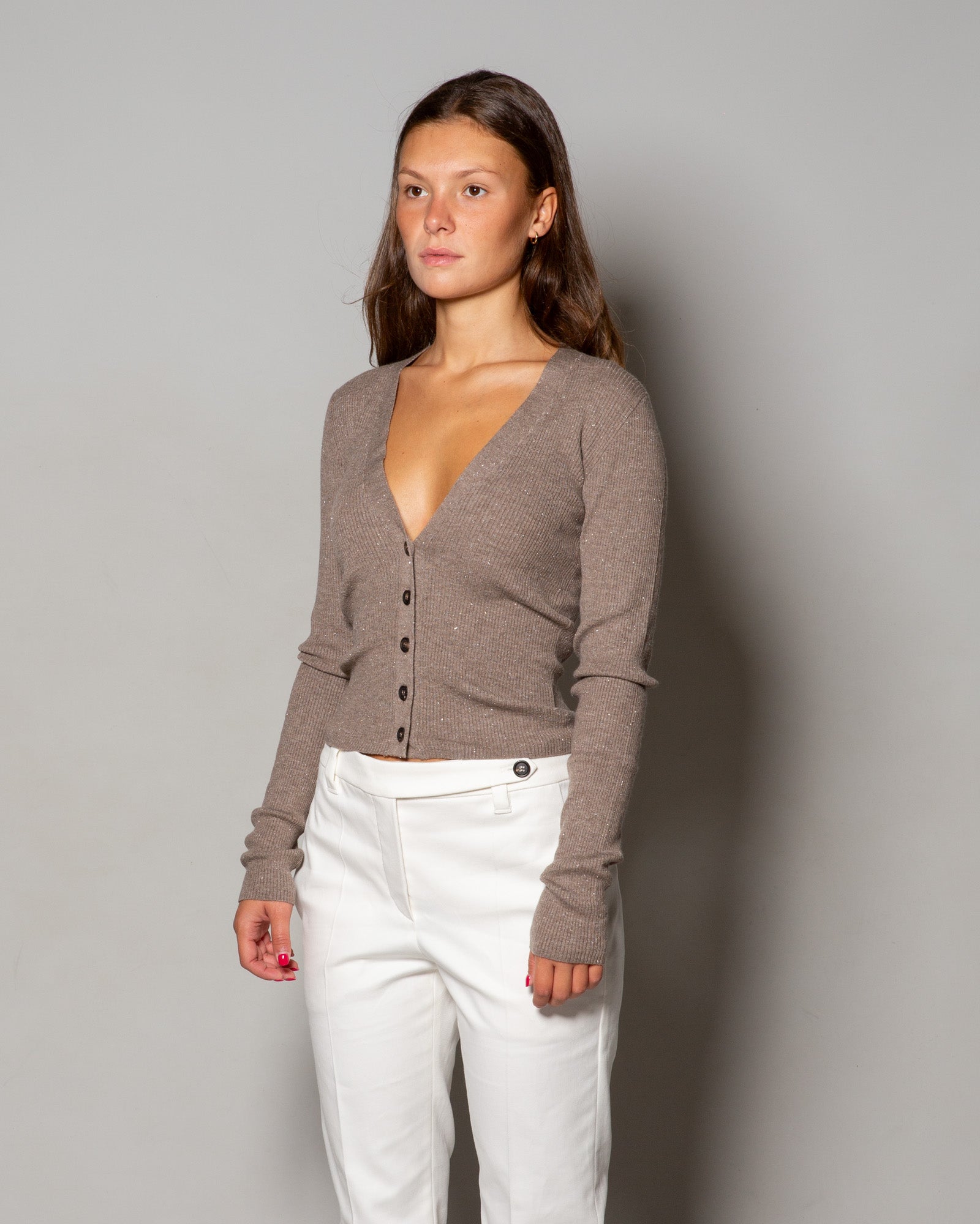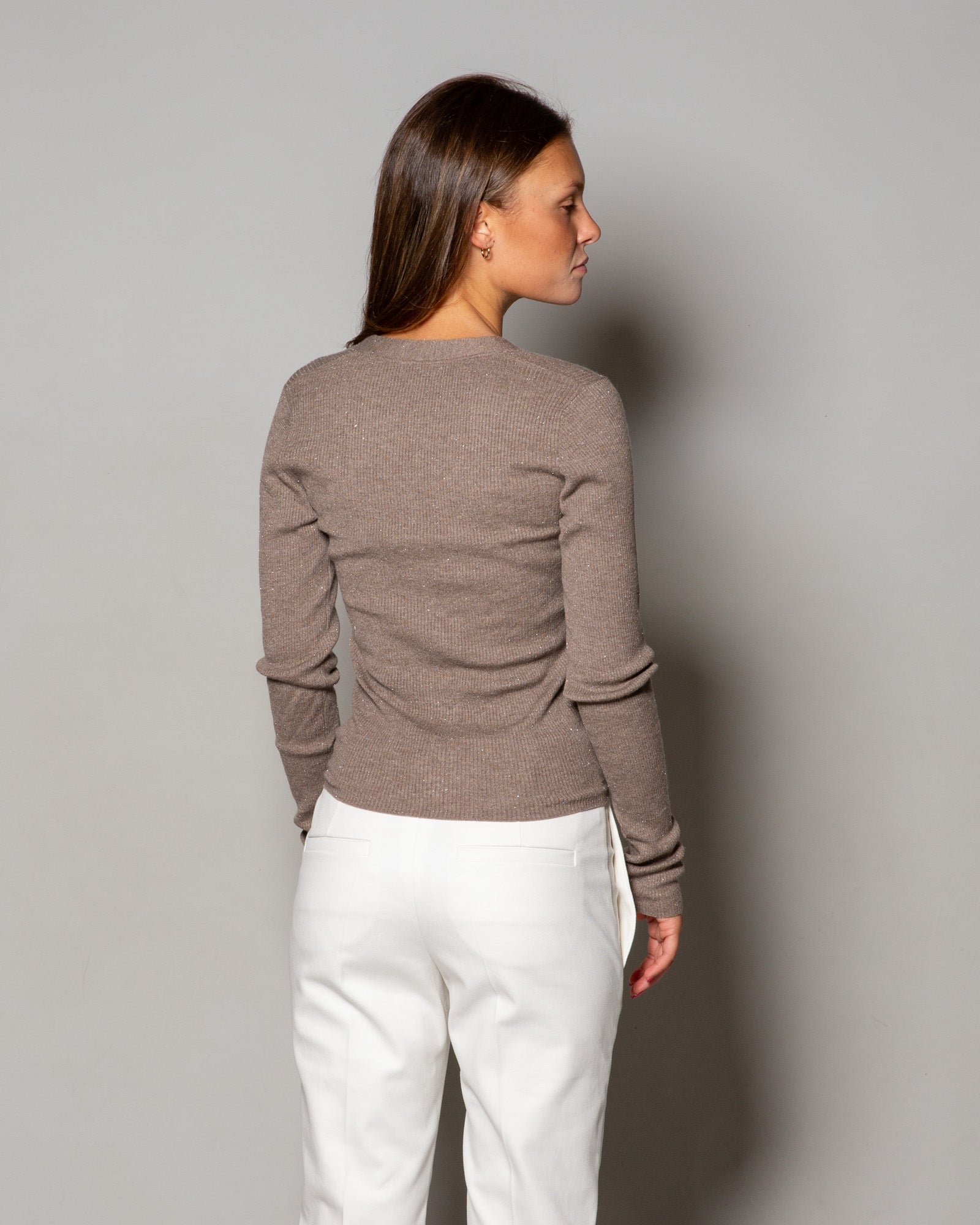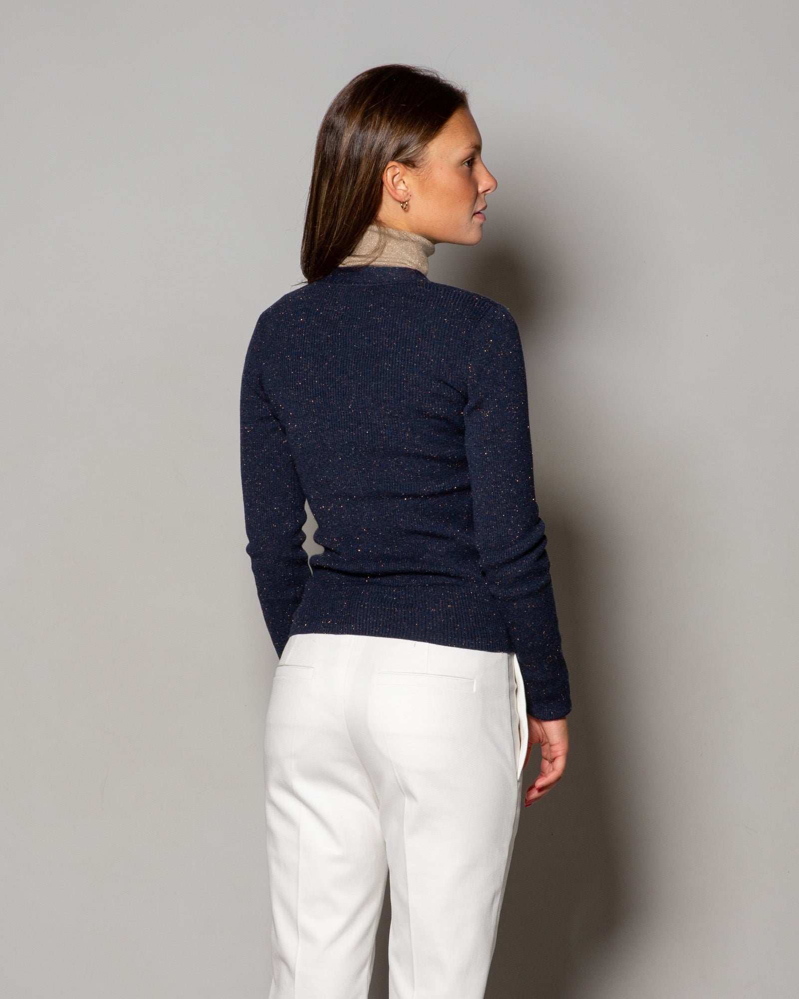 Il cardigan in cashmere Sparkling Brunello Cucinelli rivela l’anima raffinata di un capo essenziale impreziosito da dettagli unici. La lavorazione a coste, classica e senza tempo, si anima grazie alla presenza di un sottile filo lamé che diffonde luminosi riflessi sulla superficie del morbido filato, donando eleganza contemporanea e sofisticata brillantezza.