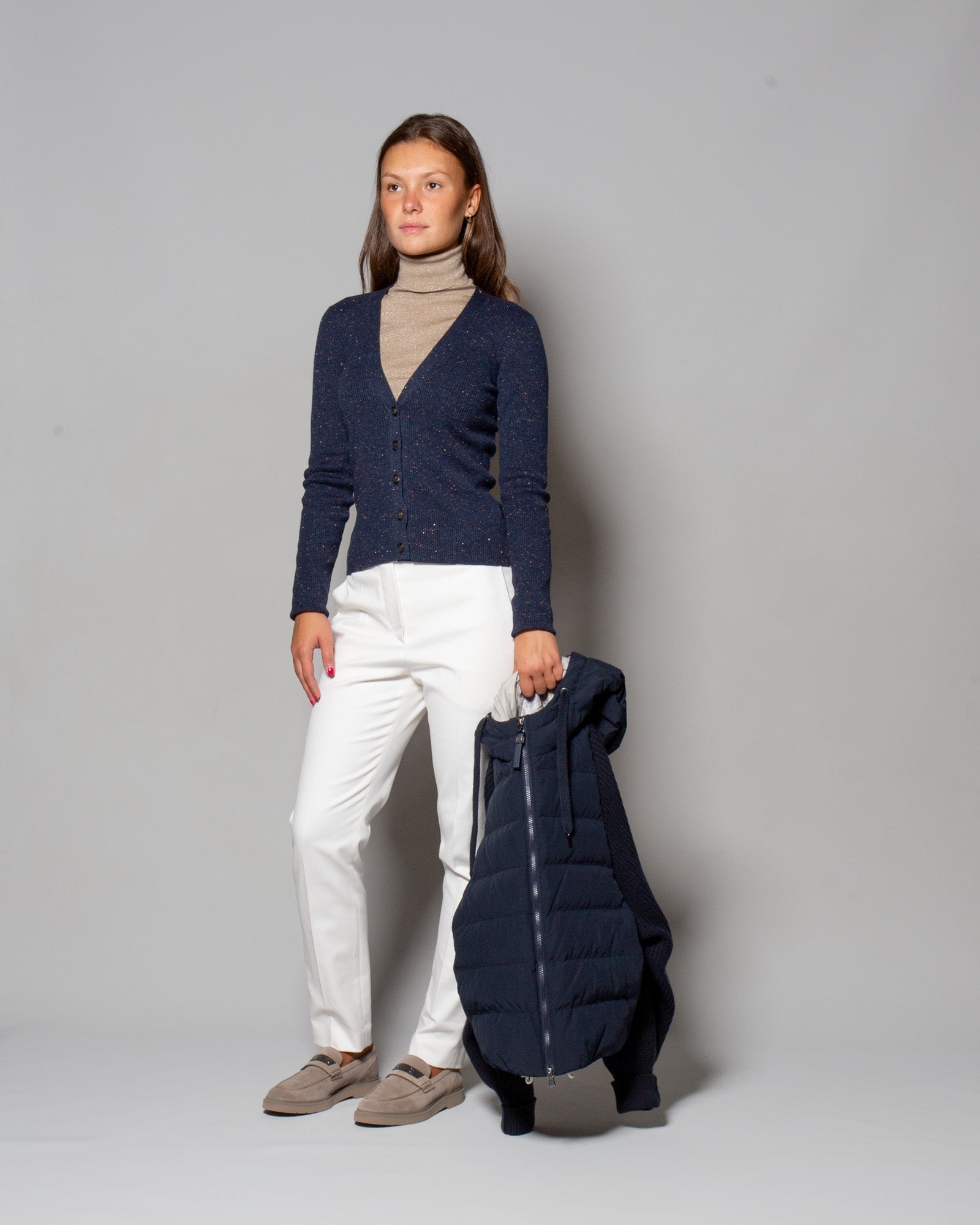 La linea regolare, con spalla e manica dalle proporzioni equilibrate, si accompagna alla chiusura frontale con bottoni in corno, segno distintivo dell’artigianalità italiana. Una maglia pensata per offrire comfort e stile, interpretando l’estetica sobria e ricercata tipica della maison di Solomeo. Ogni creazione di Brunello Cucinelli nasce da valori profondi di etica e rispetto, intrecciando qualità sartoriale e armonia con il territorio.