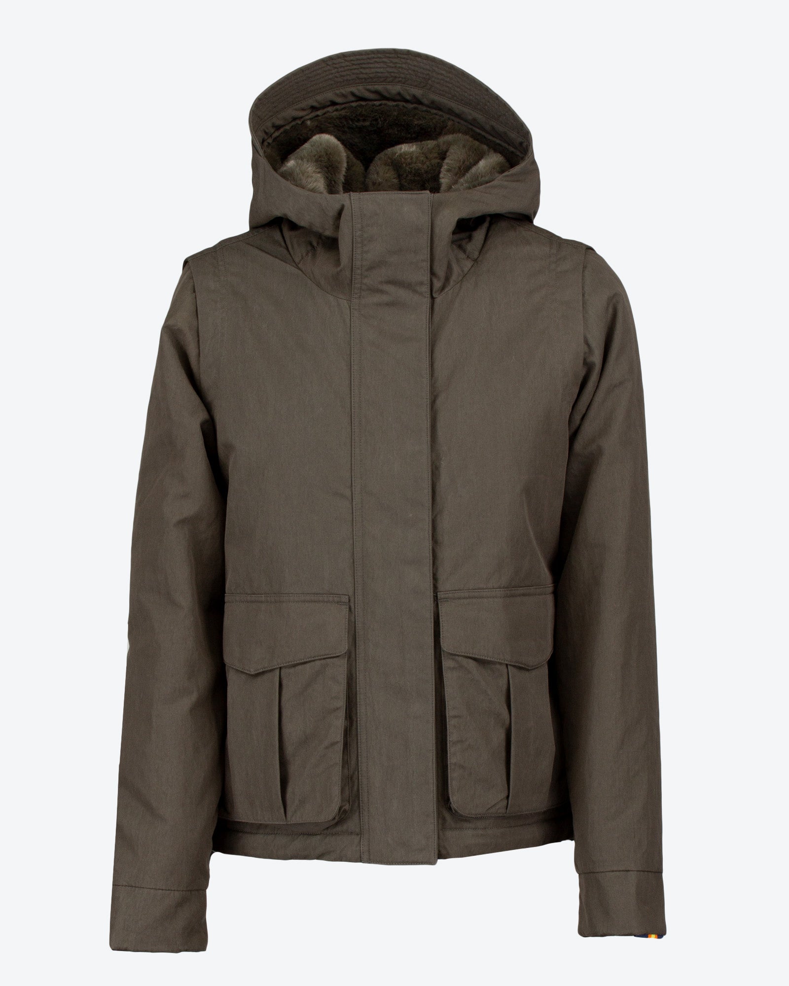 Composizione 64% cotone, 36% poliammide — Fodera: 100% poliestere — Imbottitura: 100% poliestere — Pelliccia: 100% poliestere
