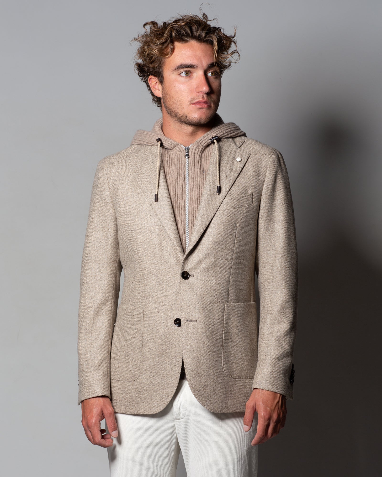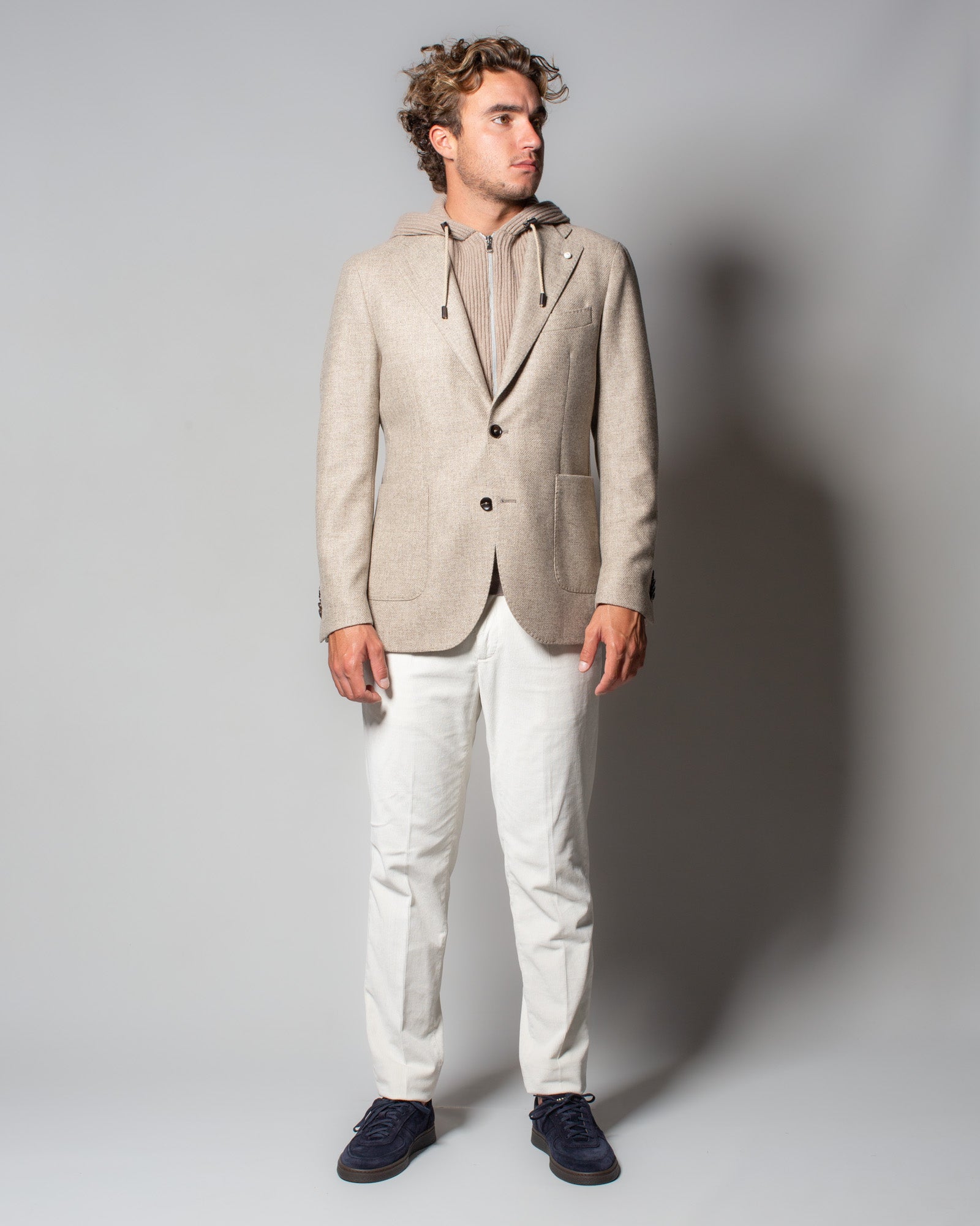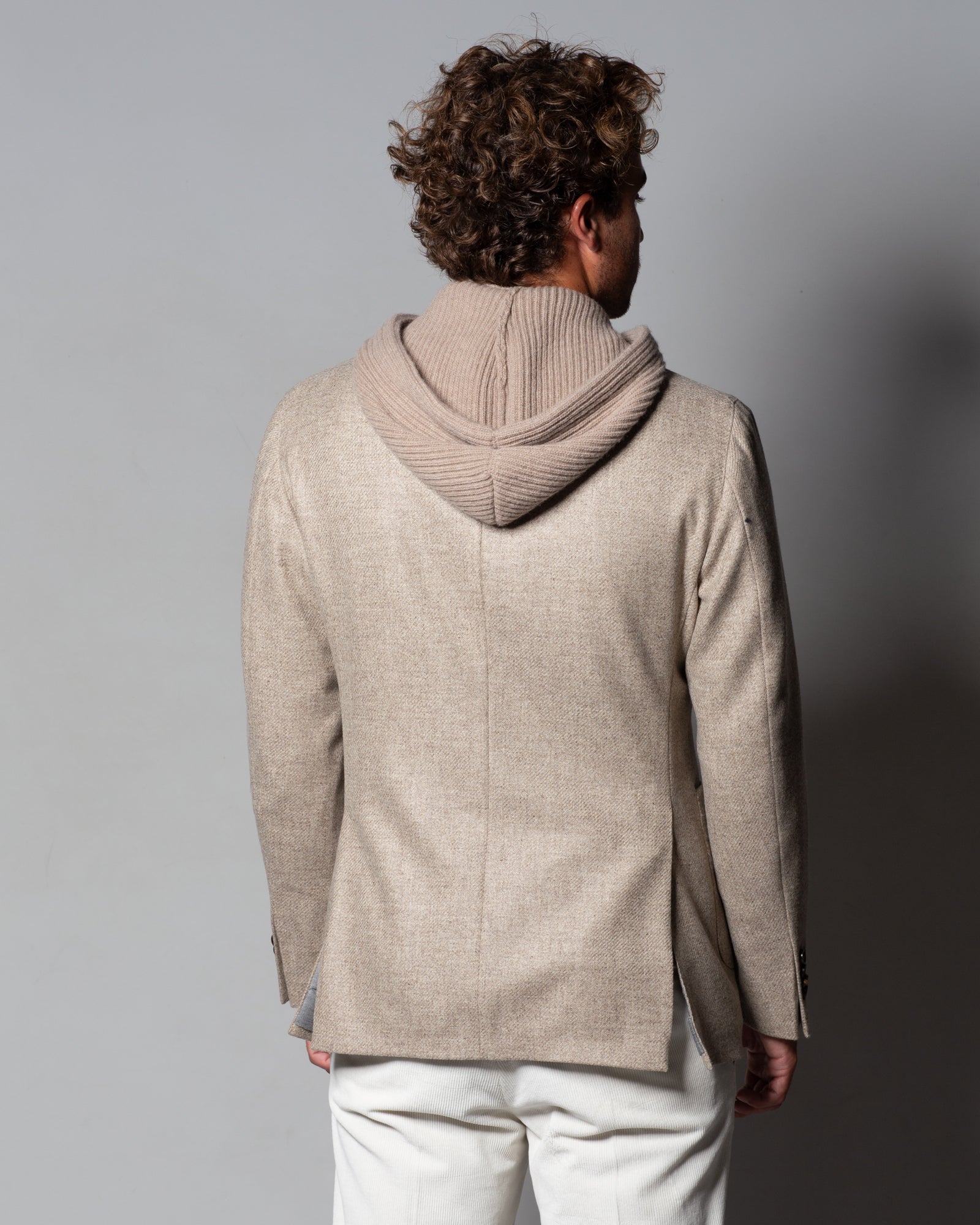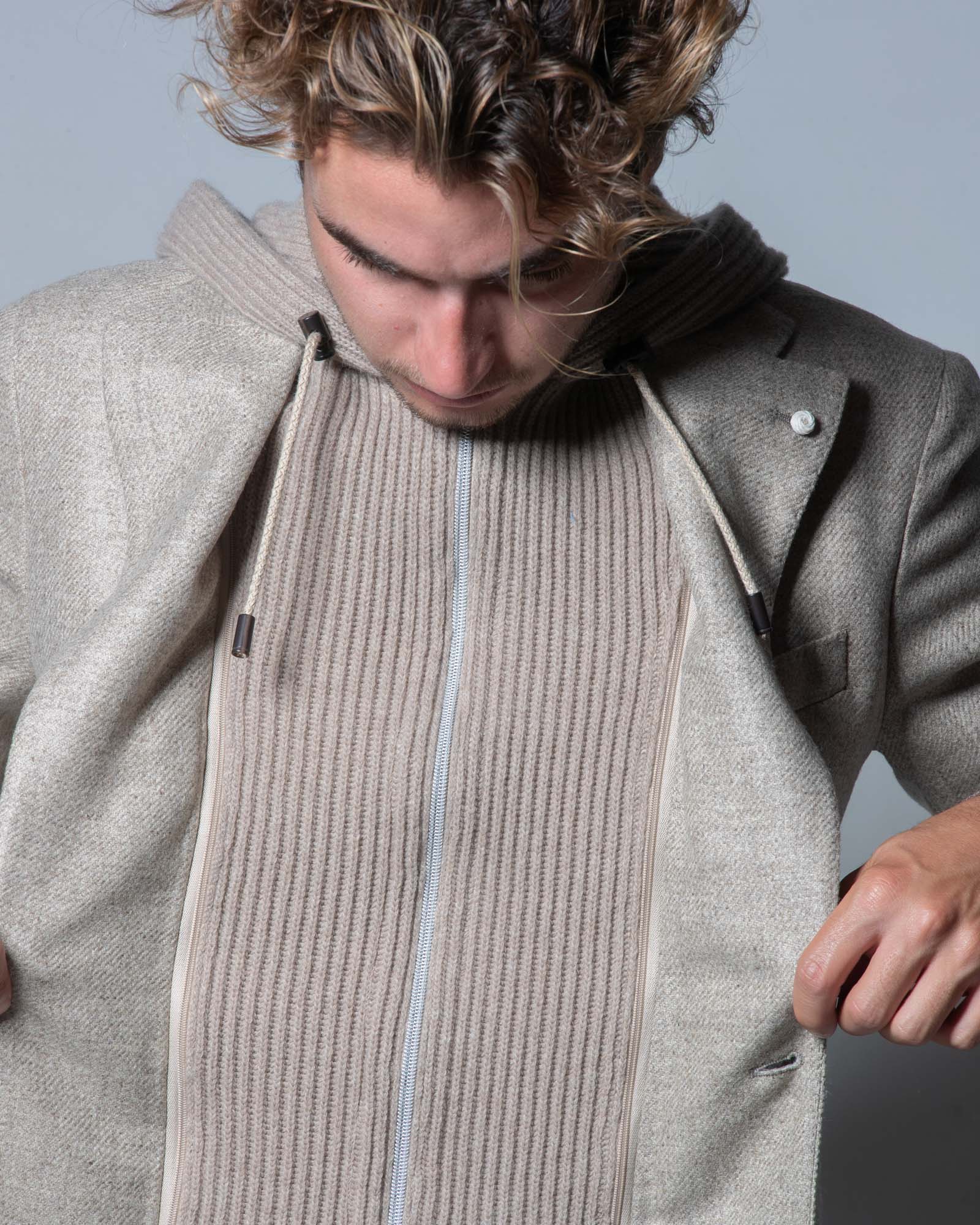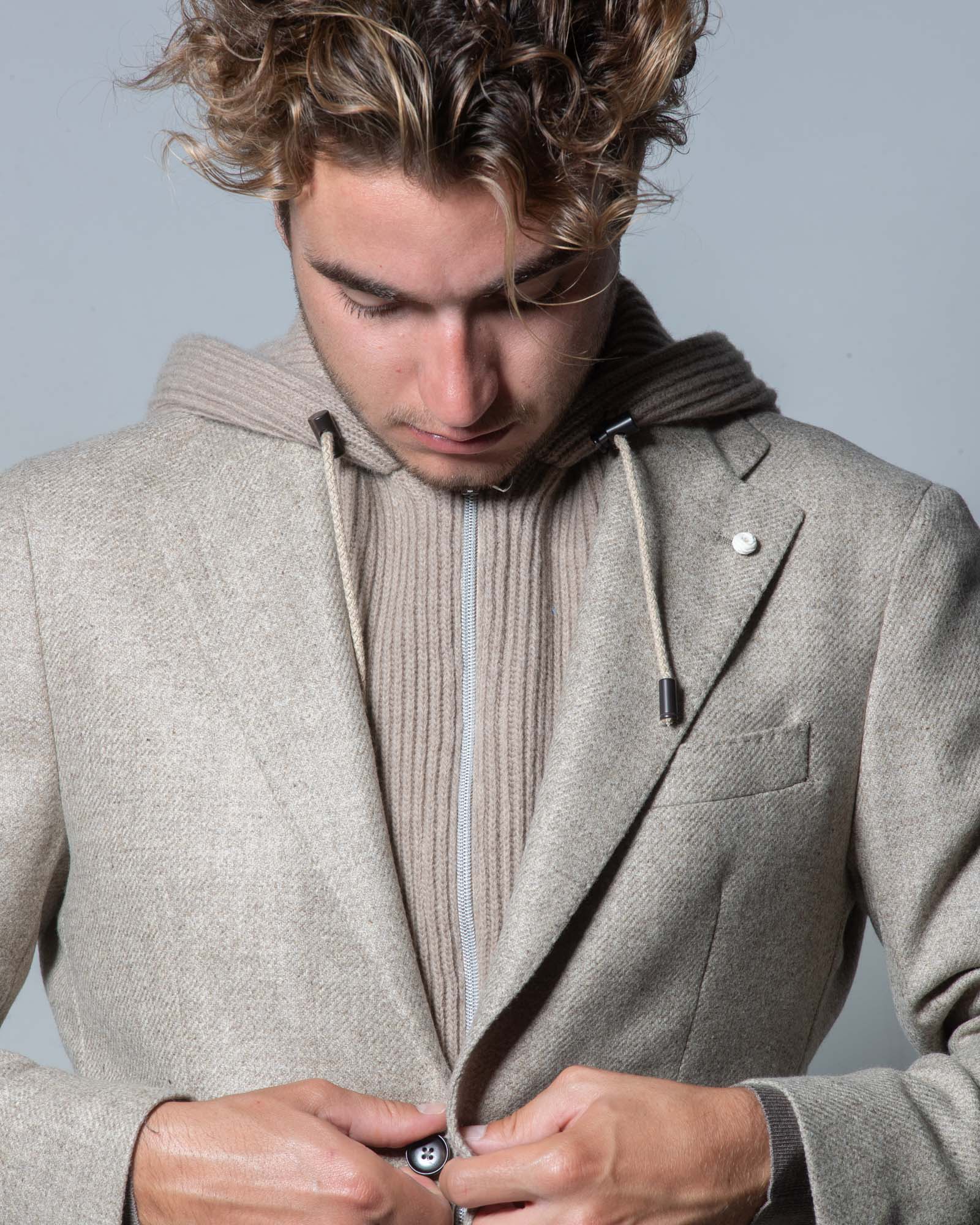 La pettorina in maglia a costa di cashmere con cappuccio, completamente estraibile tramite zip, aggiunge un dettaglio funzionale e moderno, rendendo il capo estremamente versatile. Il colore neutro, le tasche a toppa, i bottoni in corno a contrasto e gli spacchi laterali completano un insieme equilibrato tra tradizione sartoriale e spirito metropolitano.