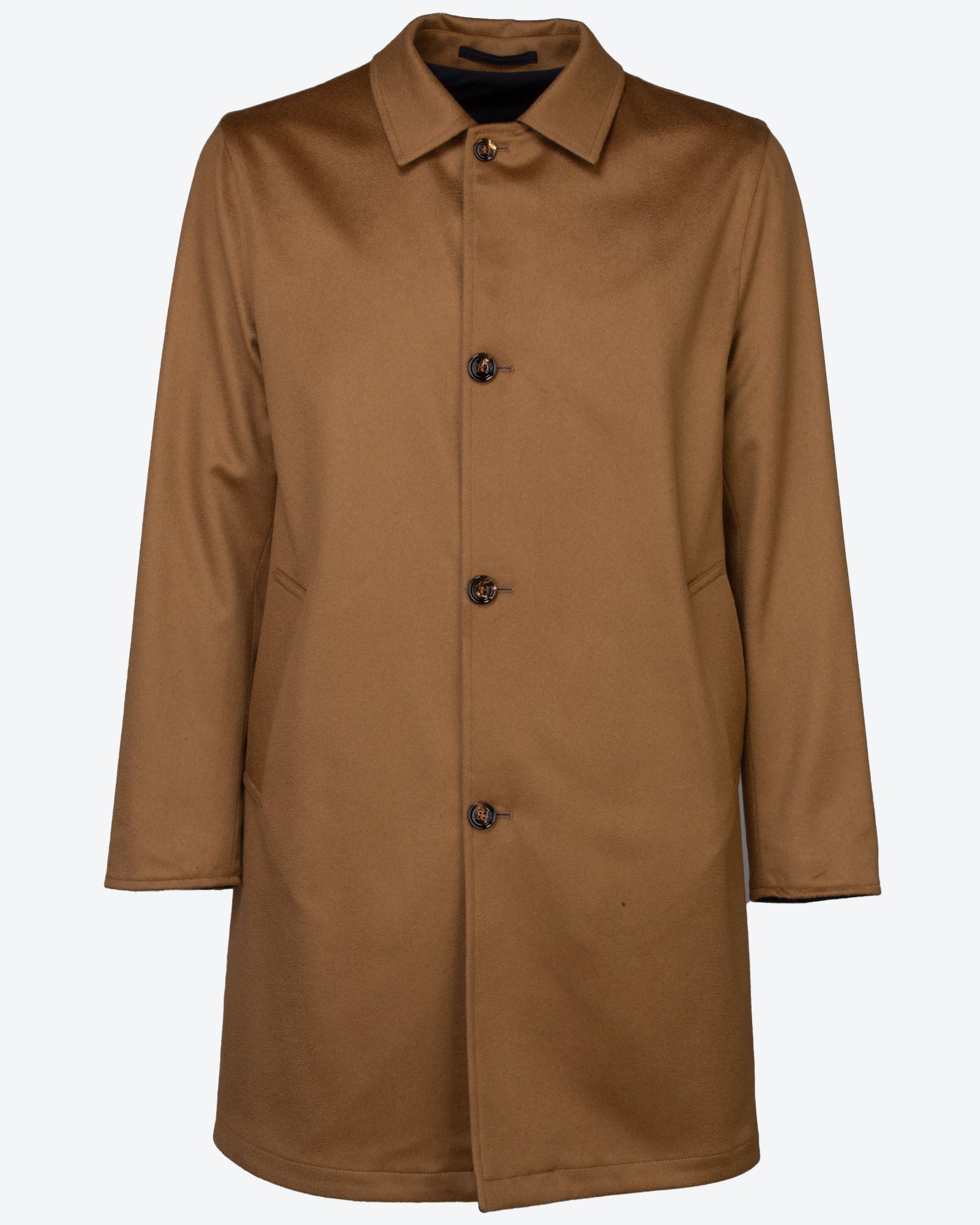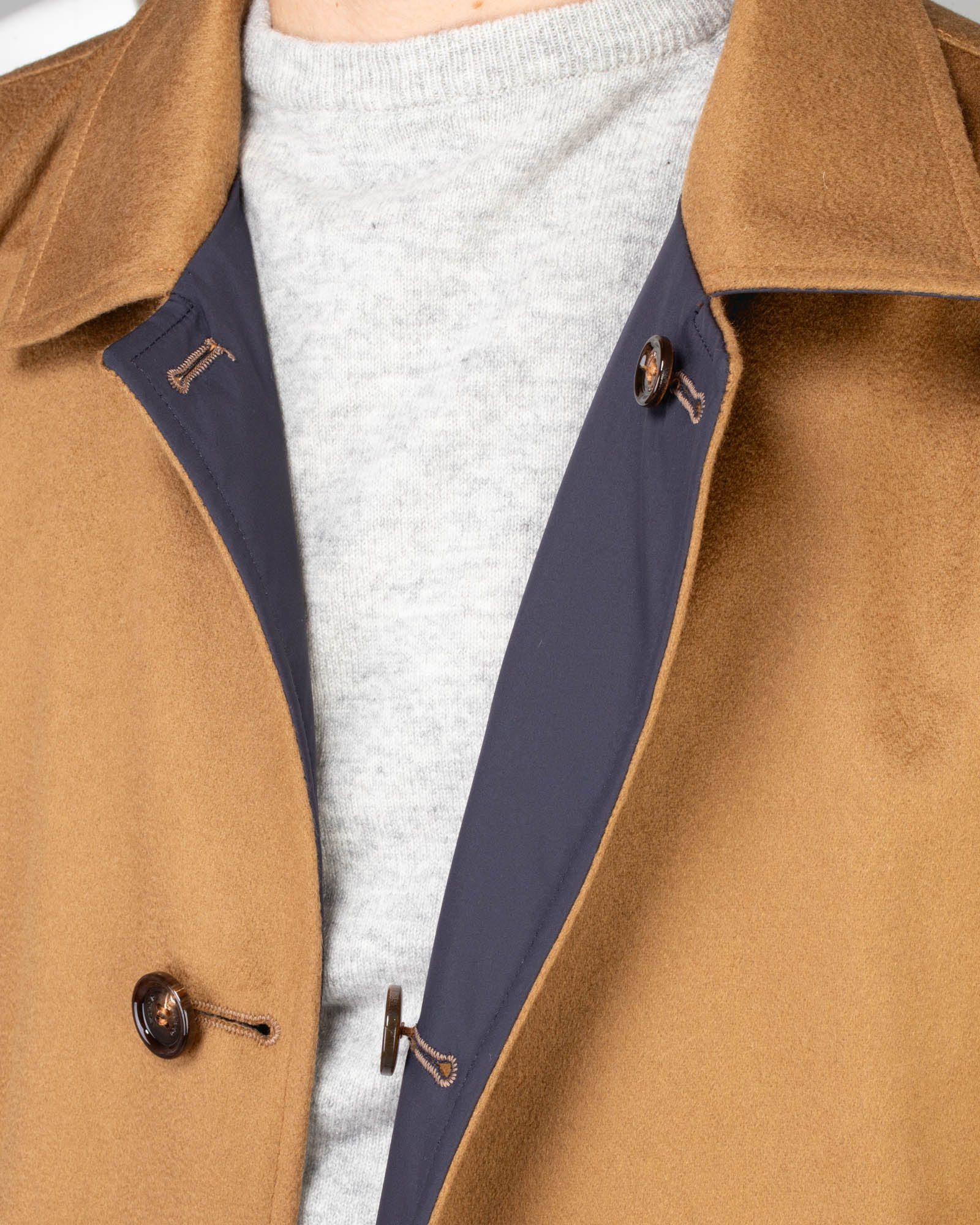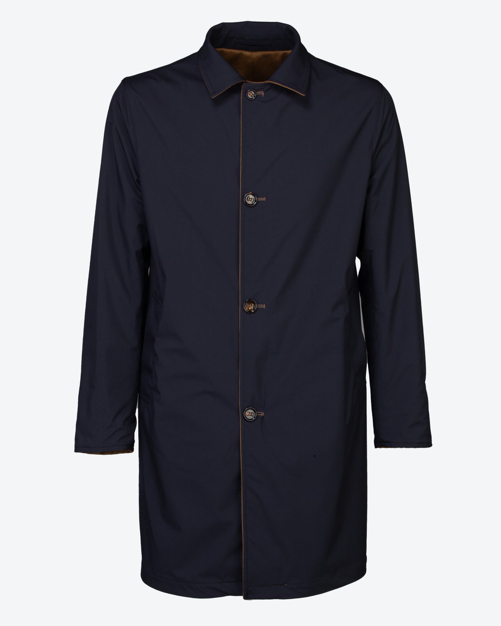 Uno dei capi più iconici del guardaroba del gentleman, il soprabito, in una perfetta combinazione dal gusto tutto italiano. Reversibile, abbina il pregiato cashmere dalla texture ultra soffice al poliestere, lavorarati con l'innovativo trattamento Storm System di Loro Piana, per un capo impermeabile e antivento.