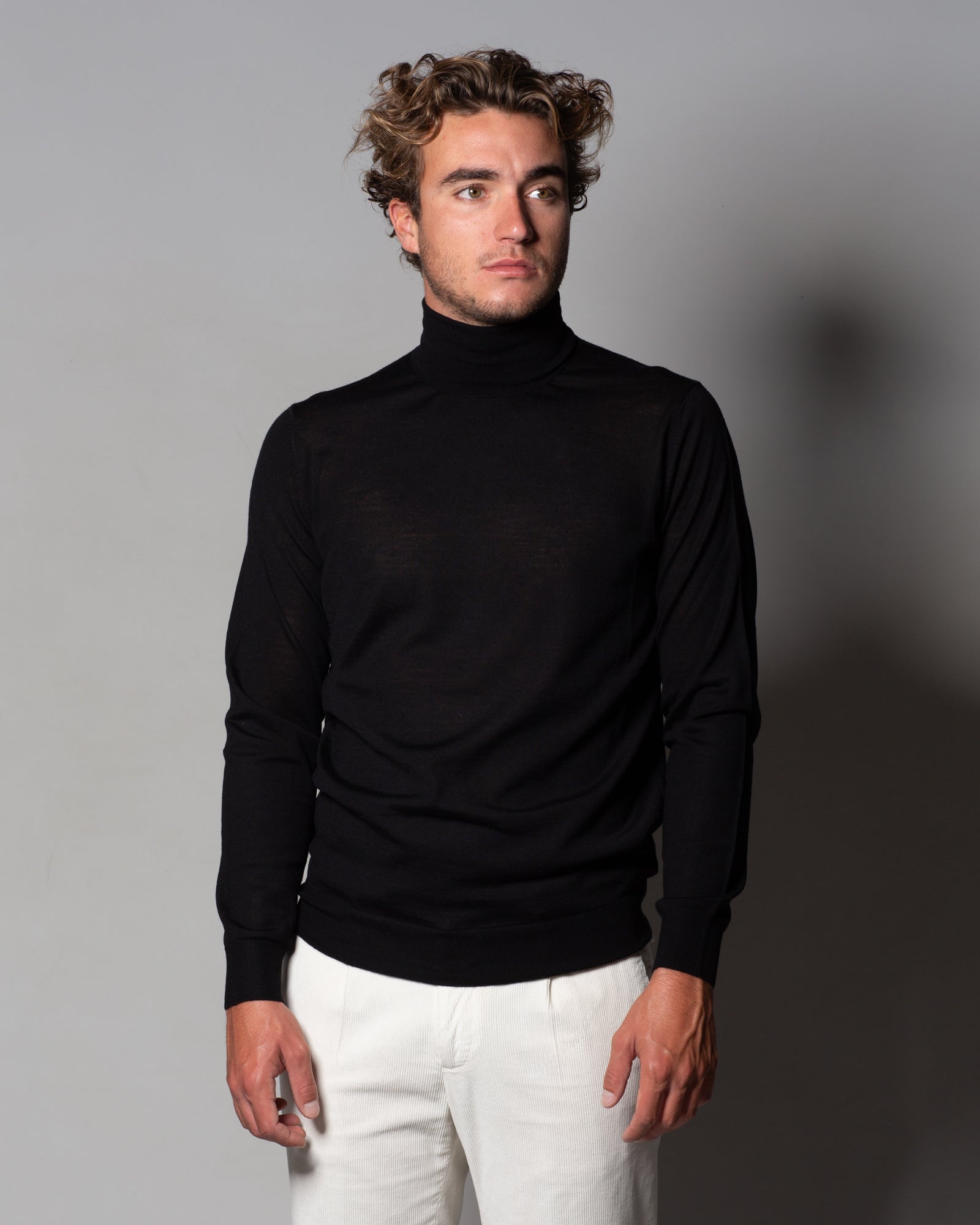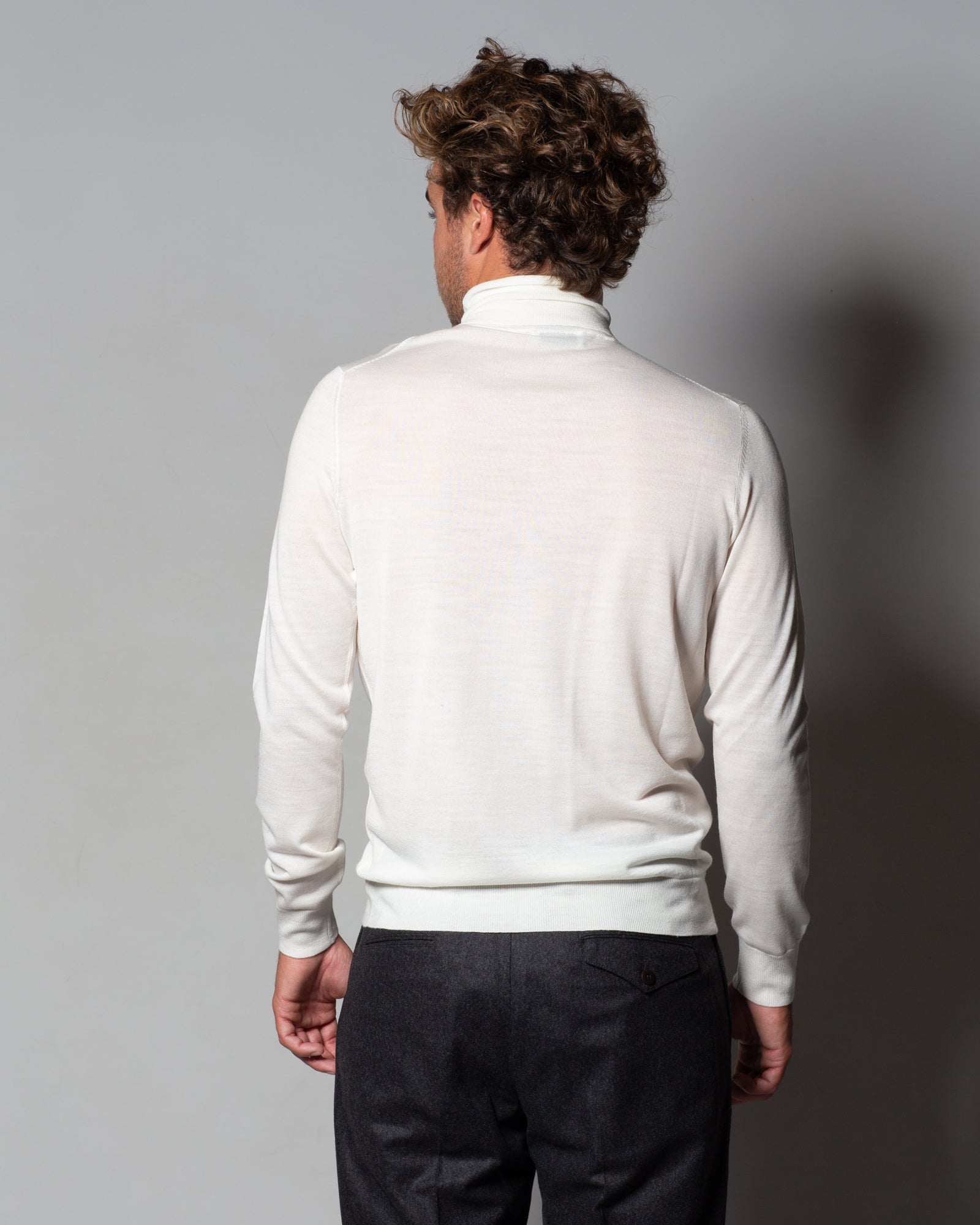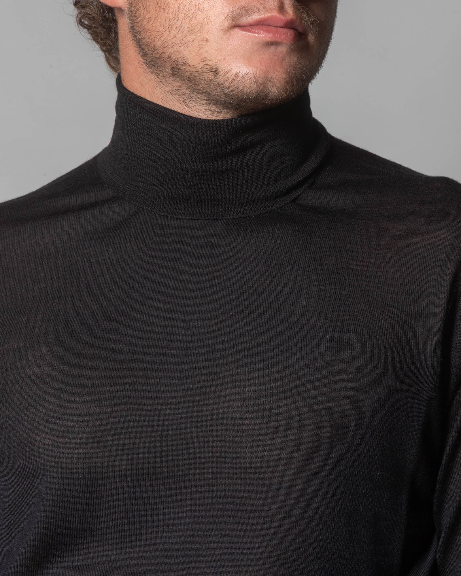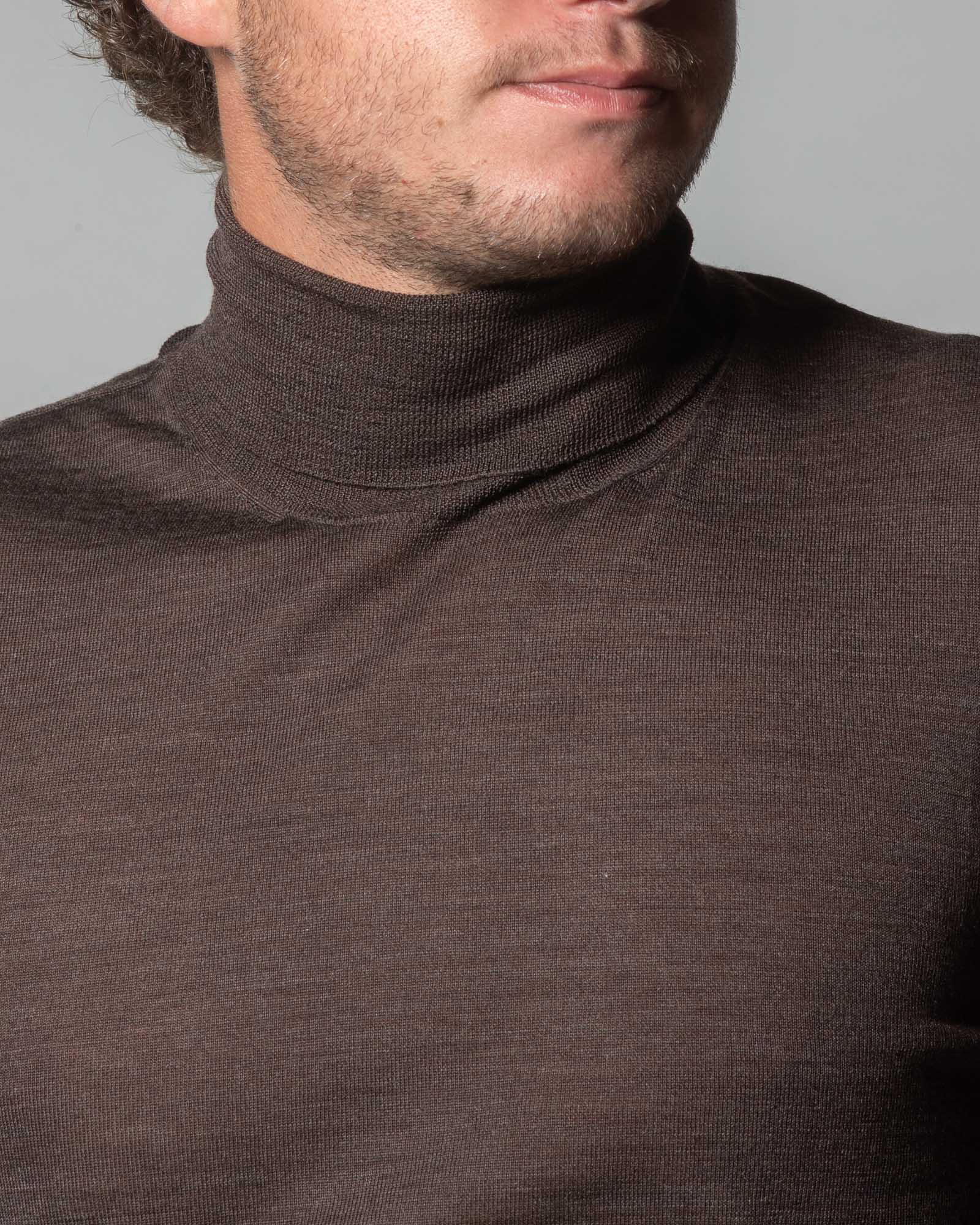 La texture morbida e termoregolante della merinos avvolge con naturalezza, mentre il collo alto e i bordi a costine su fondo e polsi completano un capo versatile e impeccabile. Perfetto sotto la giacca per un tocco sofisticato o da solo per un’eleganza sobria e contemporanea.