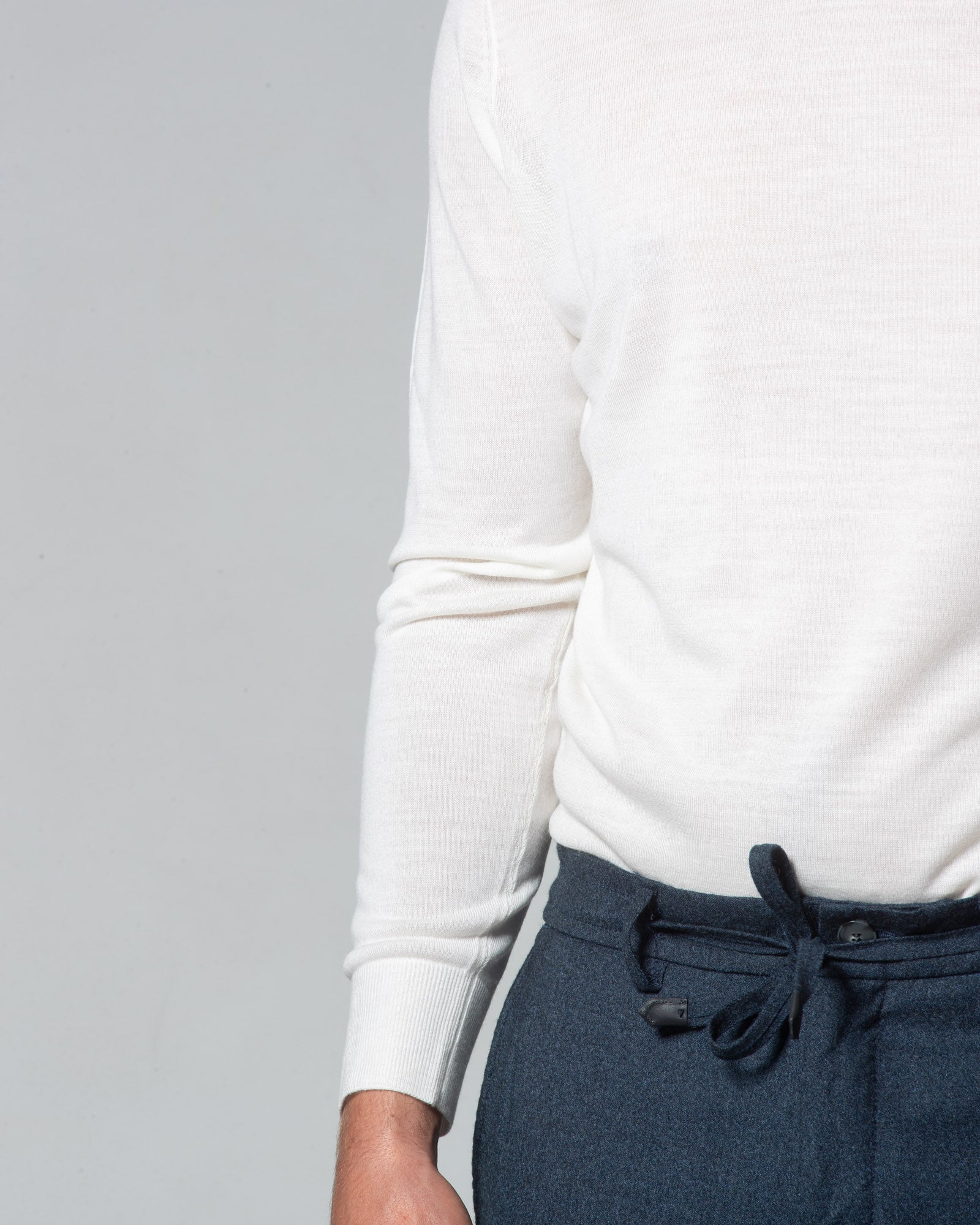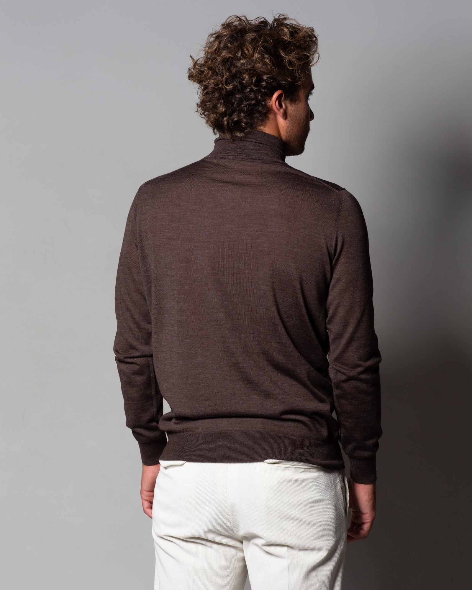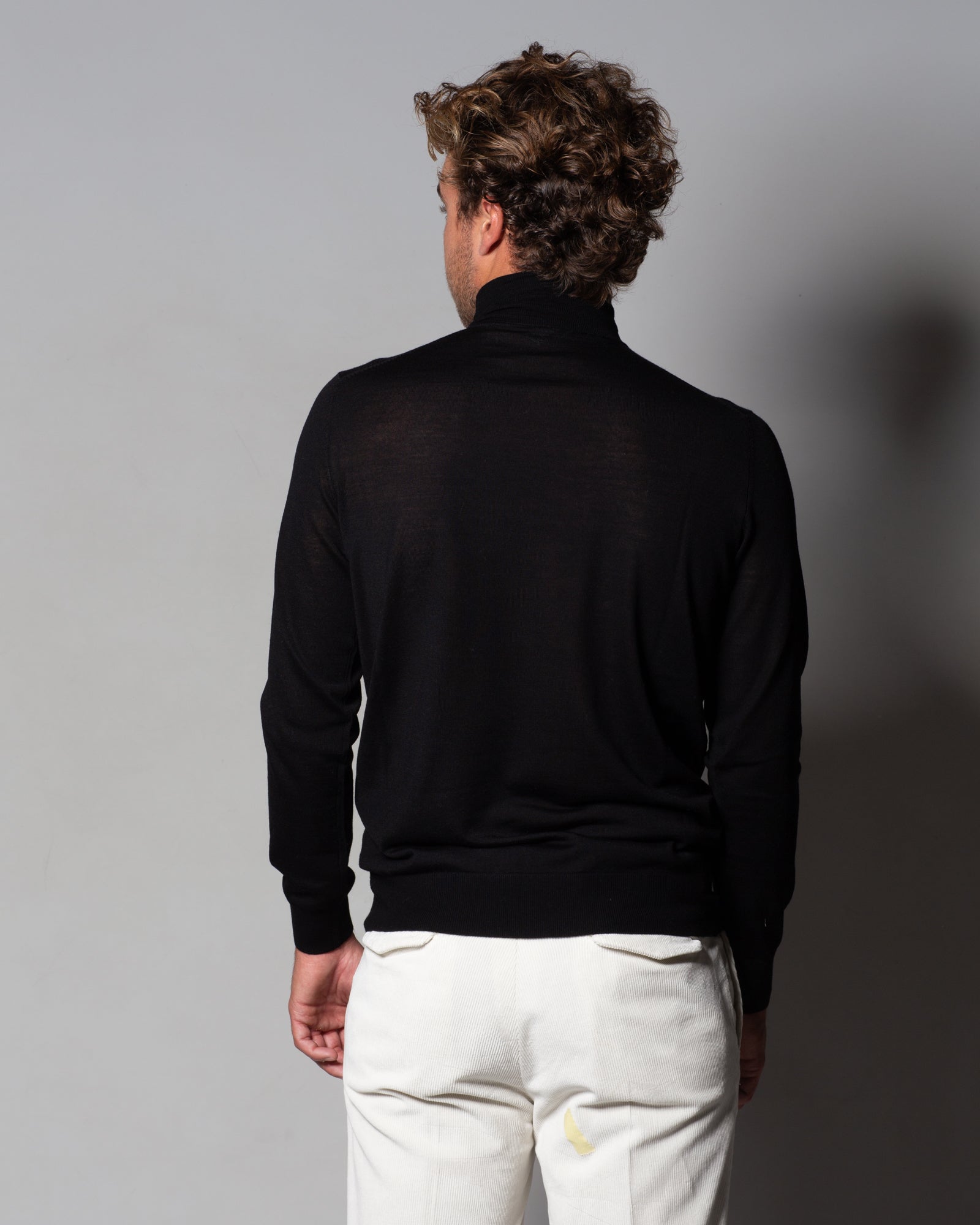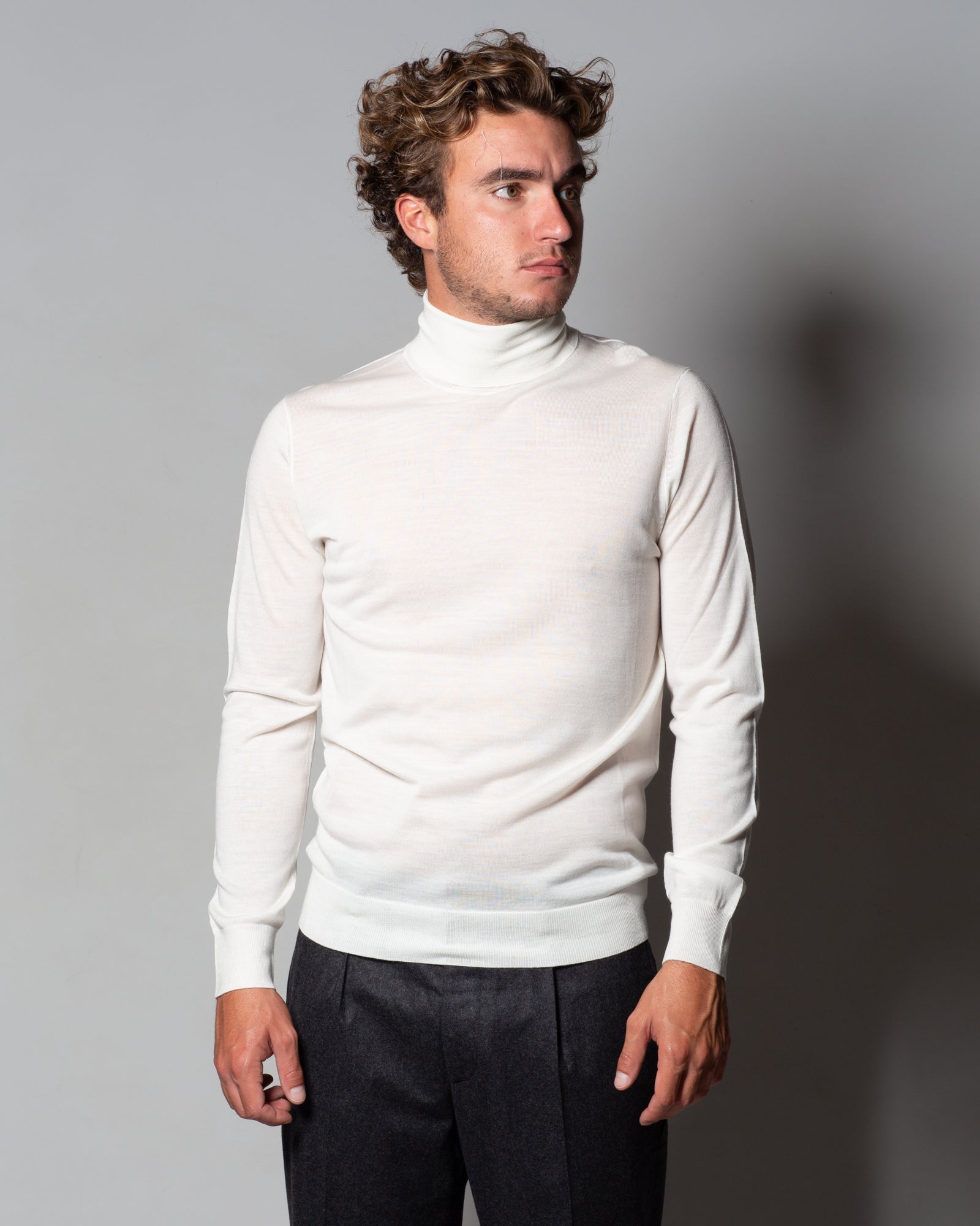 La texture morbida e termoregolante della merinos avvolge con naturalezza, mentre il collo alto e i bordi a costine su fondo e polsi completano un capo versatile e impeccabile. Perfetto sotto la giacca per un tocco sofisticato o da solo per un’eleganza sobria e contemporanea.