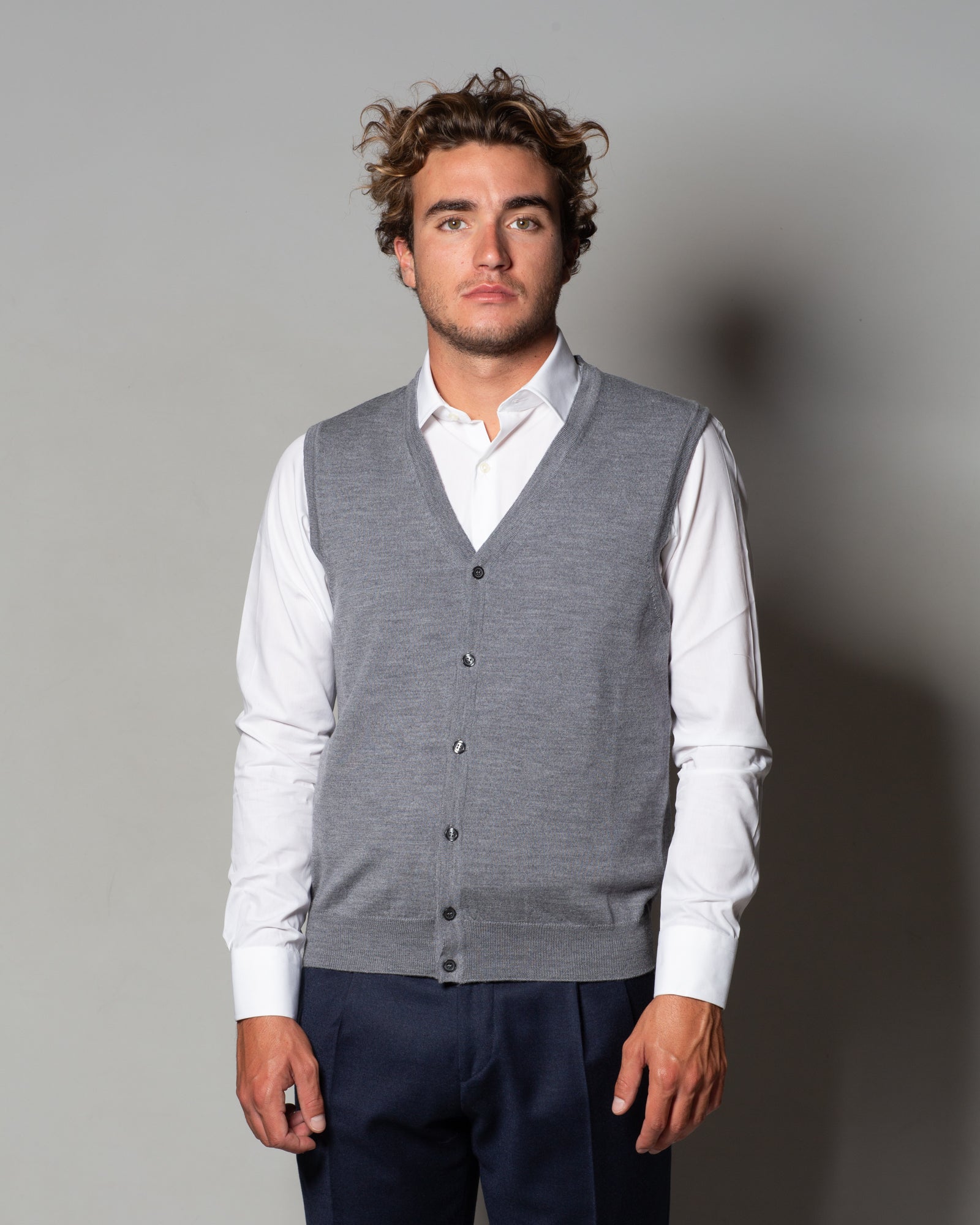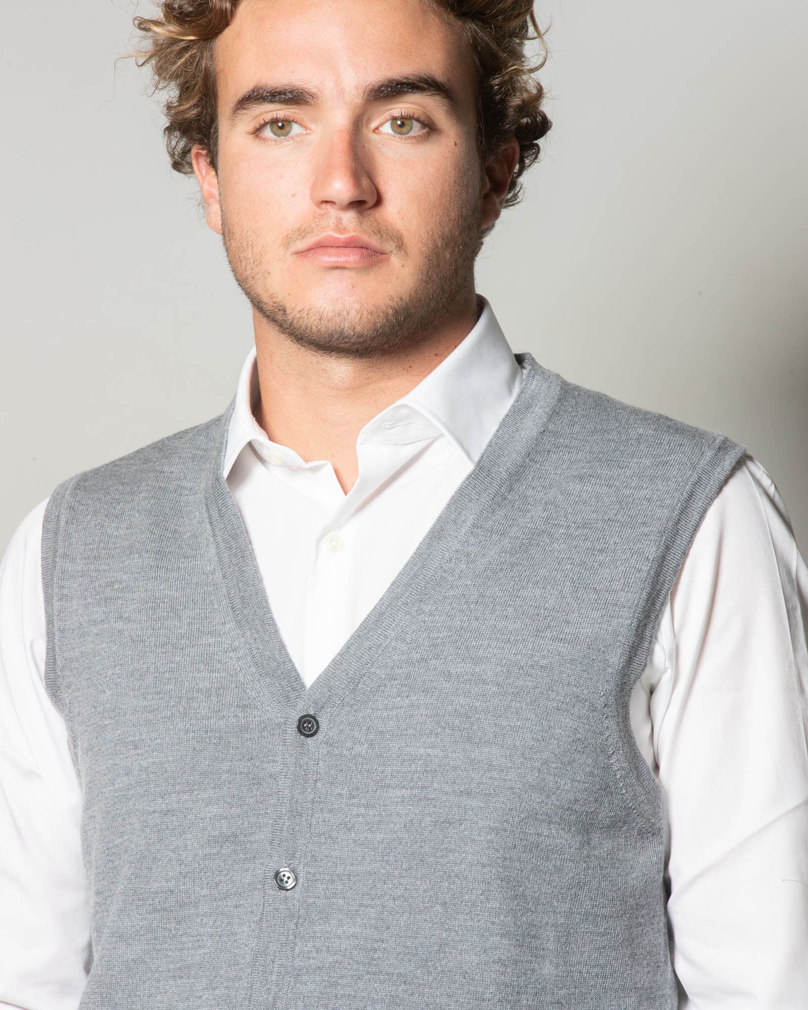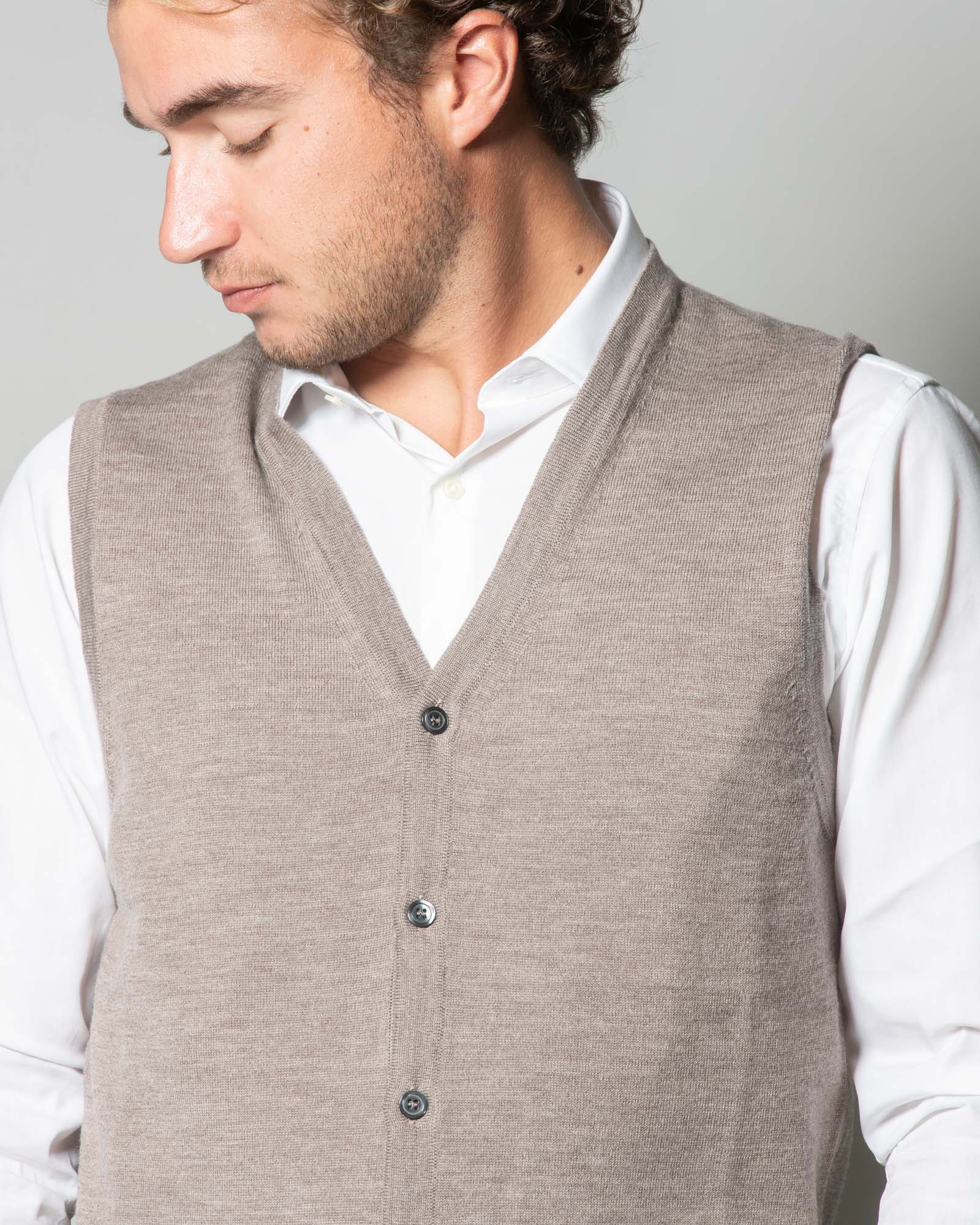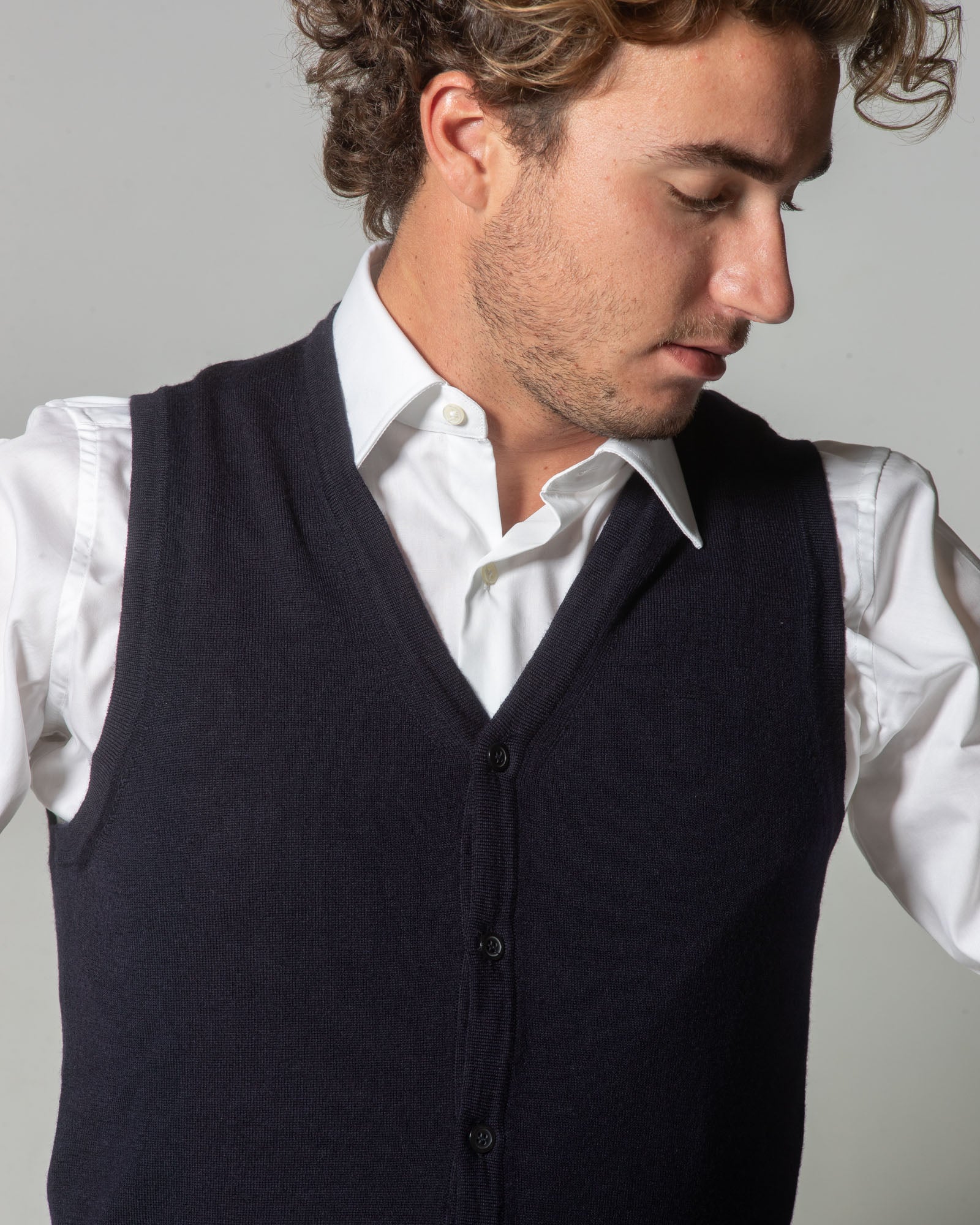 Il gilet smanicato Macciocu rappresenta l’essenza del nostro modo di intendere la maglieria italiana: qualità autentica, filiera corta e cura artigianale dei dettagli. Realizzato in pura lana merinos extrafine, è un capo leggero ma caldo, ideale per completare abbinamenti eleganti o più informali con naturalezza.