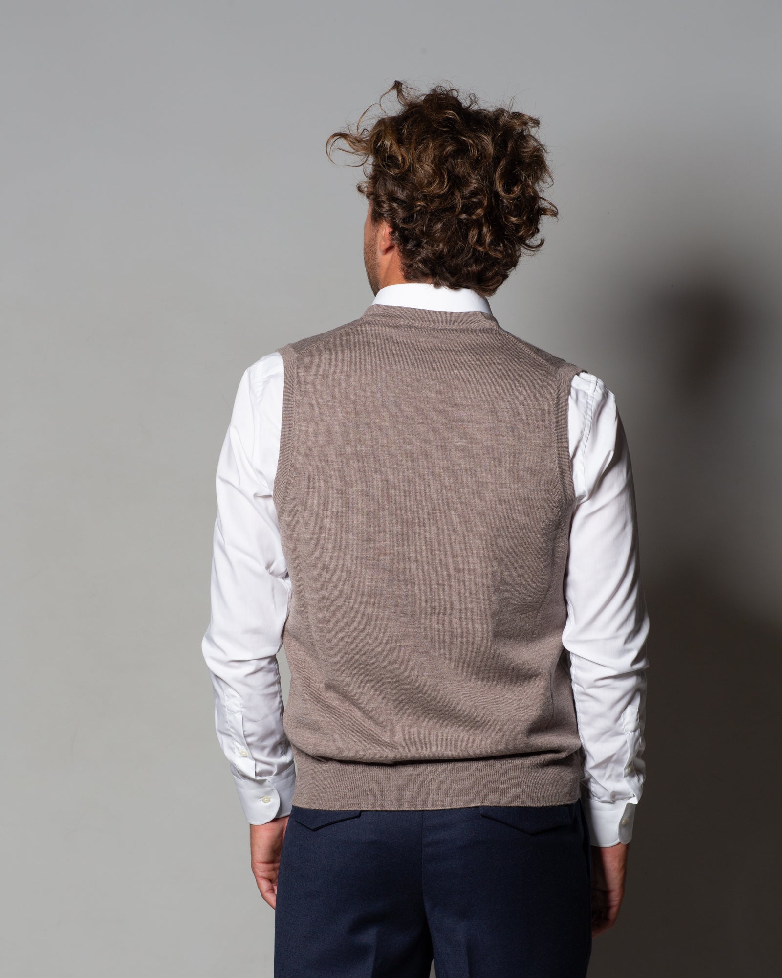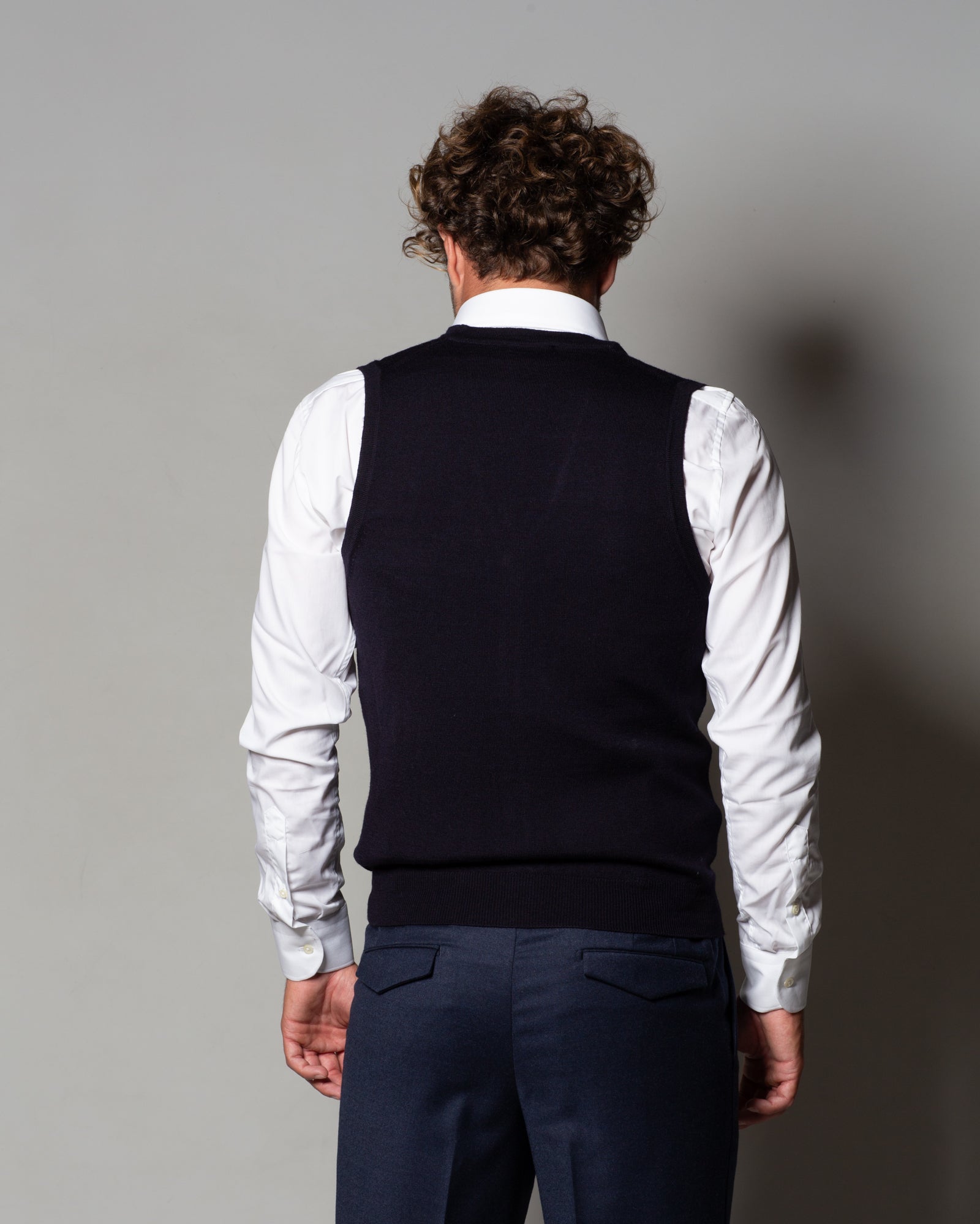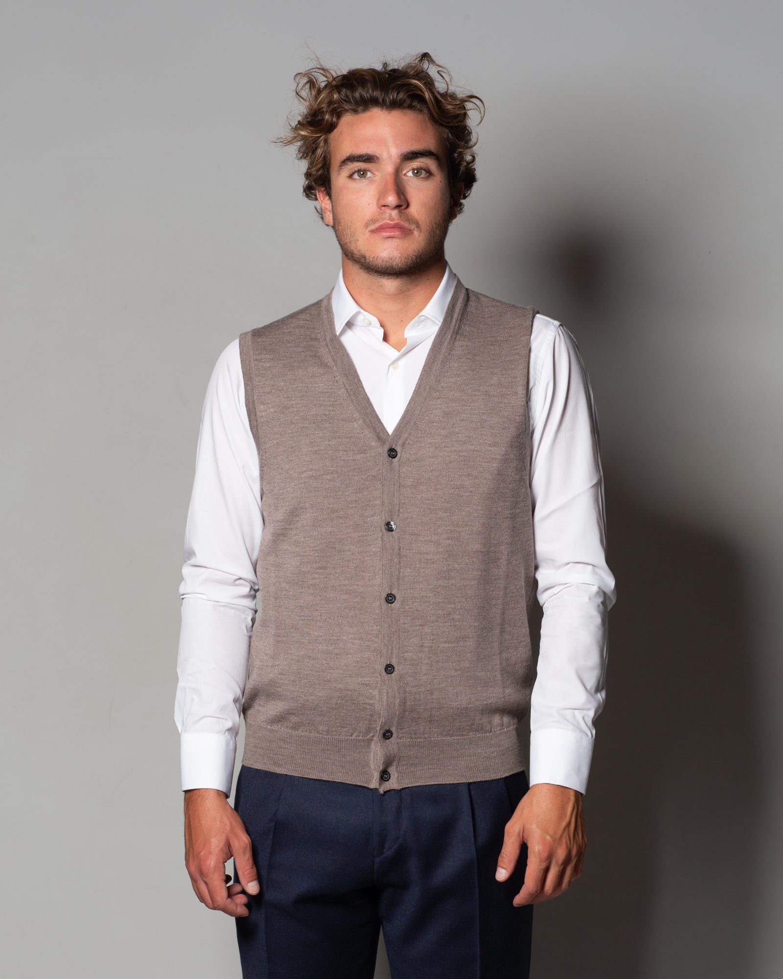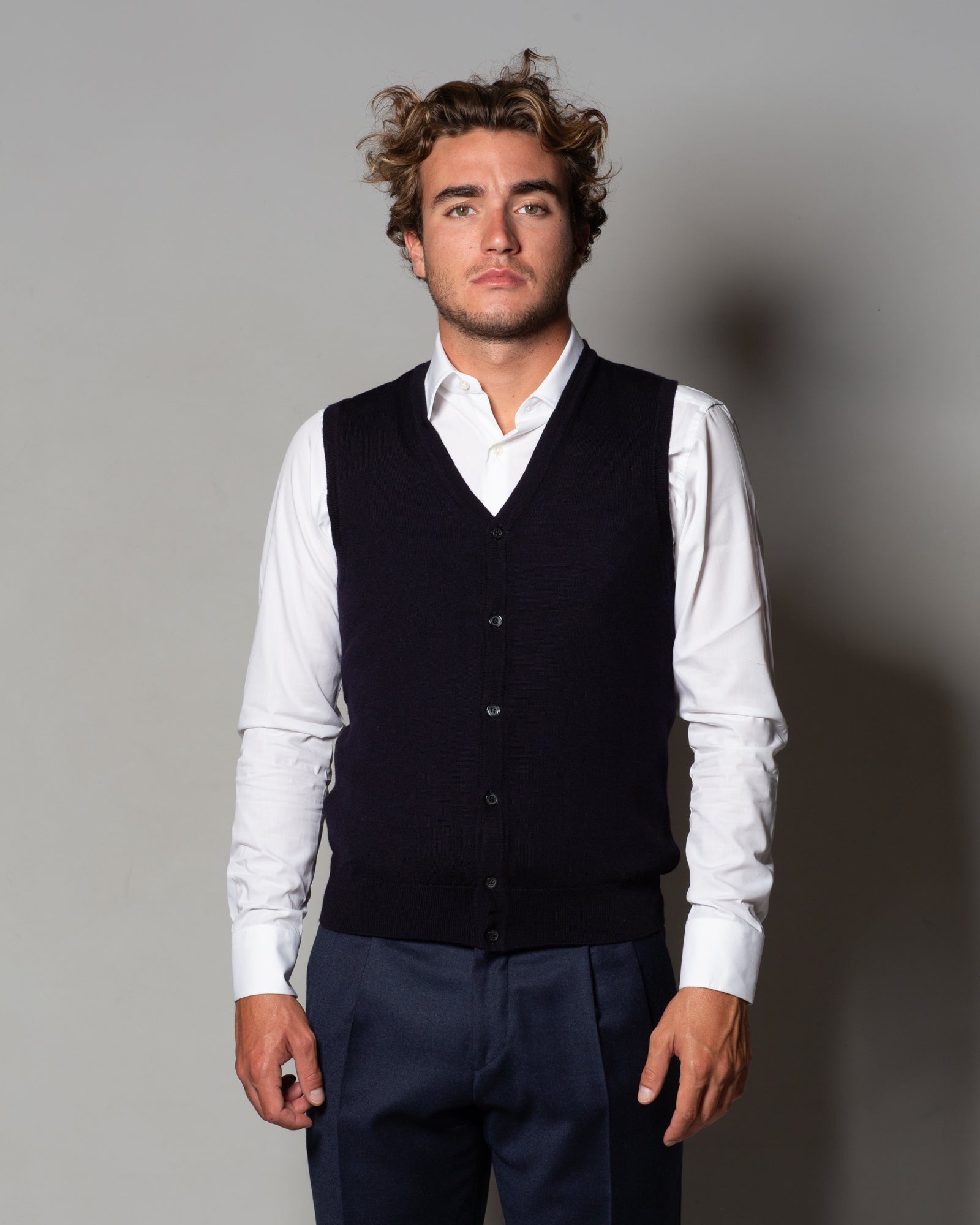 Il gilet smanicato Macciocu rappresenta l’essenza del nostro modo di intendere la maglieria italiana: qualità autentica, filiera corta e cura artigianale dei dettagli. Realizzato in pura lana merinos extrafine, è un capo leggero ma caldo, ideale per completare abbinamenti eleganti o più informali con naturalezza.