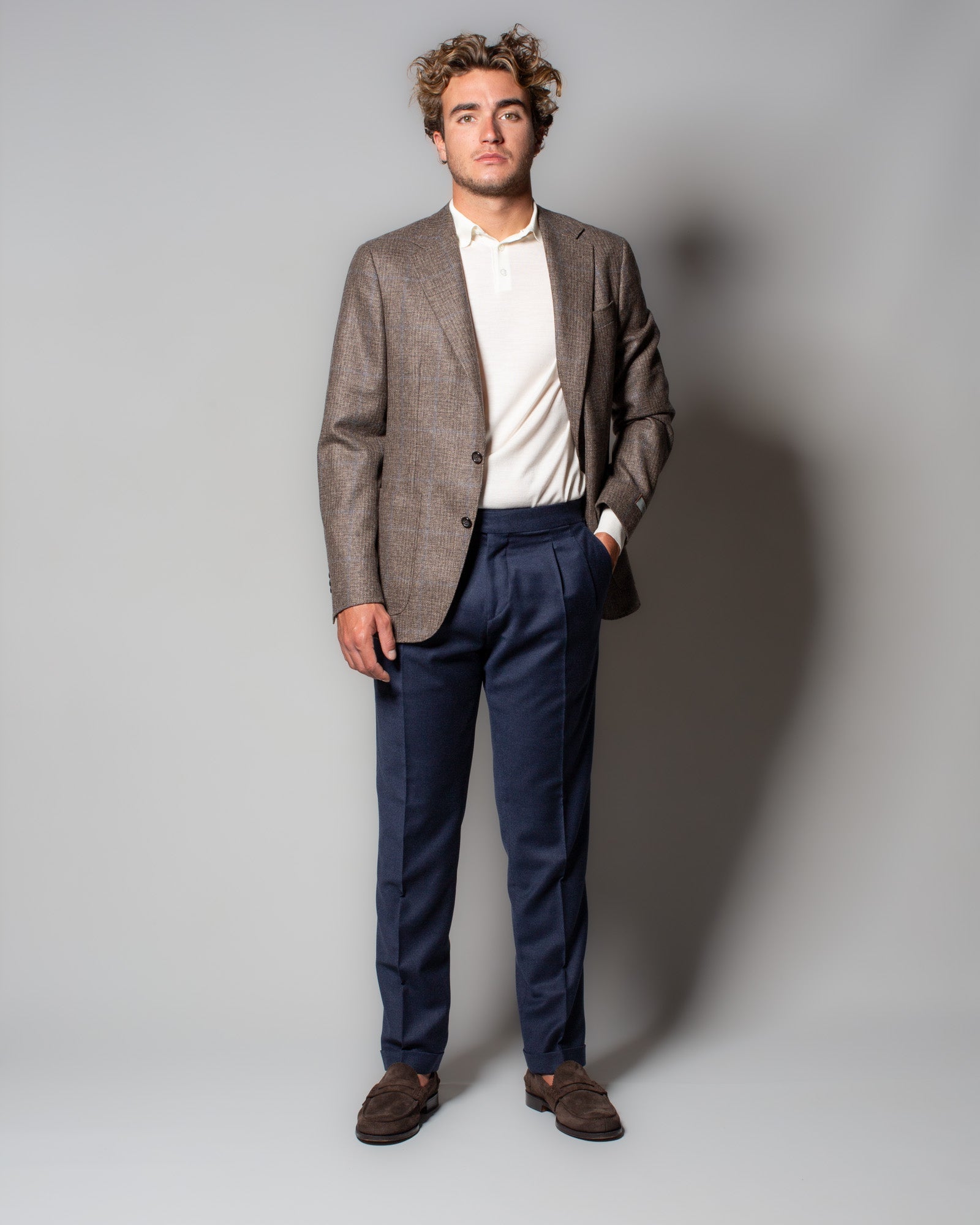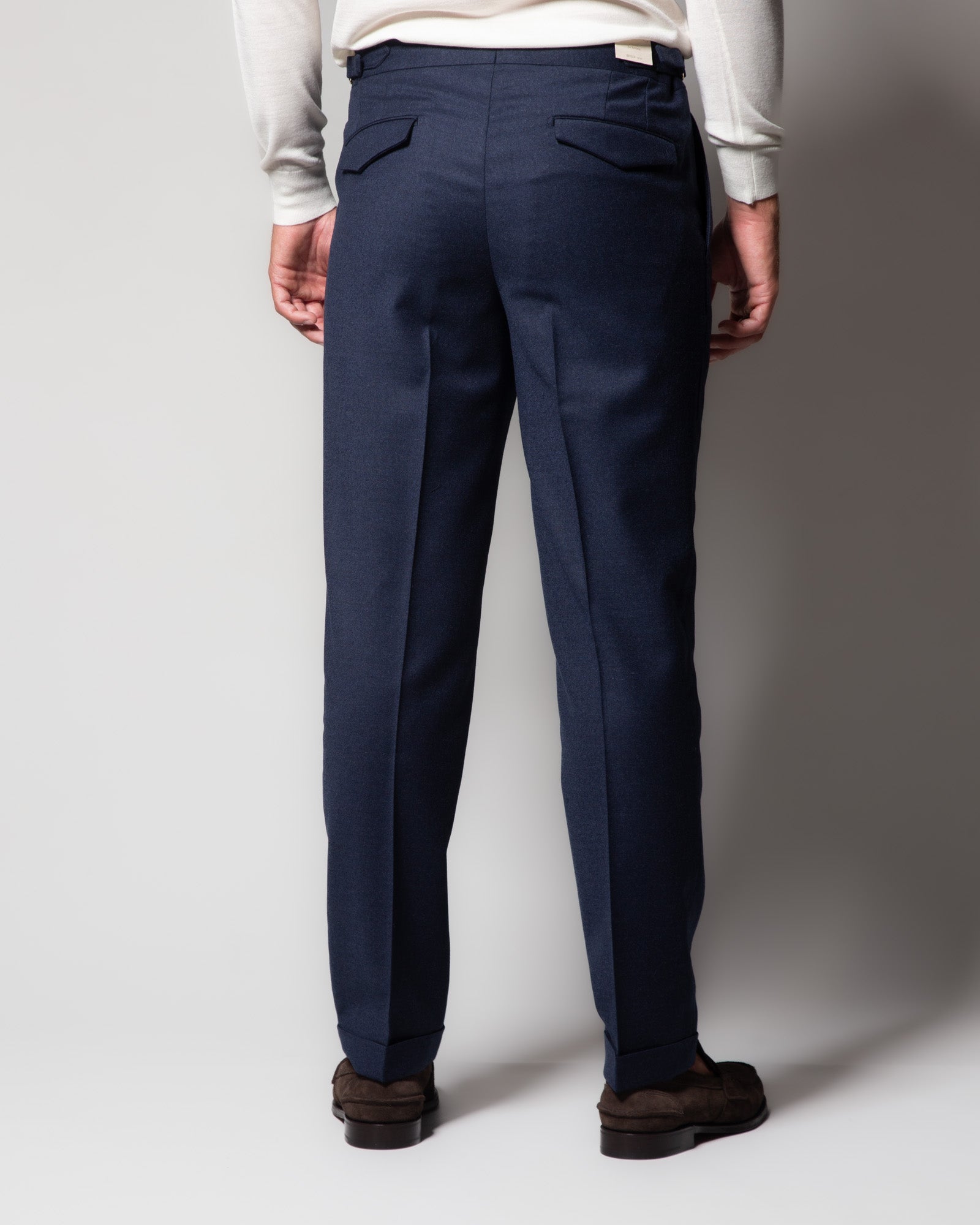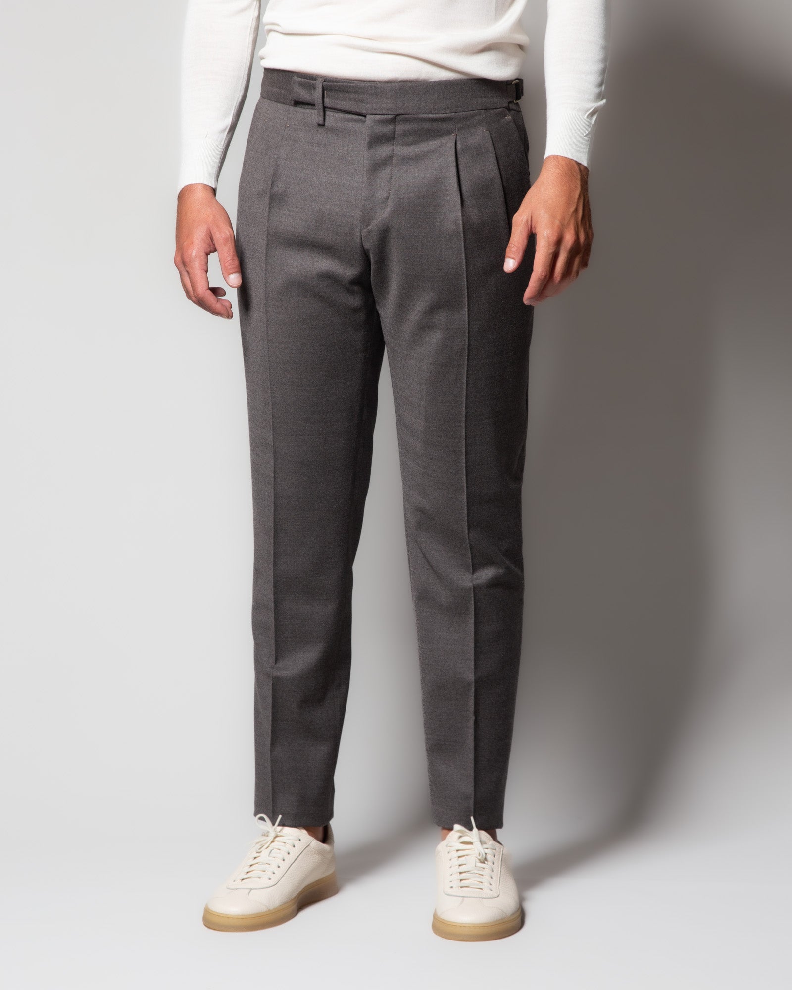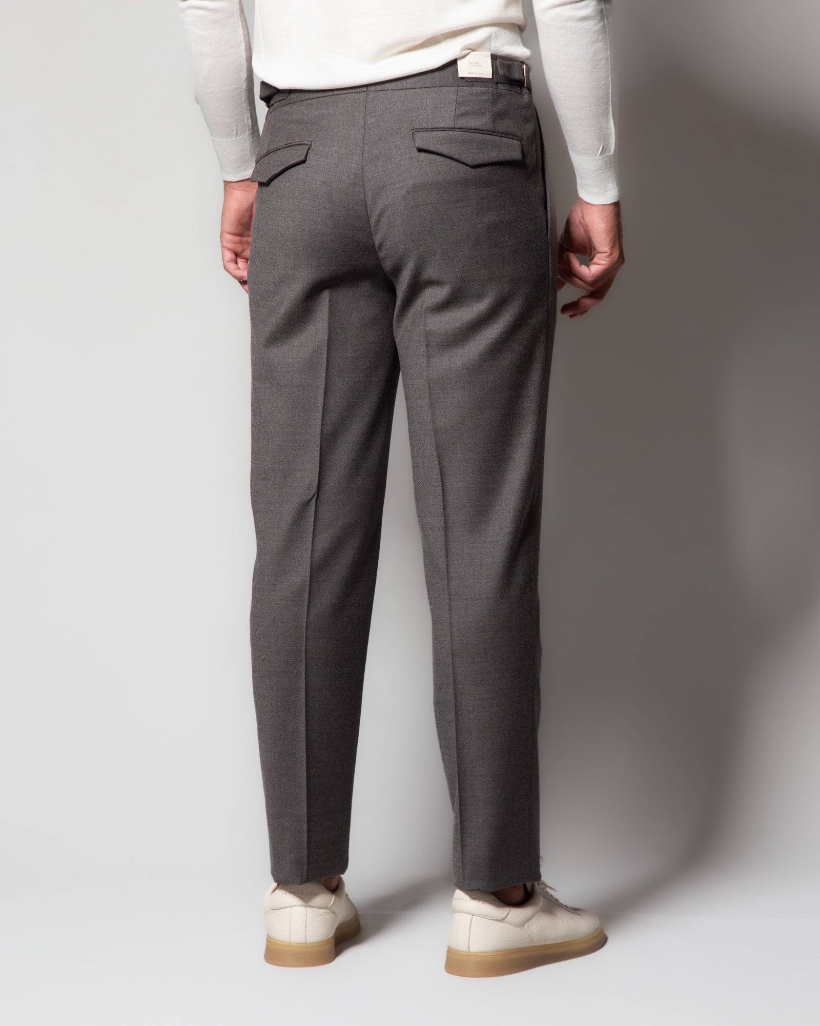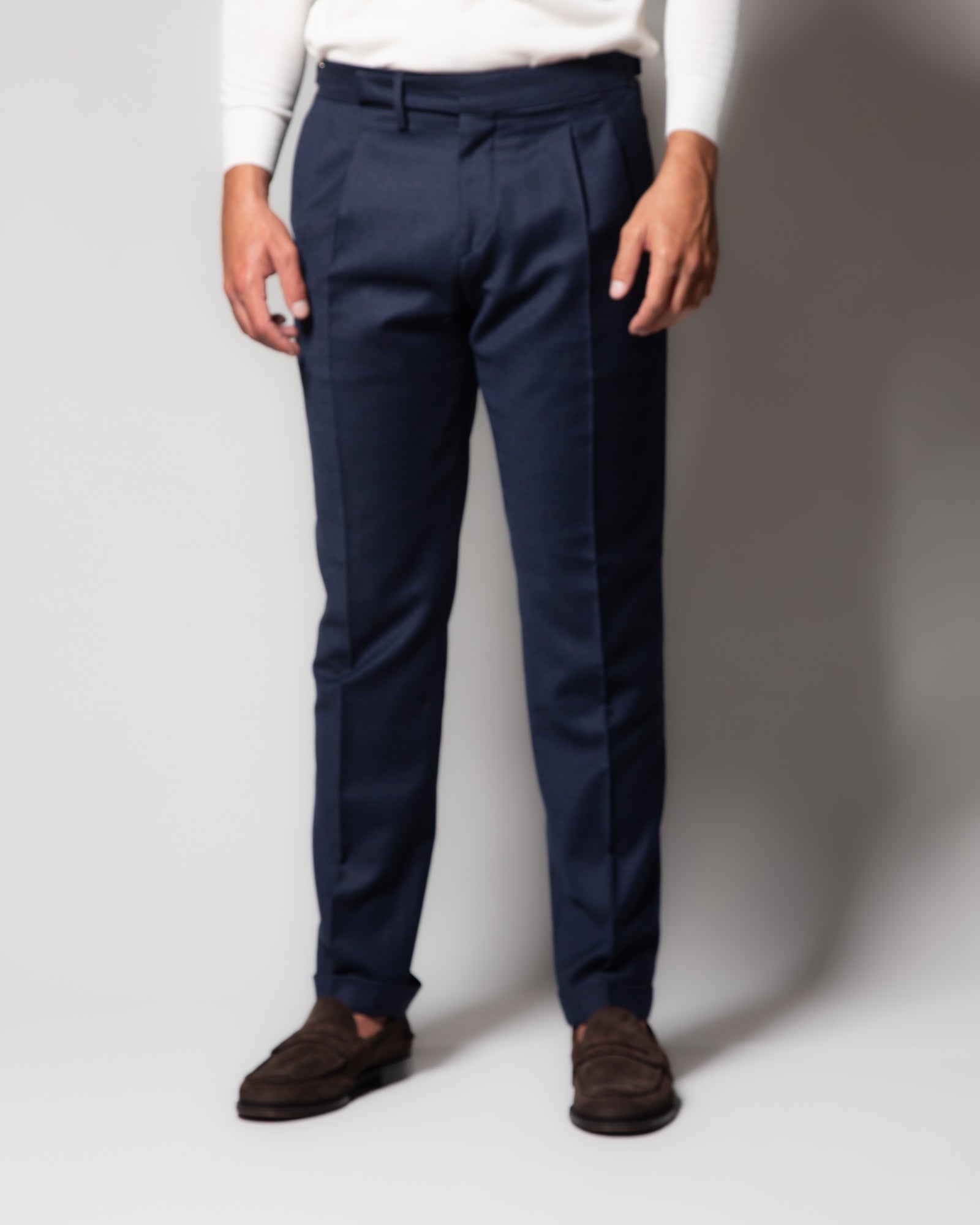 La doppia pinces frontale e il cinturino regolabile in vita richiamano la tradizione sartoriale, mentre la vestibilità regular e i dettagli funzionali come le tasche america e le tasche posteriori a filo con pattina completano un capo versatile, perfetto sia con giacca e camicia che con maglia e mocassini per un’eleganza disinvolta.