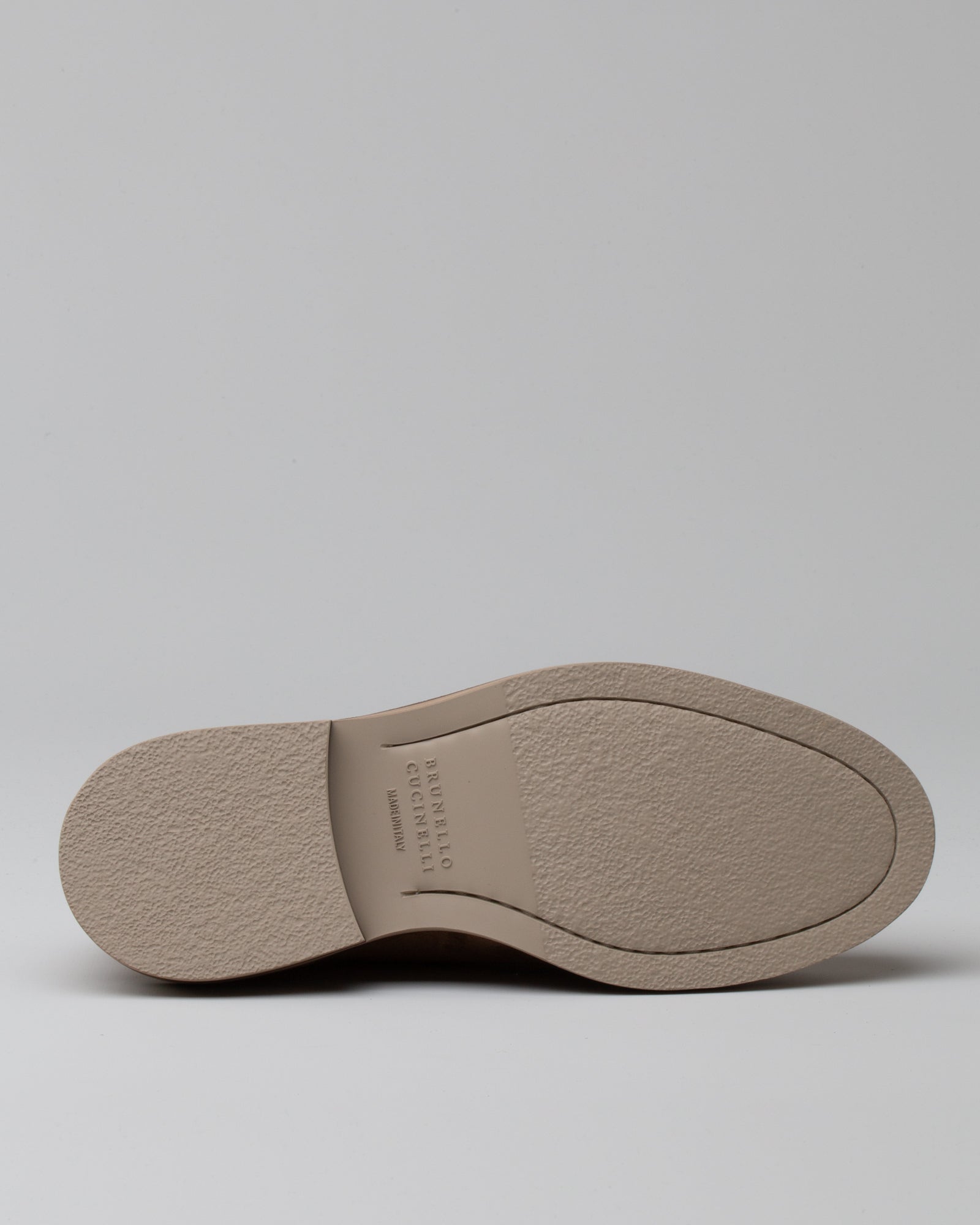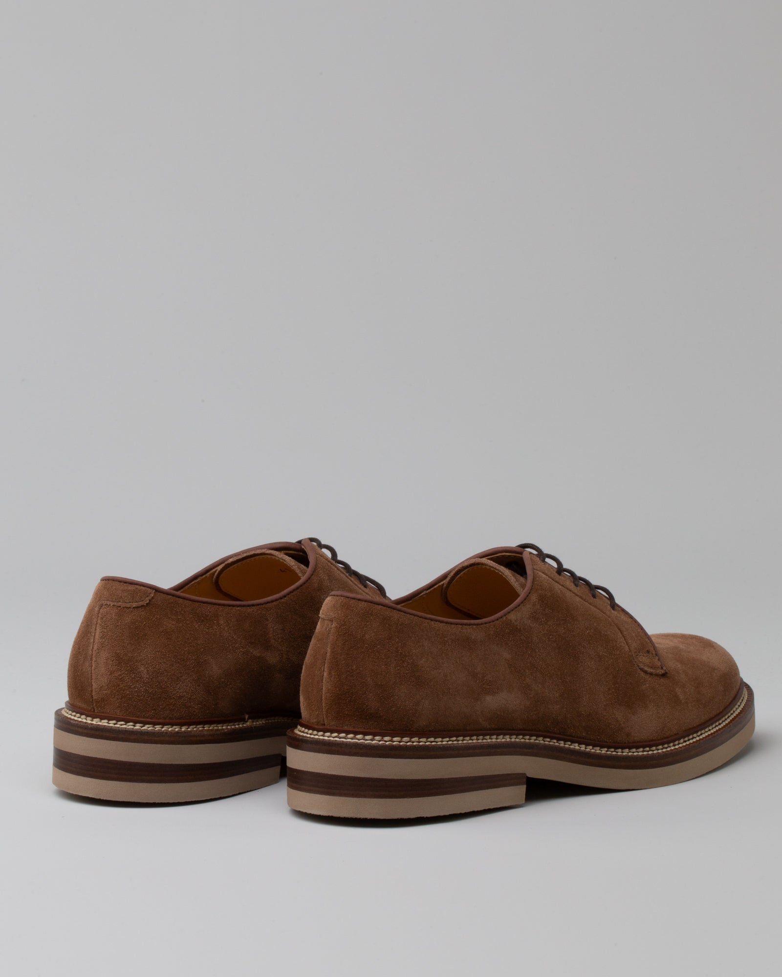 This suede lace-up derby shoe captures the essence of Brunello Cucinelli's refined and understated style. The upper in soft dove gray suede, combined with a stitched sole in non-slip rubber, enhances a simple and elegant silhouette, perfect for any occasion. A timeless classic that combines the sobriety of the design with an unparalleled artisan quality. Ideal for those who want an accessory that speaks of taste and distinction with ease.