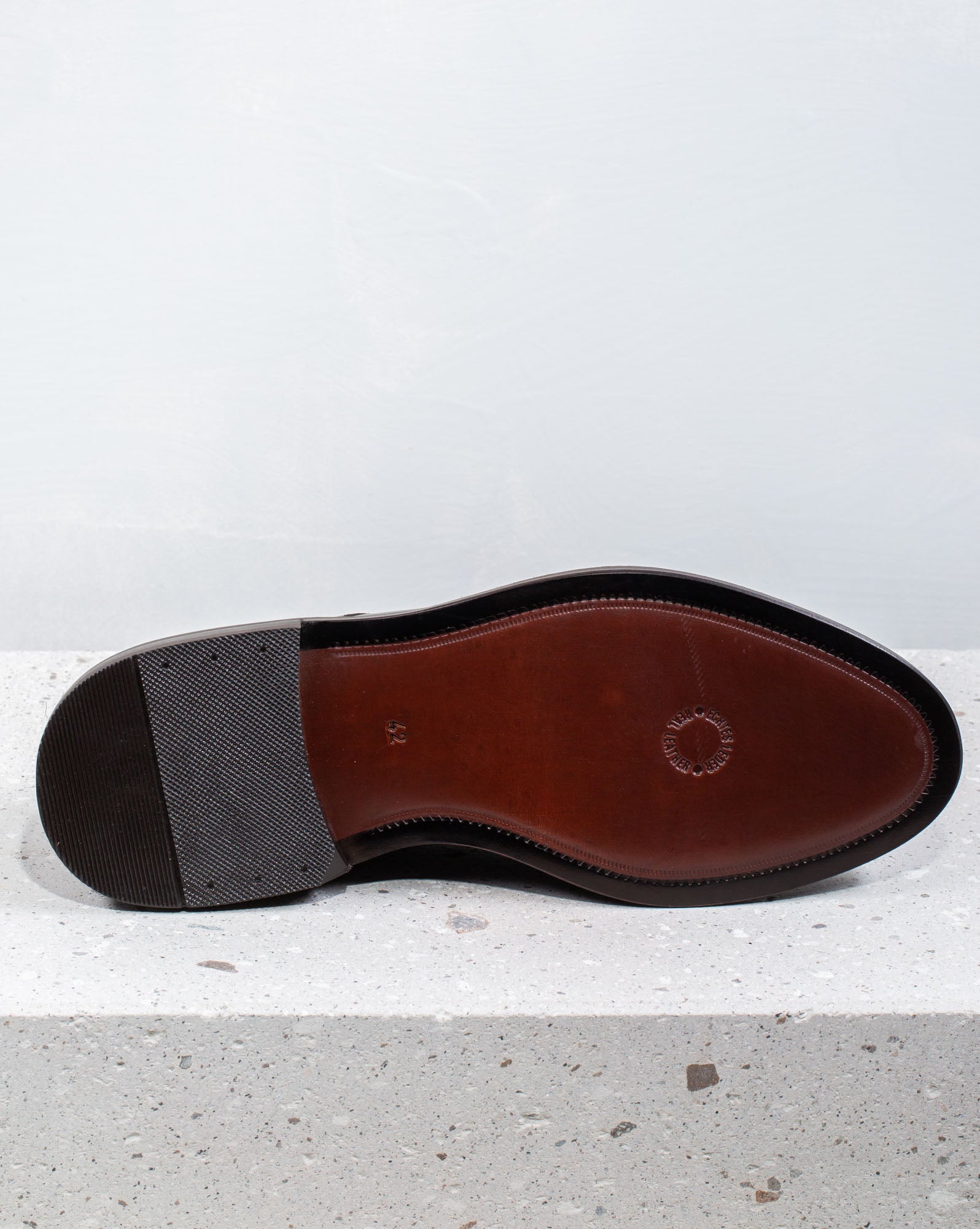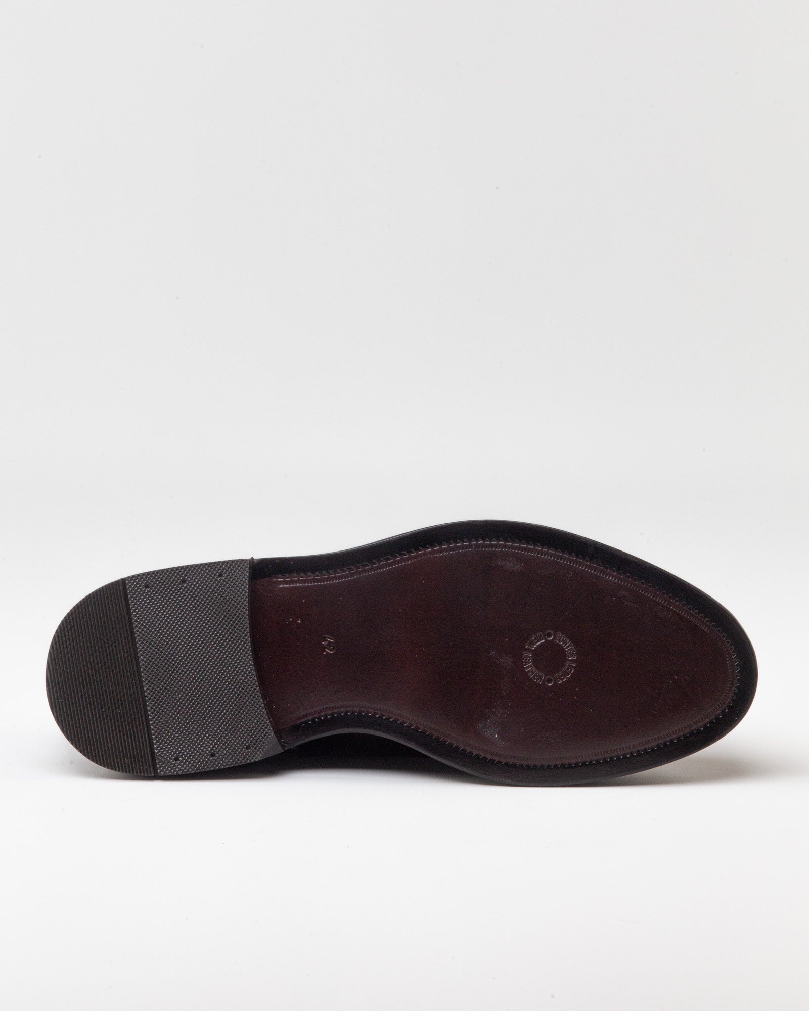Shoe with round toe in brushed leather and leather sole with practical non-slip rubber insert.