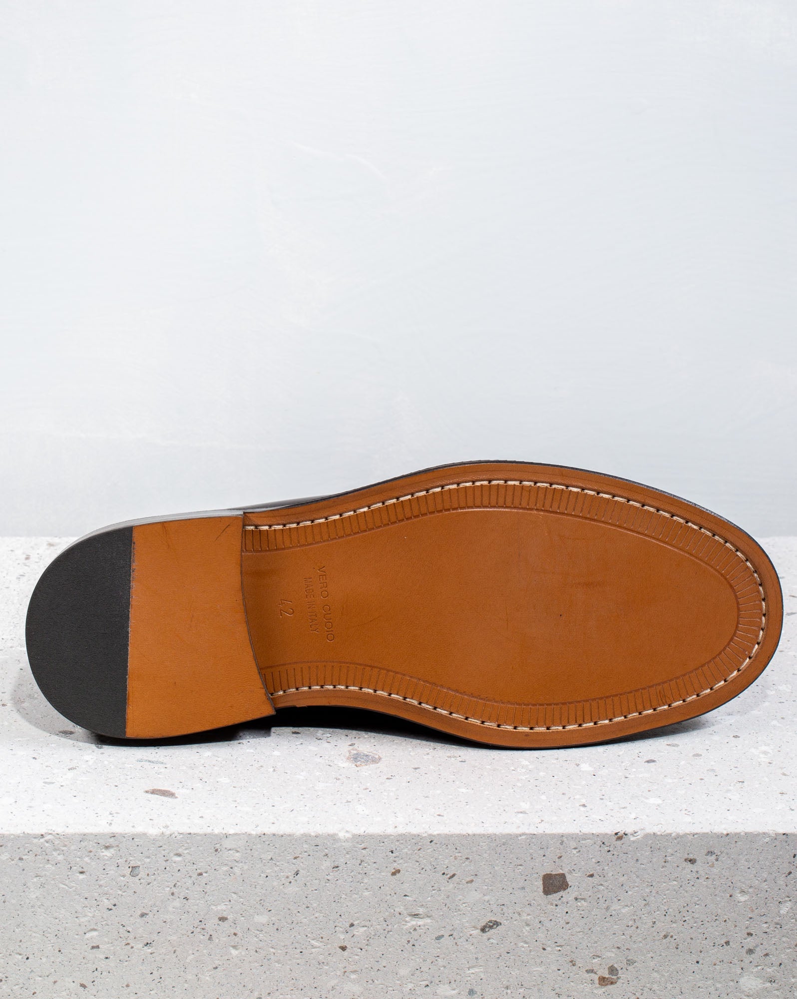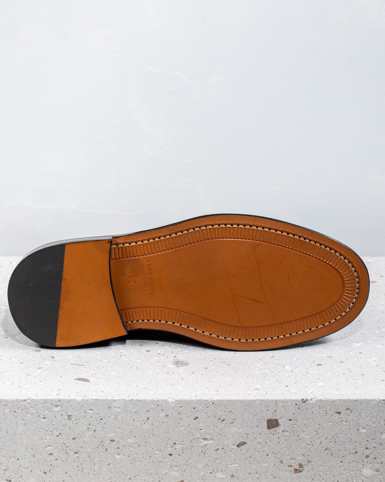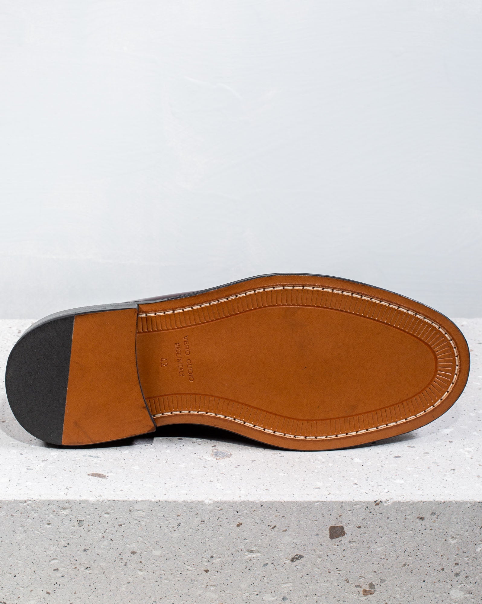 Upper in calfskin with visible stitching and leather sole with a fine and elegant rounded tip.