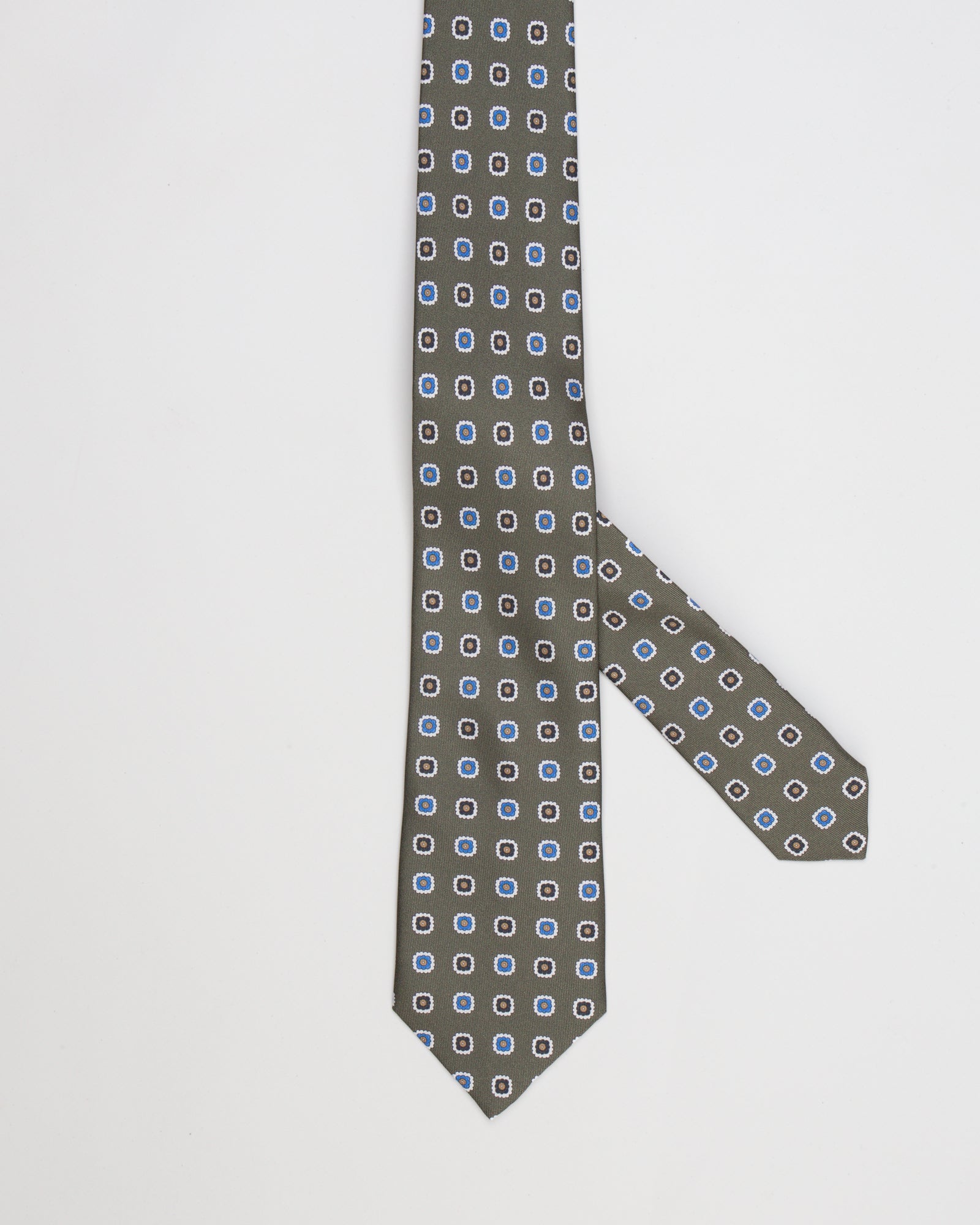 Una microfantasia a motivo geometrico definisce il carattere di questa cravatta Macciocu, pensata per distinguersi con misura. Il fondo verde oliva, sobrio ma distintivo, accoglie una composizione regolare di piccoli motivi a contrasto, per un effetto ordinato e al tempo stesso ricercato. La pala da 7 cm garantisce una silhouette moderna, perfetta per accompagnare giacche dalle linee asciutte.