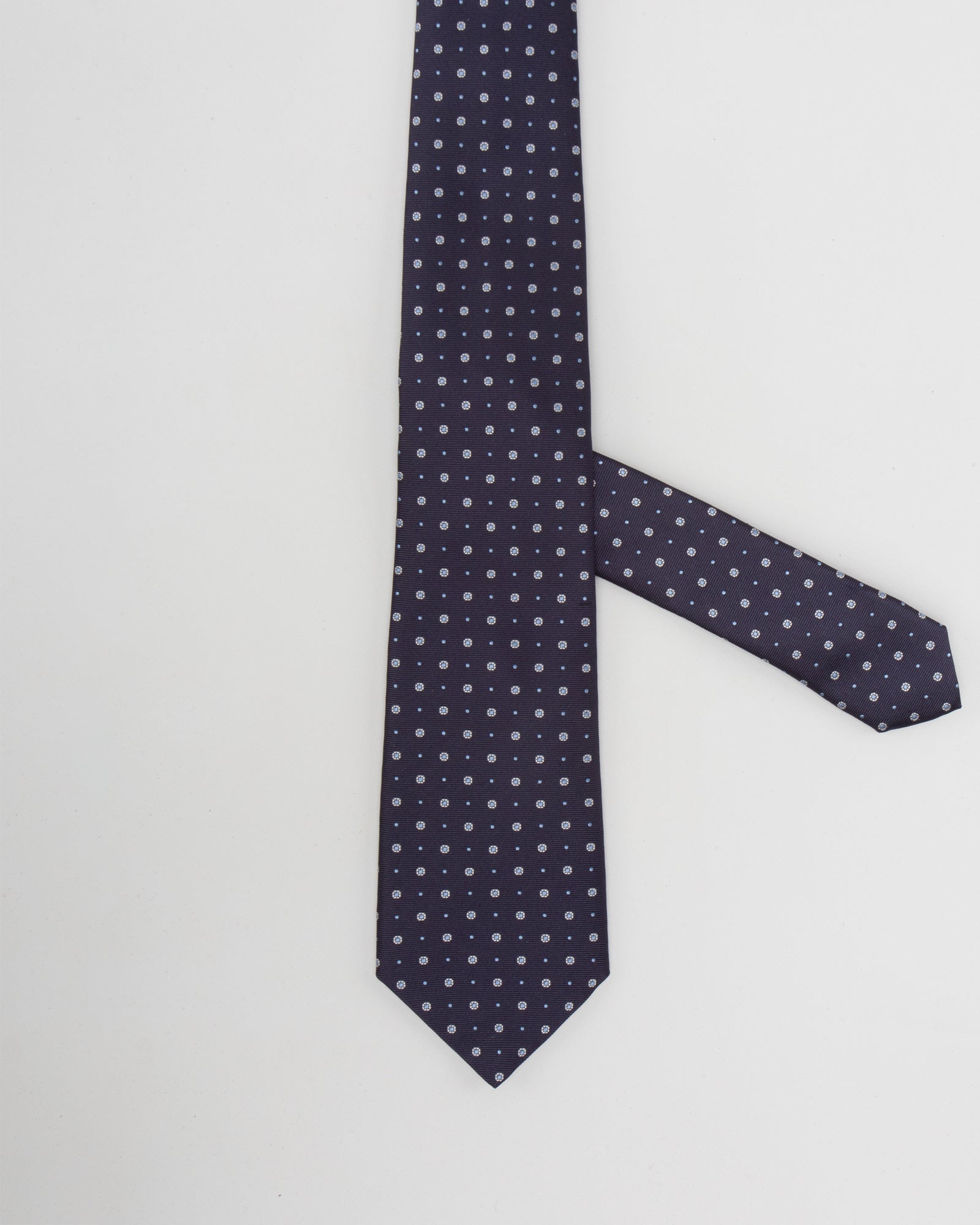 Una raffinata microfantasia a pois bianchi punteggia il fondo scuro di questa cravatta in seta firmata Canali, creando un equilibrio perfetto tra classicità e modernità. Il motivo geometrico si presta a molteplici abbinamenti, sia in contesti business che per occasioni più eleganti, mantenendo sempre uno stile sobrio e sofisticato.