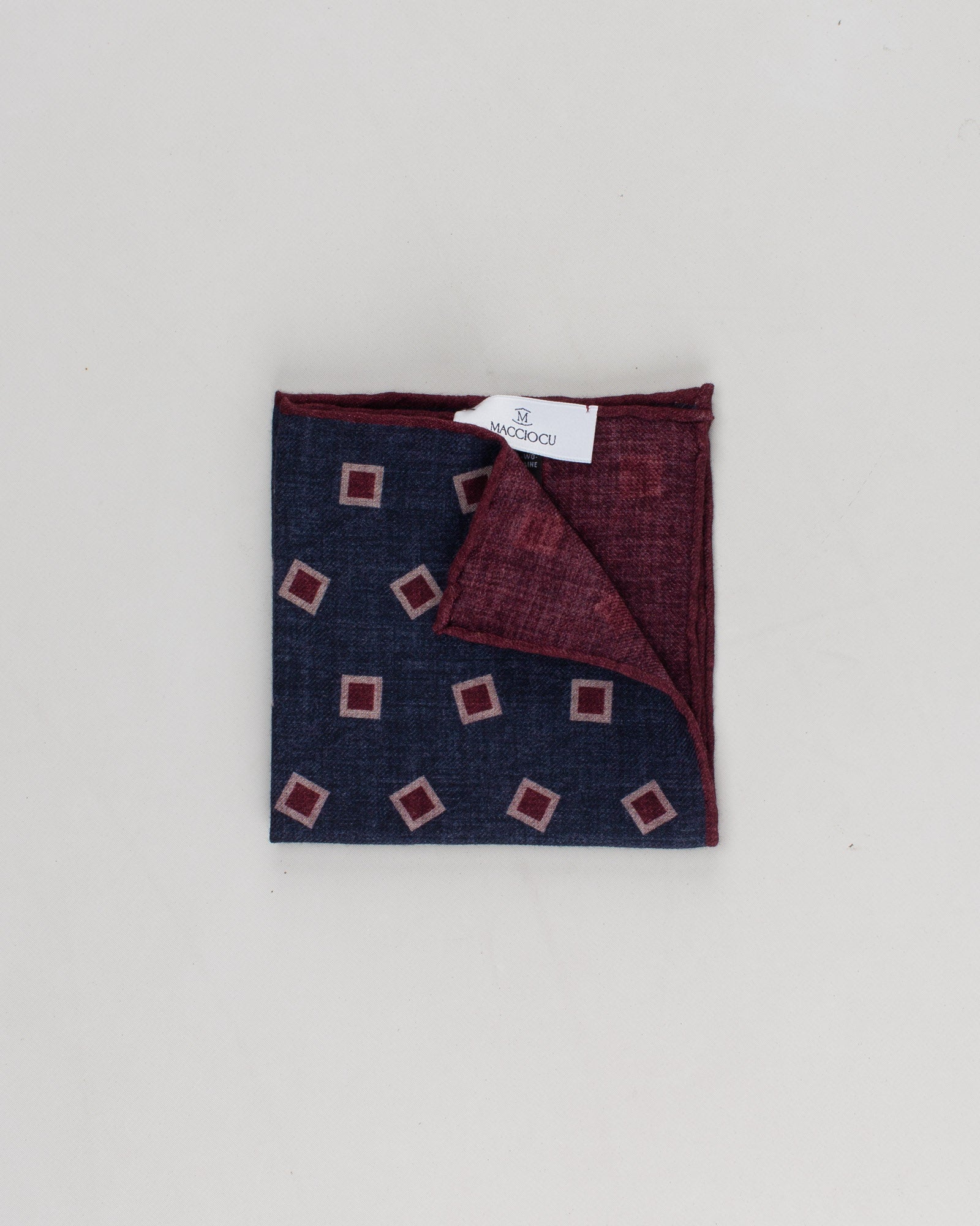 Una fantasia geometrica valorizza questa pochette Macciocu in pura lana vergine, pensata per aggiungere carattere a ogni taschino. Le cuciture a mano e il taglio quadrato la rendono un accessorio versatile e distintivo, perfetto anche ripiegato in modo asimmetrico per rivelare entrambi i lati.
