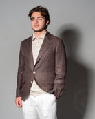 Il pregiato tessuto in diagonale di lino, lana e seta regala una texture materica e sofisticata, arricchita dall’effetto fiammato del lino, che dona profondità cromatica e freschezza. Le tasche a filetto con patta, il taschino sul petto e la ticket pocket esprimono un gusto sartoriale autentico, mentre lo spacco doppio sul retro assicura movimento e comfort.